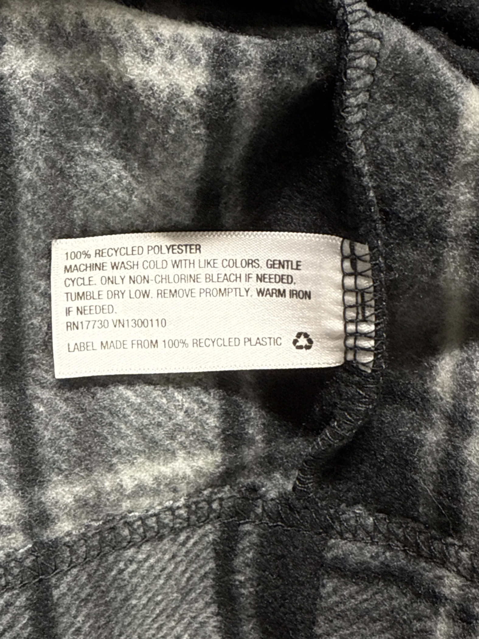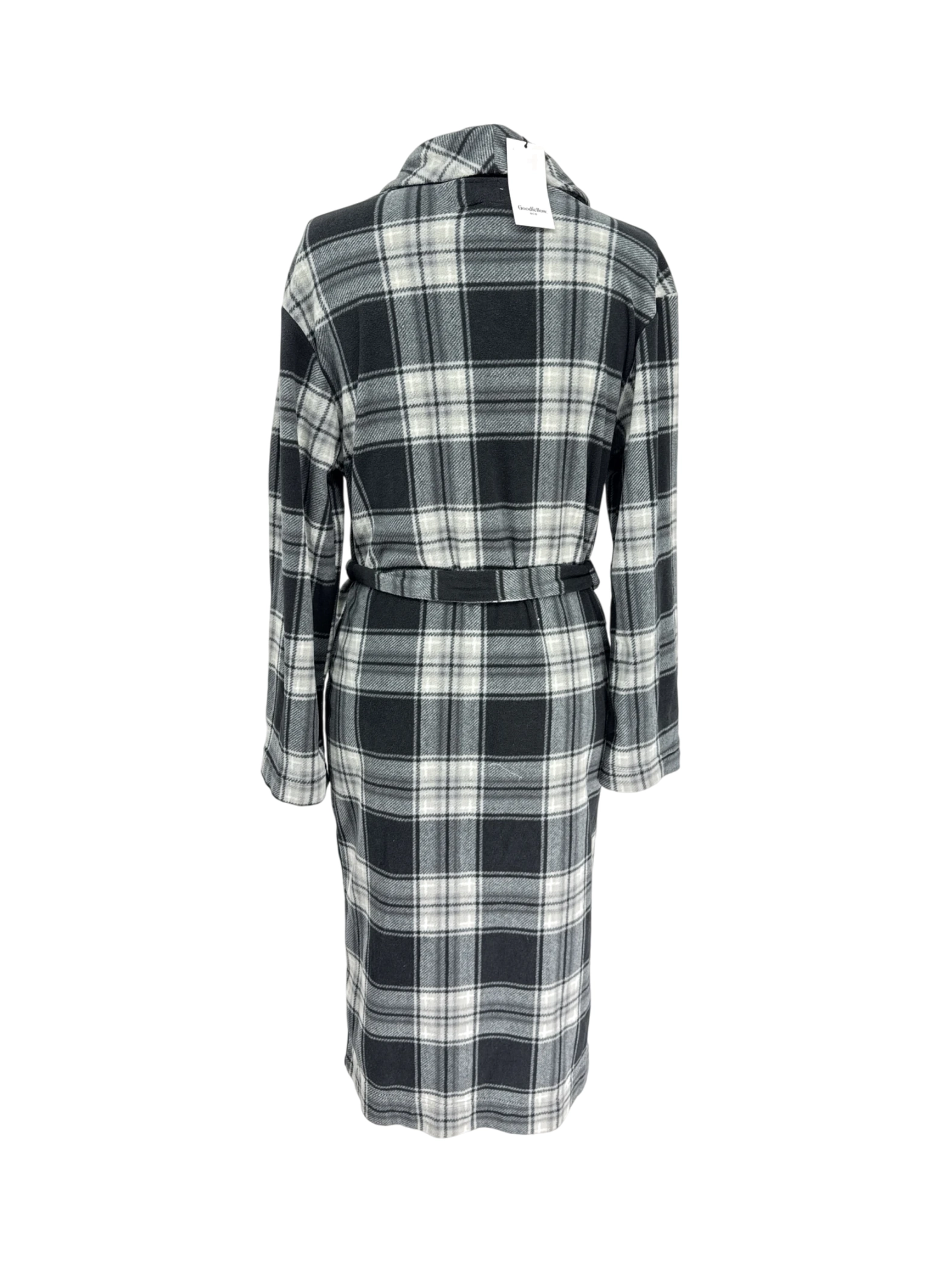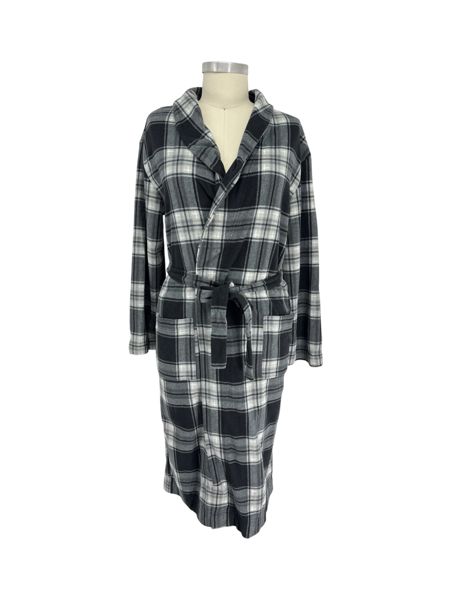 Cozy up in this Goodfellow & Co. robe, perfect for lounging at home. This second-hand robe features a classic plaid pattern in black, white, and gray. Made from soft recycled polyester, it's comfortable and easy to care for. It's a medium-sized robe, offering a relaxed fit. The ideal accessory for a lazy weekend or after a relaxing bath. This robe adds a touch of comfort and style to your everyday routine.