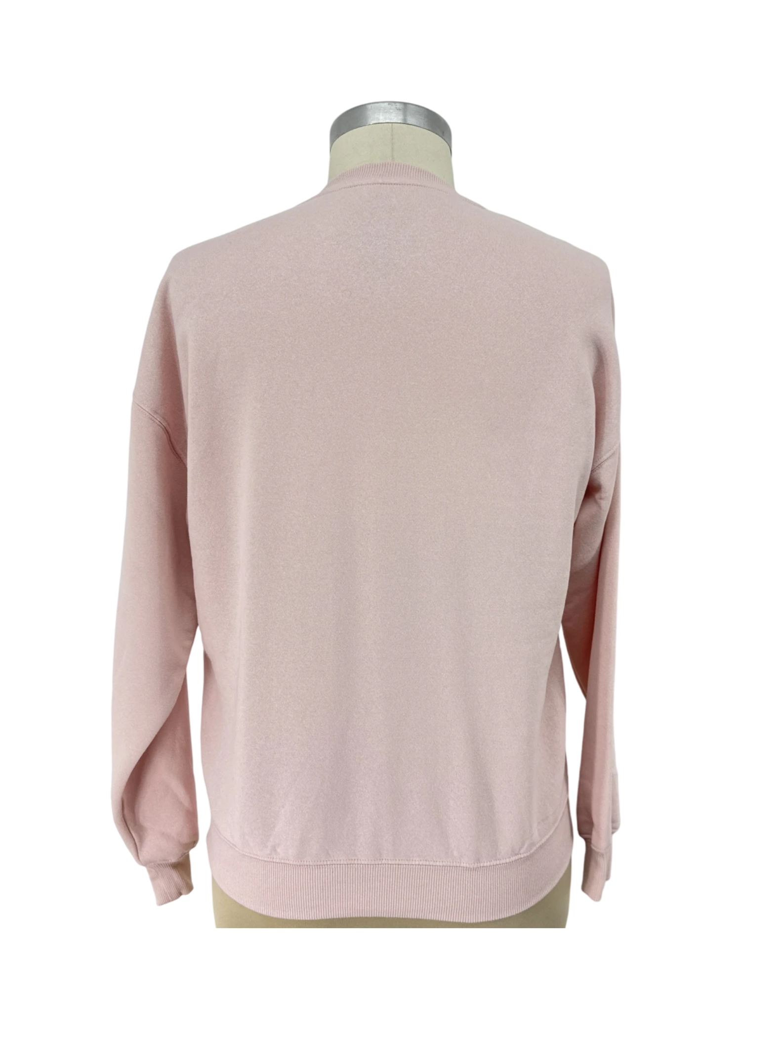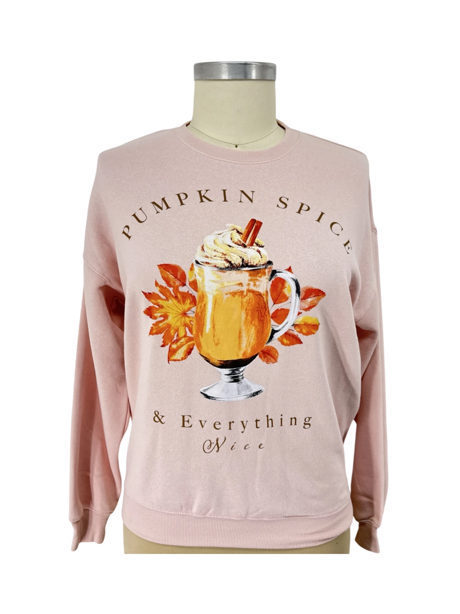 Embrace the cozy vibes of autumn with this pre-owned Goodie Two Sleeves sweater! This charming pullover features a delightful "Pumpkin Spice & Everything Nice" graphic, perfect for fall. Crafted from a comfortable cotton-blend, it's ideal for layering. This women's sweater is in great condition and is a stylish addition to your seasonal wardrobe. The soft pink hue complements the warm graphic. This comfy sweatshirt is a must-have!