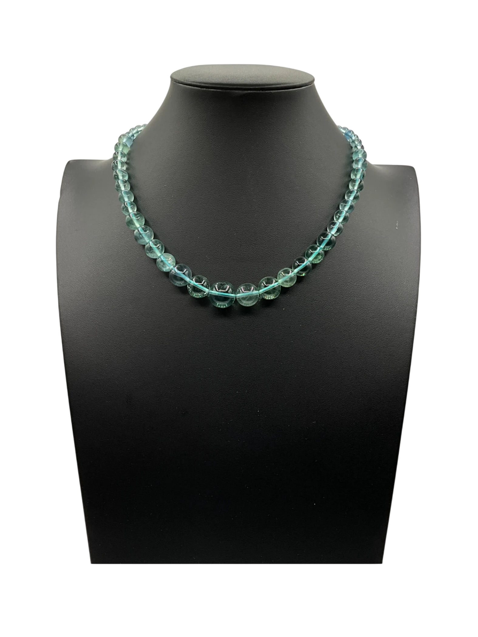 Necklace with transparent green beads and heart closure, 16.5 inches long.