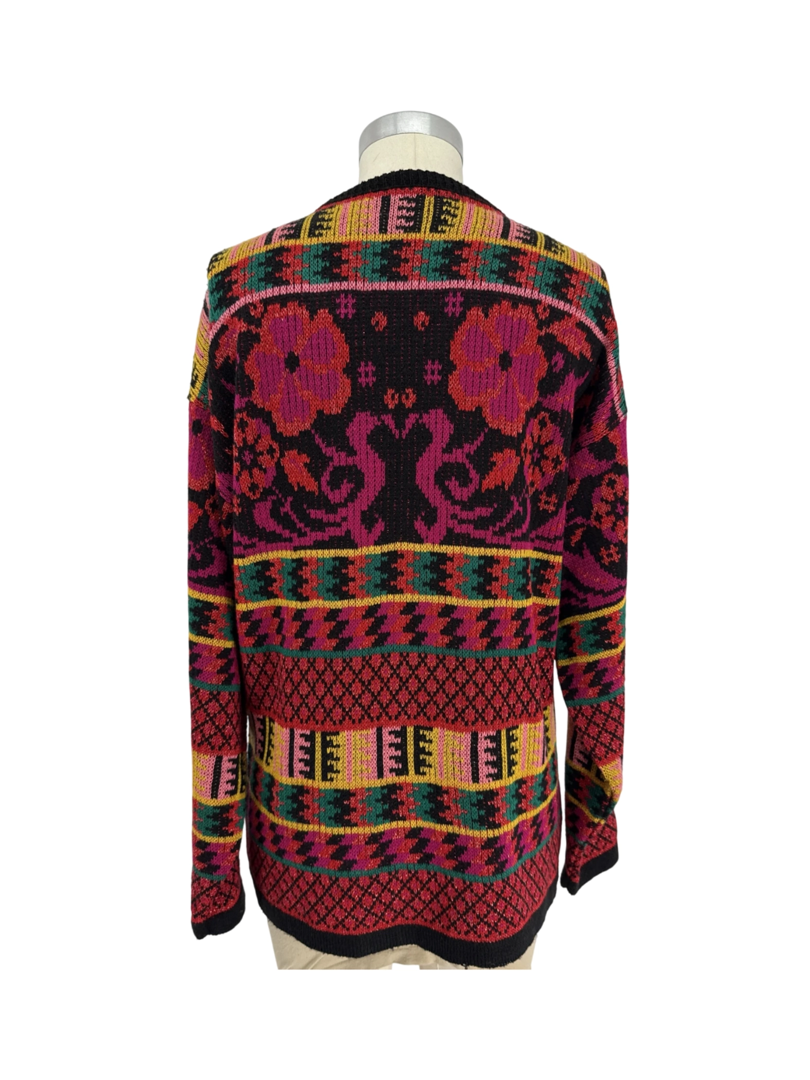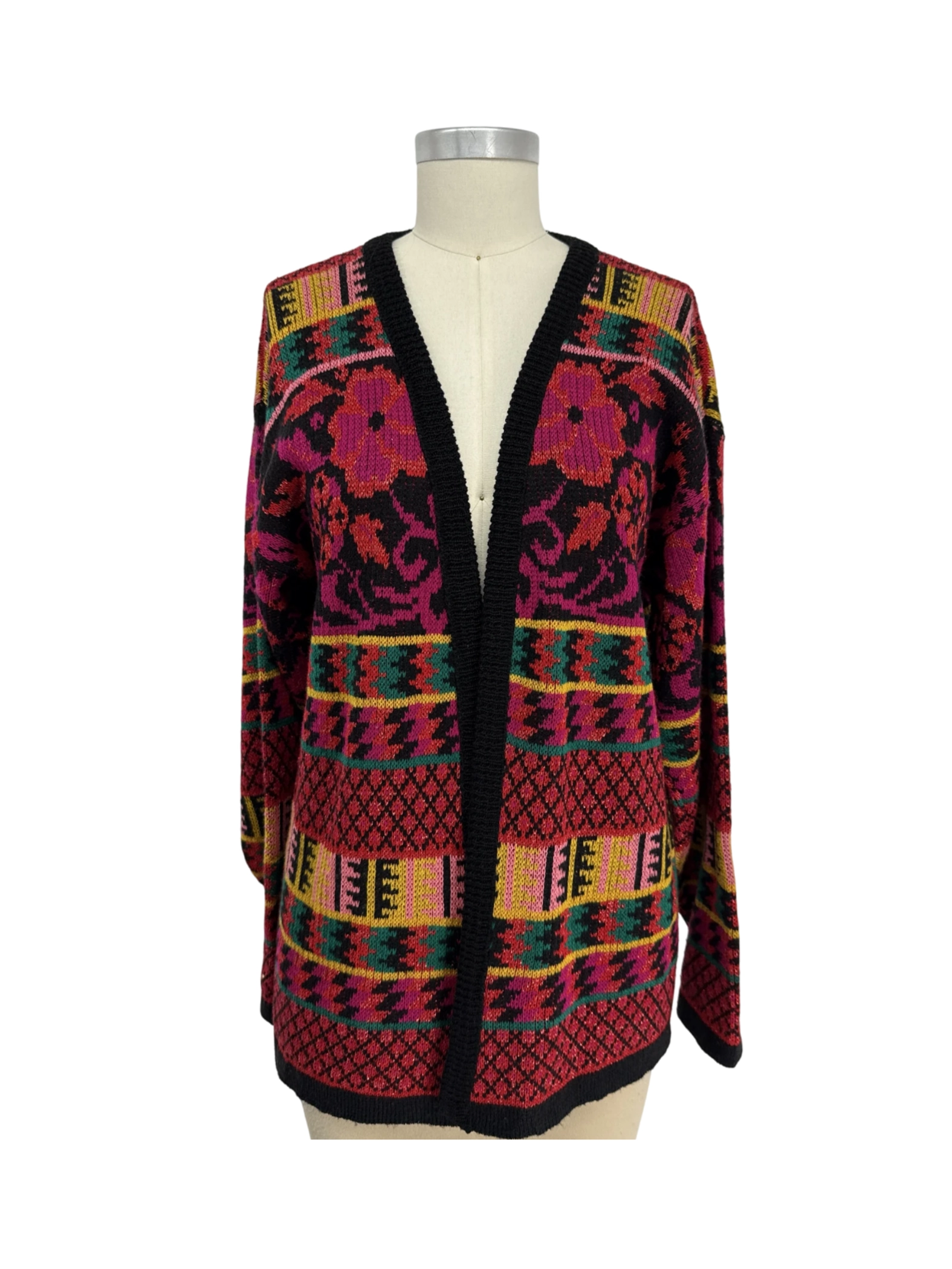 Vintage Gregge Sport sweater featuring a vibrant, eye-catching floral pattern. This unique cardigan showcases a blend of rich colors and intricate designs, making it a standout piece for any wardrobe. The open-front style and comfortable fit offer both style and versatility, perfect for layering during the colder months. A pre-owned gem that adds a touch of retro charm to your collection.