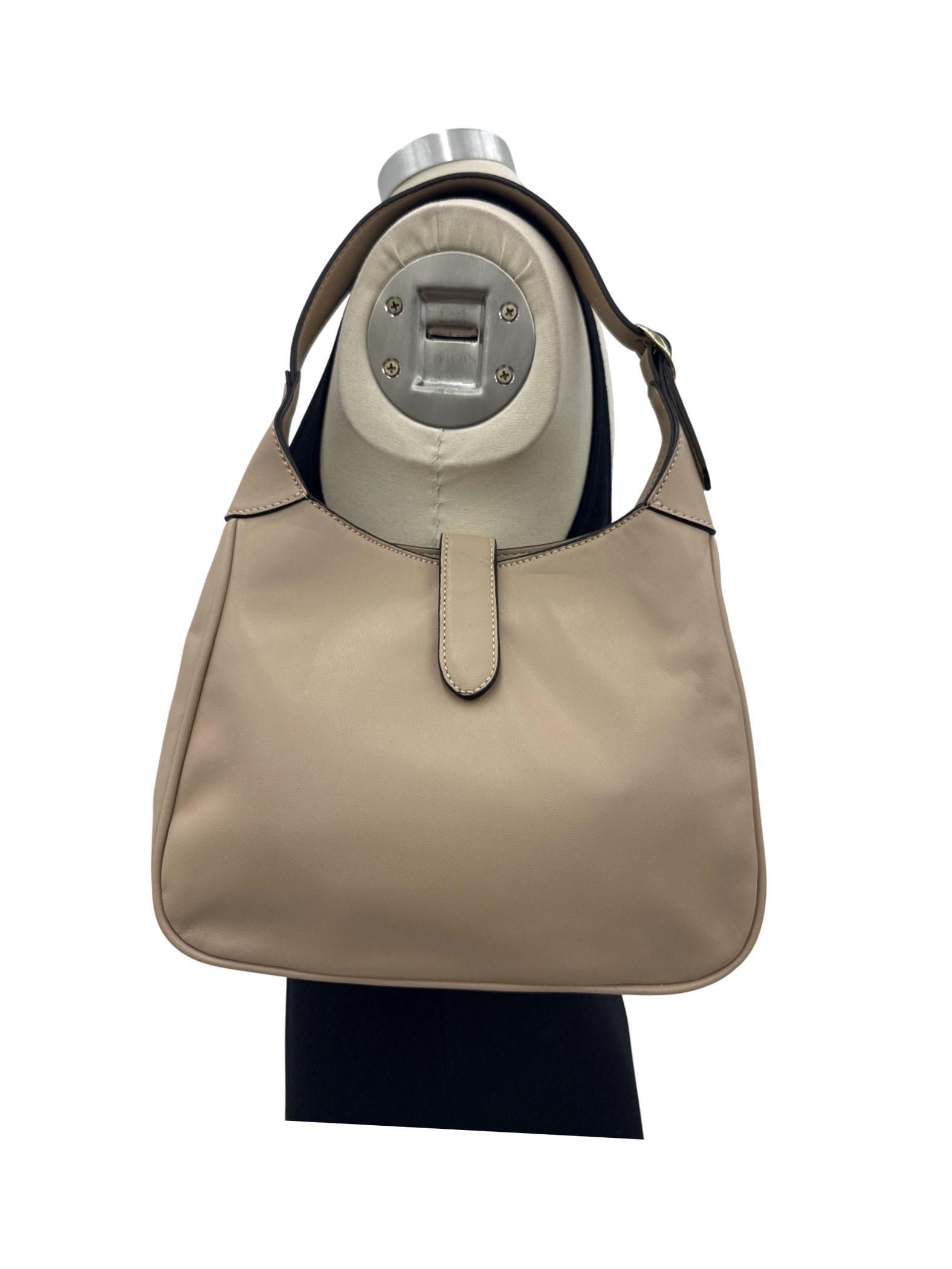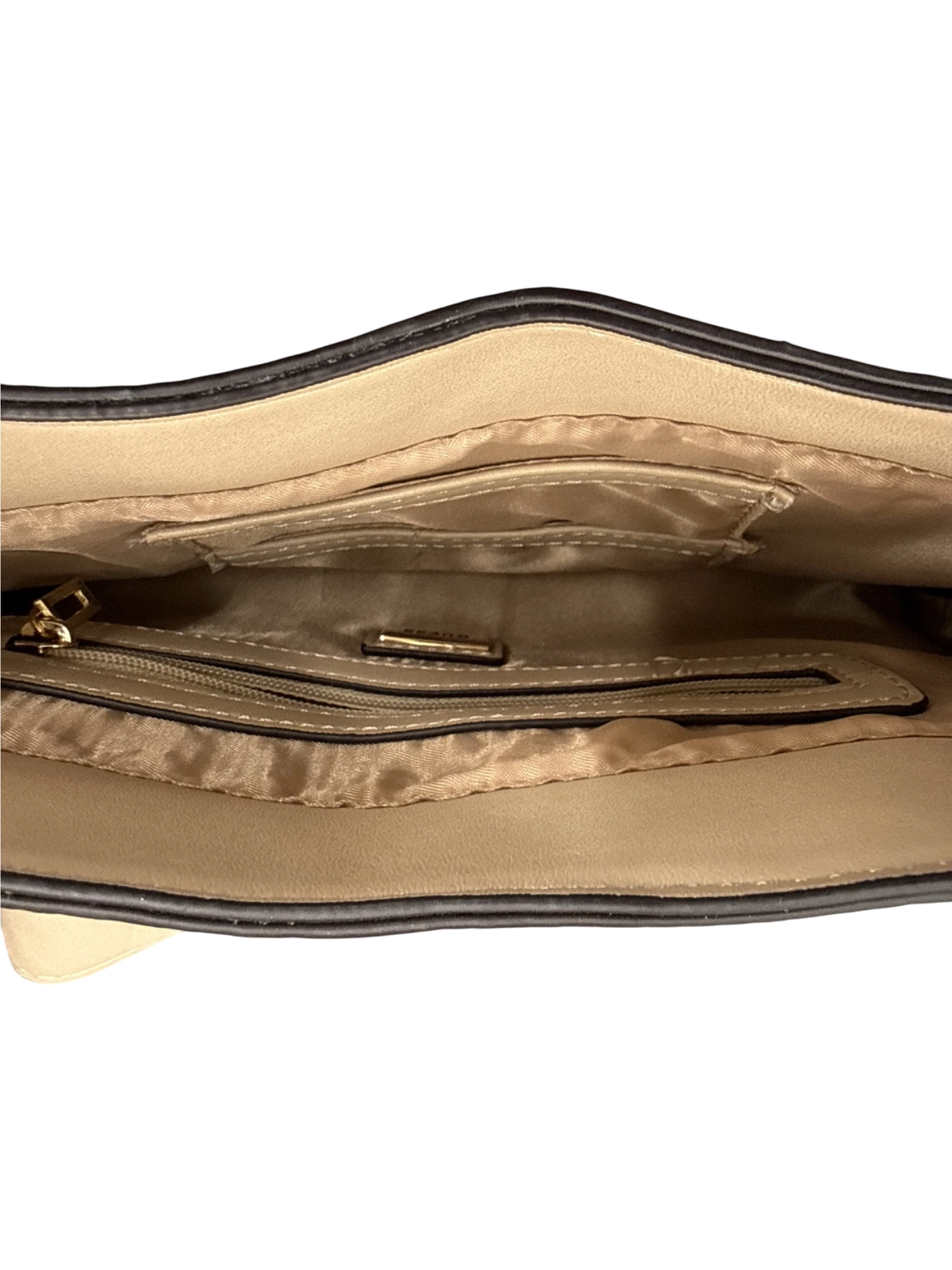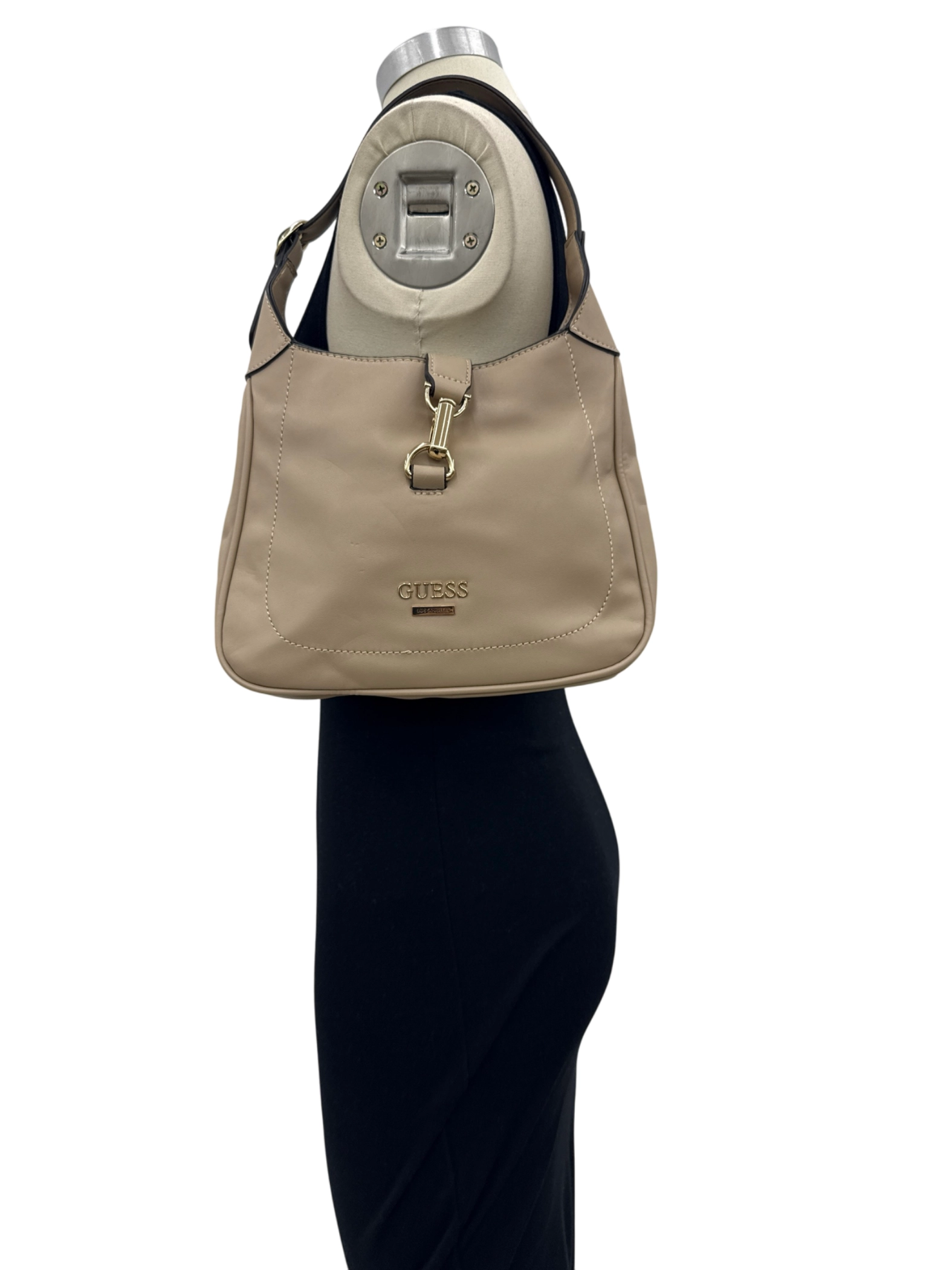 This pre-owned Guess handbag offers a stylish and practical design for everyday use. Crafted from faux leather in a versatile beige color, this shoulder bag features a classic silhouette. The interior features multiple compartments. The bag is perfect for any occasion. It's in good condition and ready to be your next favorite accessory.