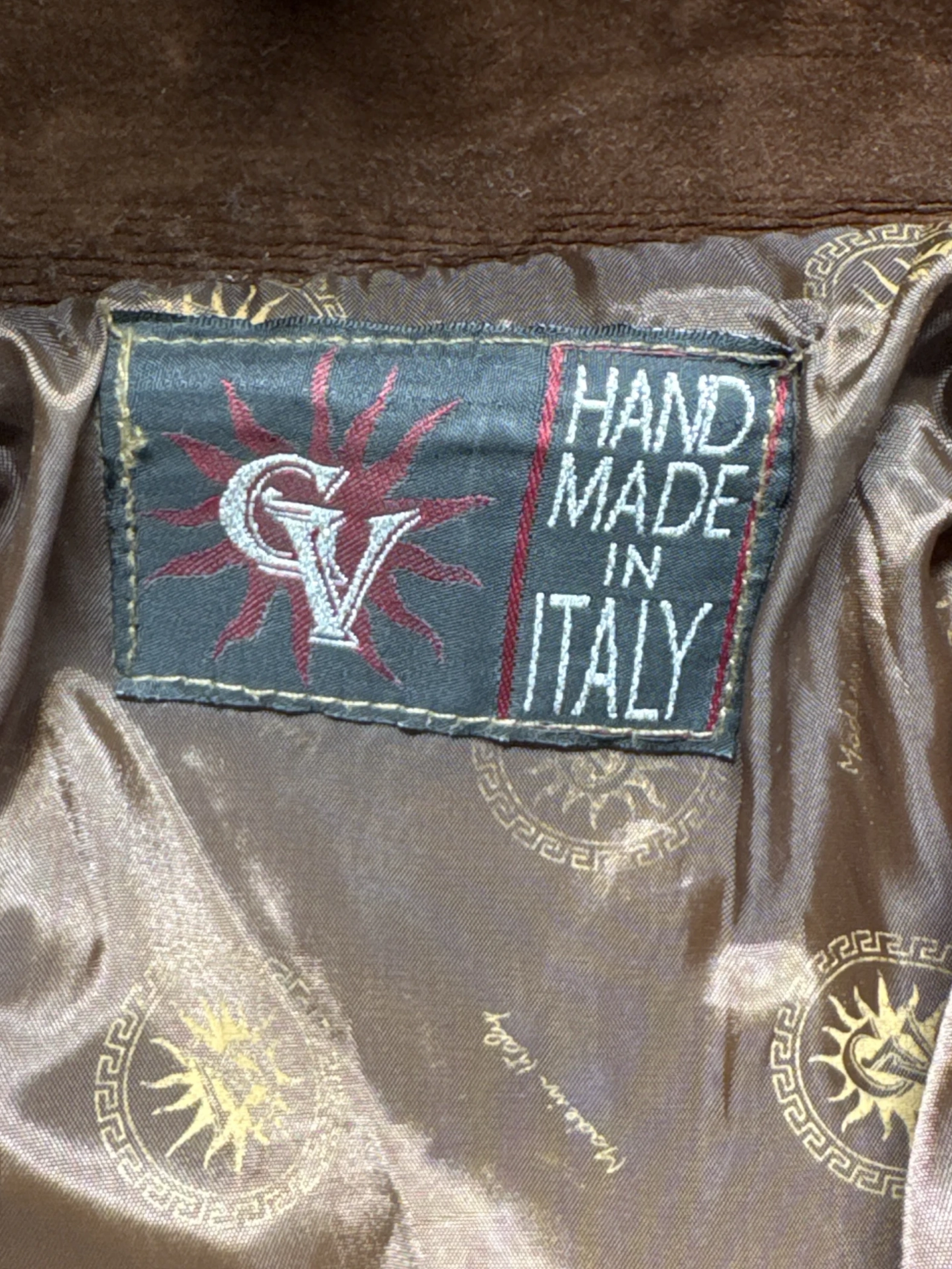This pre-owned GV suede jacket is a stylish and classic piece for any wardrobe. Hand made in Italy, it features a rich brown color, two front pockets, and a comfortable fit. Perfect for fall and winter, this jacket adds a touch of sophistication to any outfit. It is ideal for casual wear or dressing up. A timeless addition to your outerwear collection, combining quality craftsmanship with enduring style.