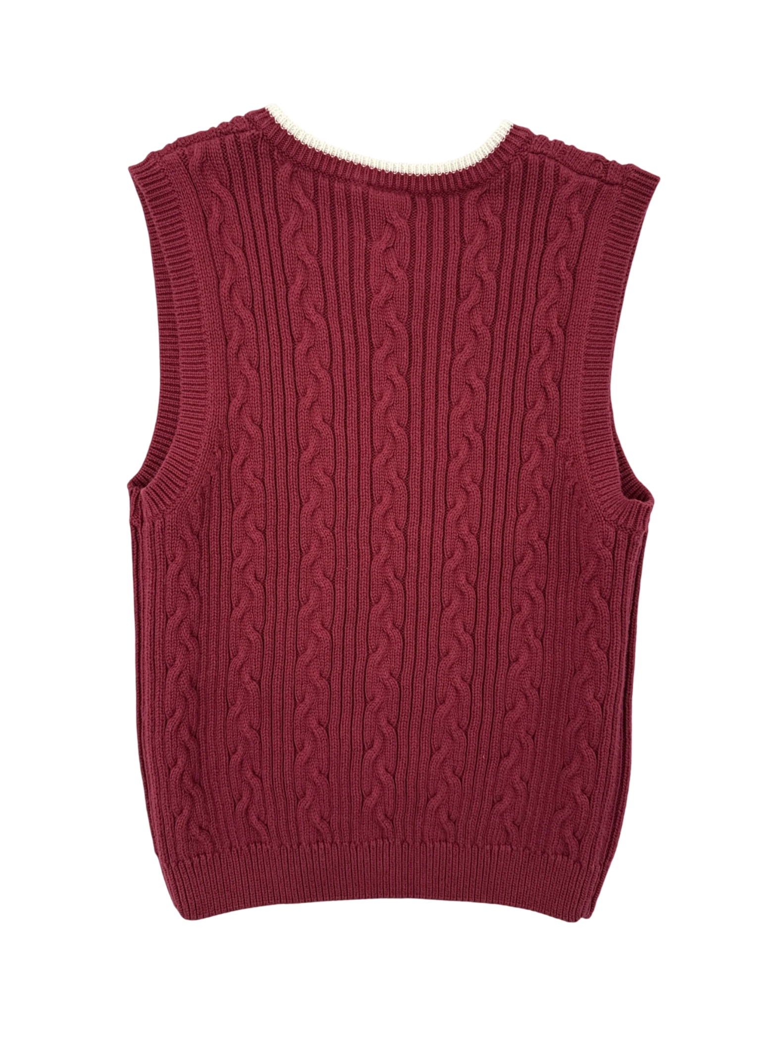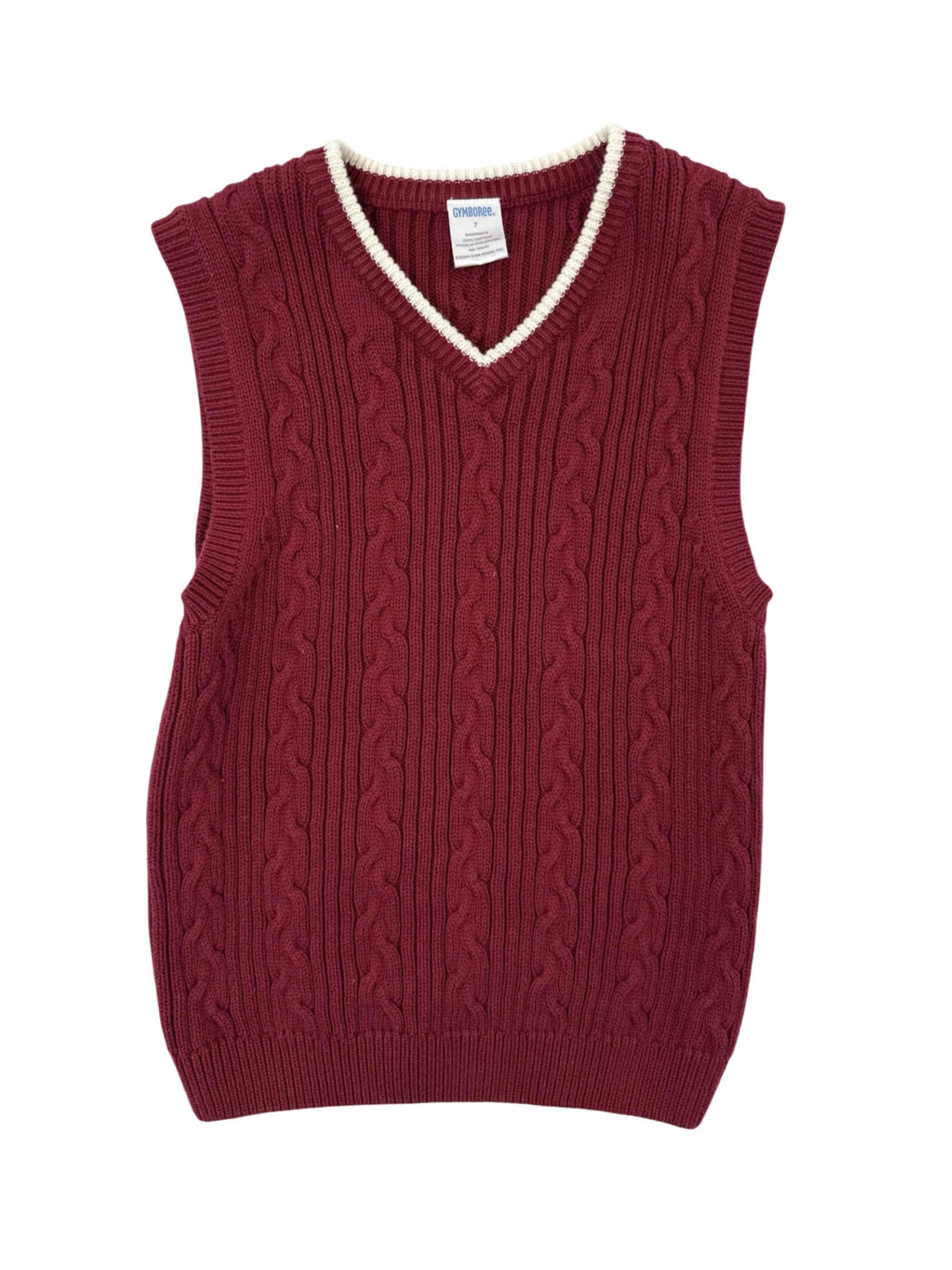 Elevate your boy's wardrobe with this pre-owned Gymboree sweater vest. This stylish maroon vest, featuring a classic cable knit design with a cream trim, is perfect for layering and adding a touch of preppy charm to any outfit. Crafted from 100% cotton, ensuring comfort and durability. This versatile piece is ideal for colder months. A timeless addition to any child's closet.