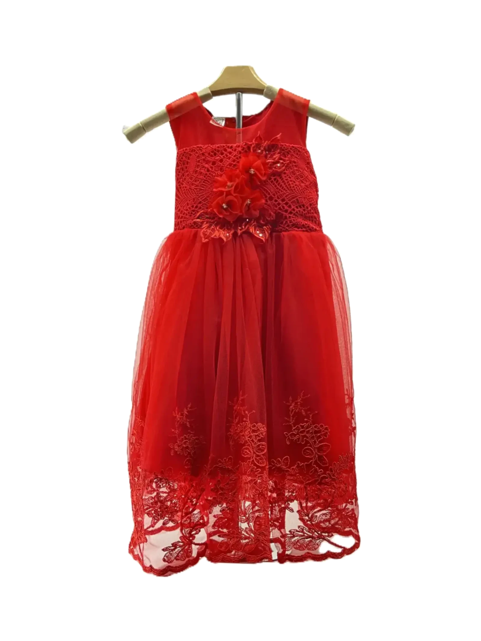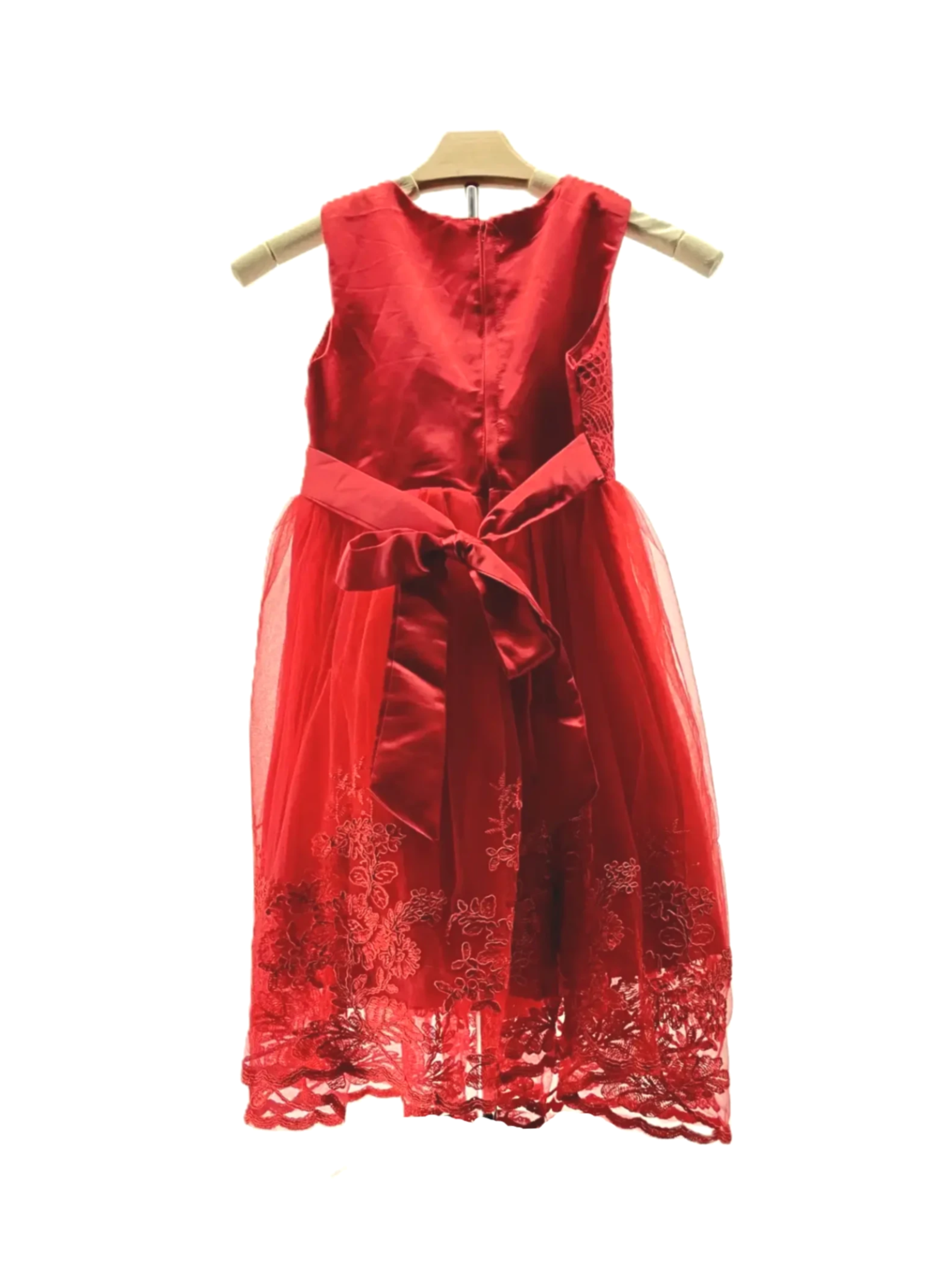 This is a Red flower girl dress sleeves, a lace top, and a tulle skirt - perfect for girls' lace party dress. Girl's Size 9/10.