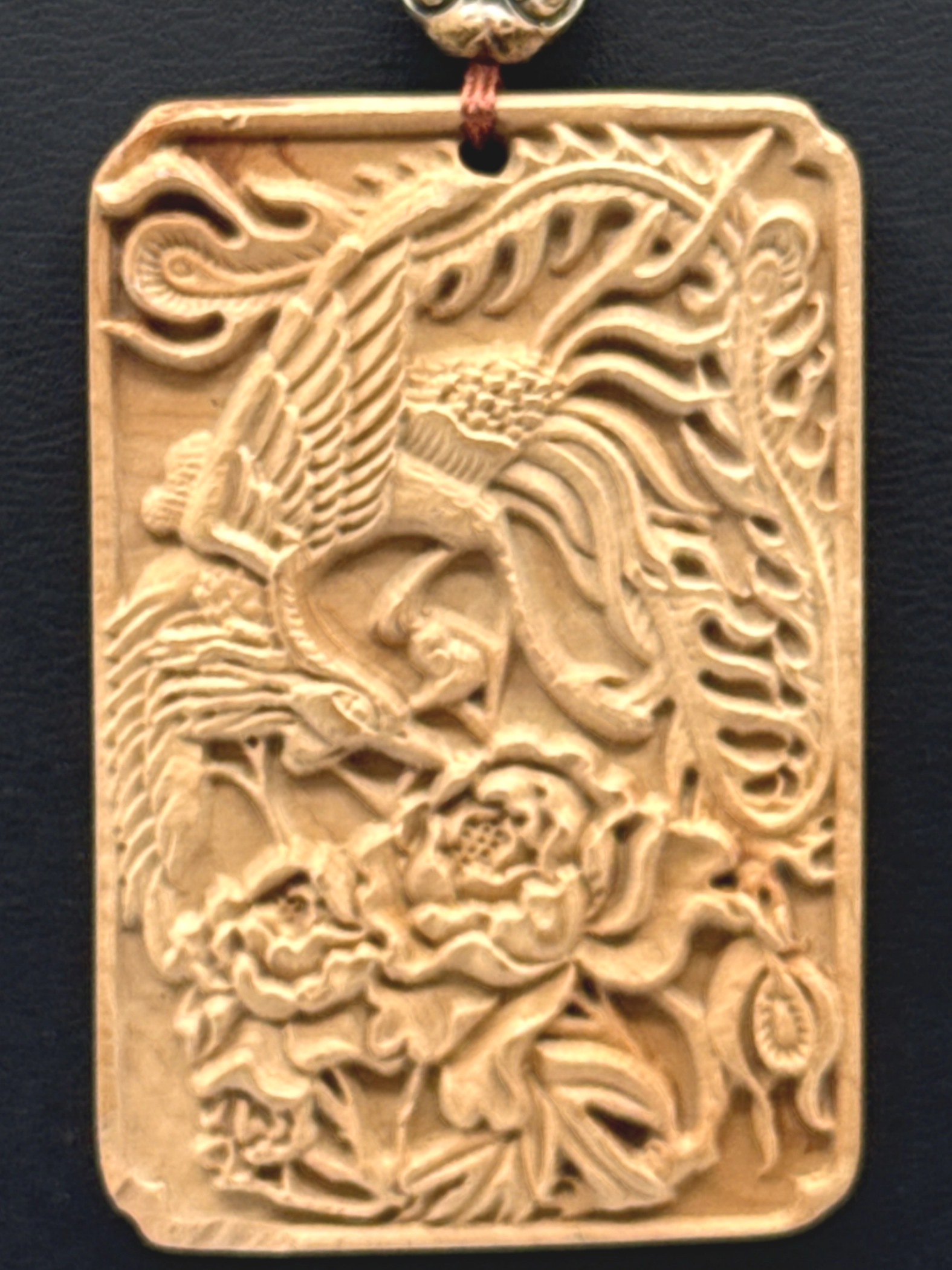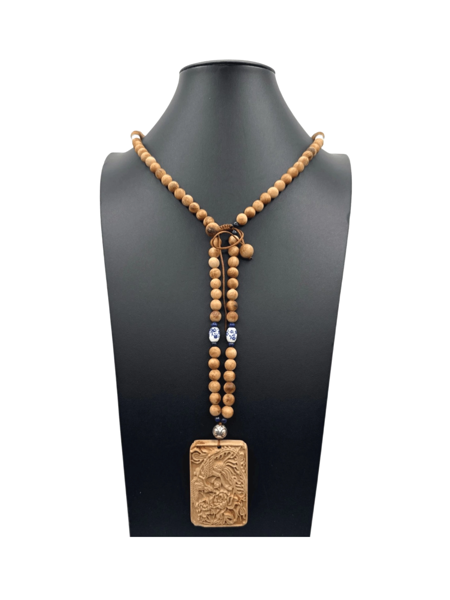 This exquisite handcrafted necklace showcases a unique blend of natural elements and artistic design. Featuring a carved wooden pendant with intricate floral and bird detailing. The necklace is adorned with wooden beads, and ceramic accents with a floral pattern, adding a touch of elegance. Perfect for adding a touch of art to your everyday wear, this pre-owned necklace offers timeless style and a captivating story. It makes a statement piece. Ideal for those who appreciate wearable art with a touch of nature.