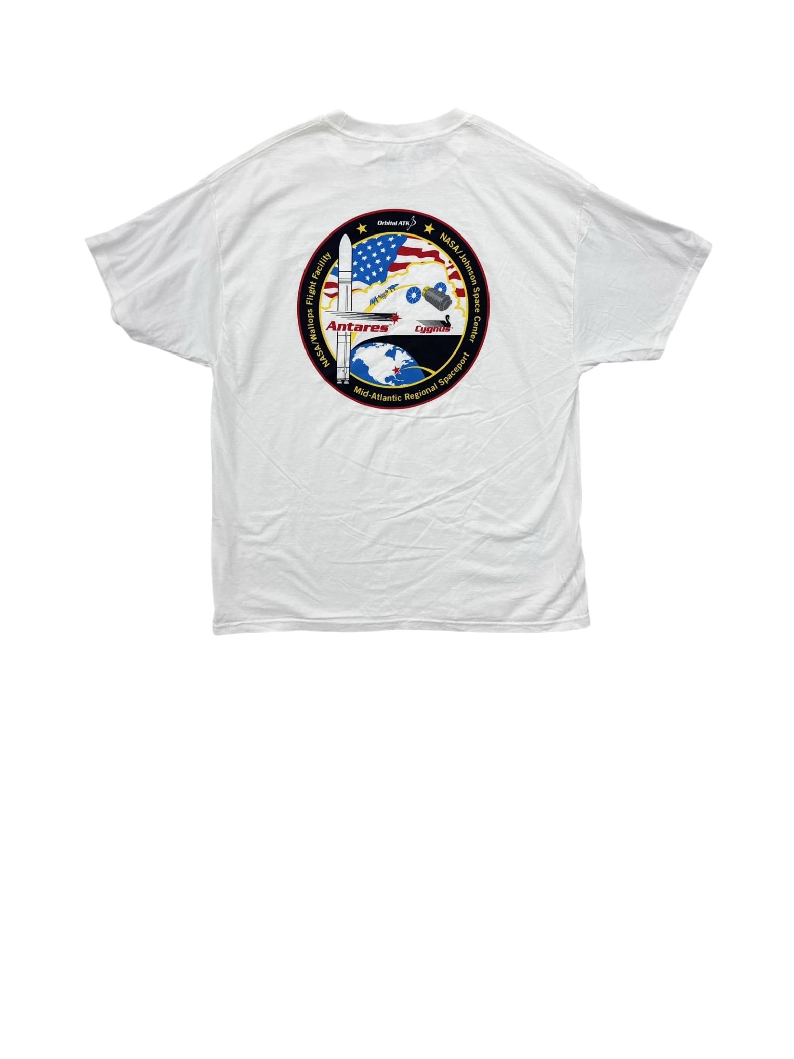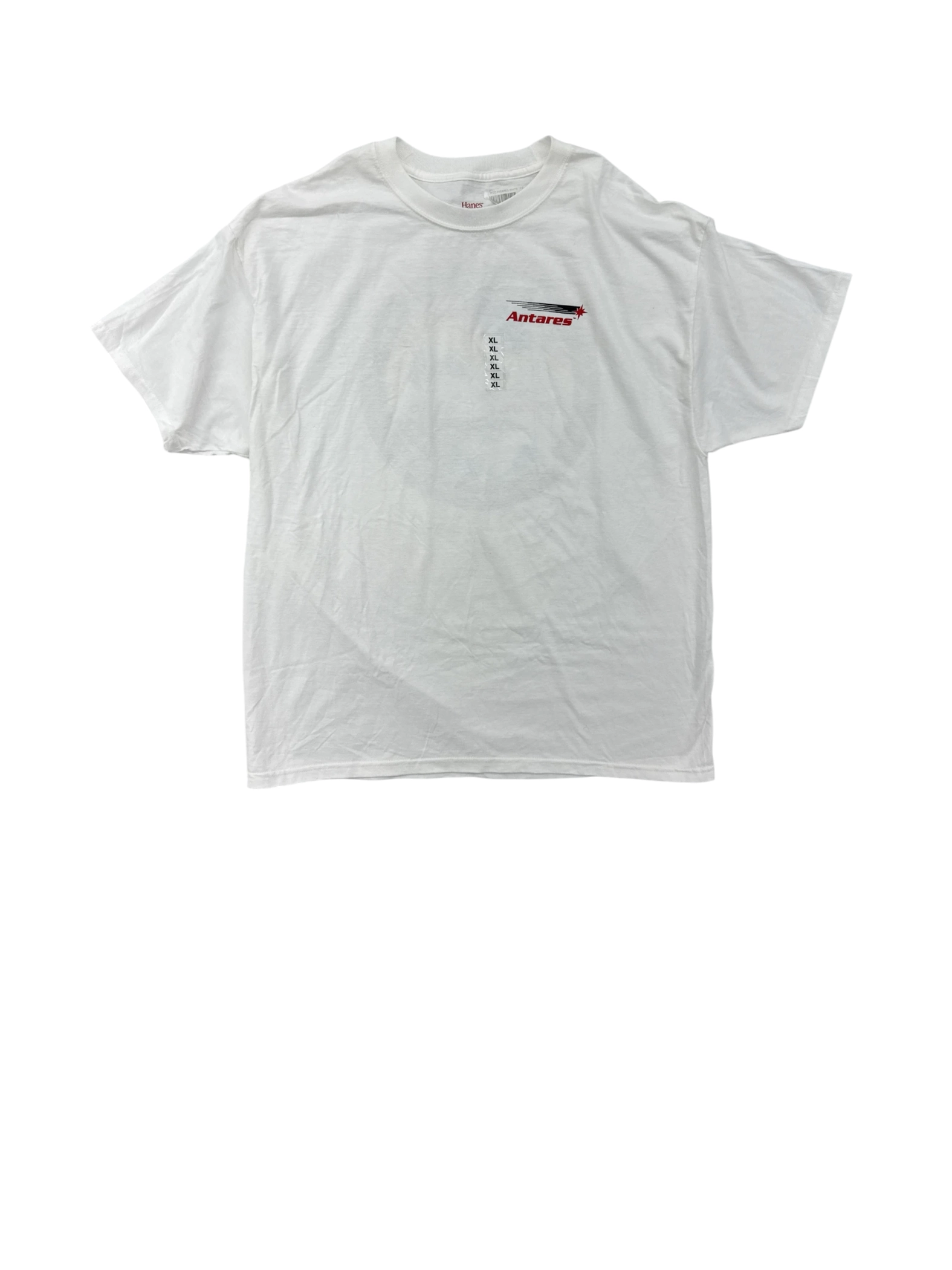 This pre-owned Hanes Beefy-T tank top is a classic addition to any wardrobe. Made from comfortable 100% cotton, this white tee features a round neck and short sleeves, perfect for casual wear. The shirt is adorned with a graphic related to the Antares program and NASA. Available in XL size, this durable and stylish shirt is ideal for everyday wear. Embrace sustainable fashion with this quality, pre-loved piece.