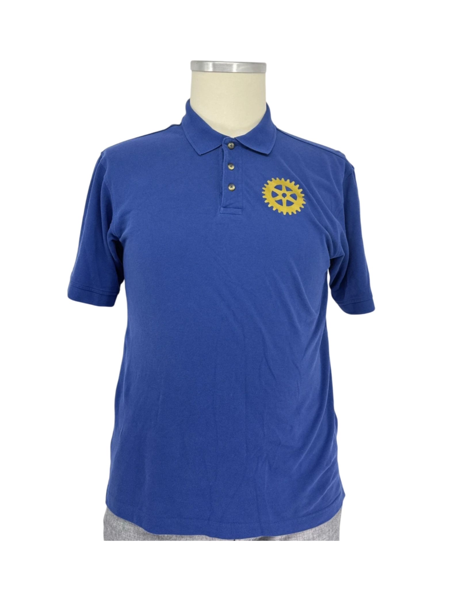 Men's short-sleeved collared shirt in blue and yellow, size large.