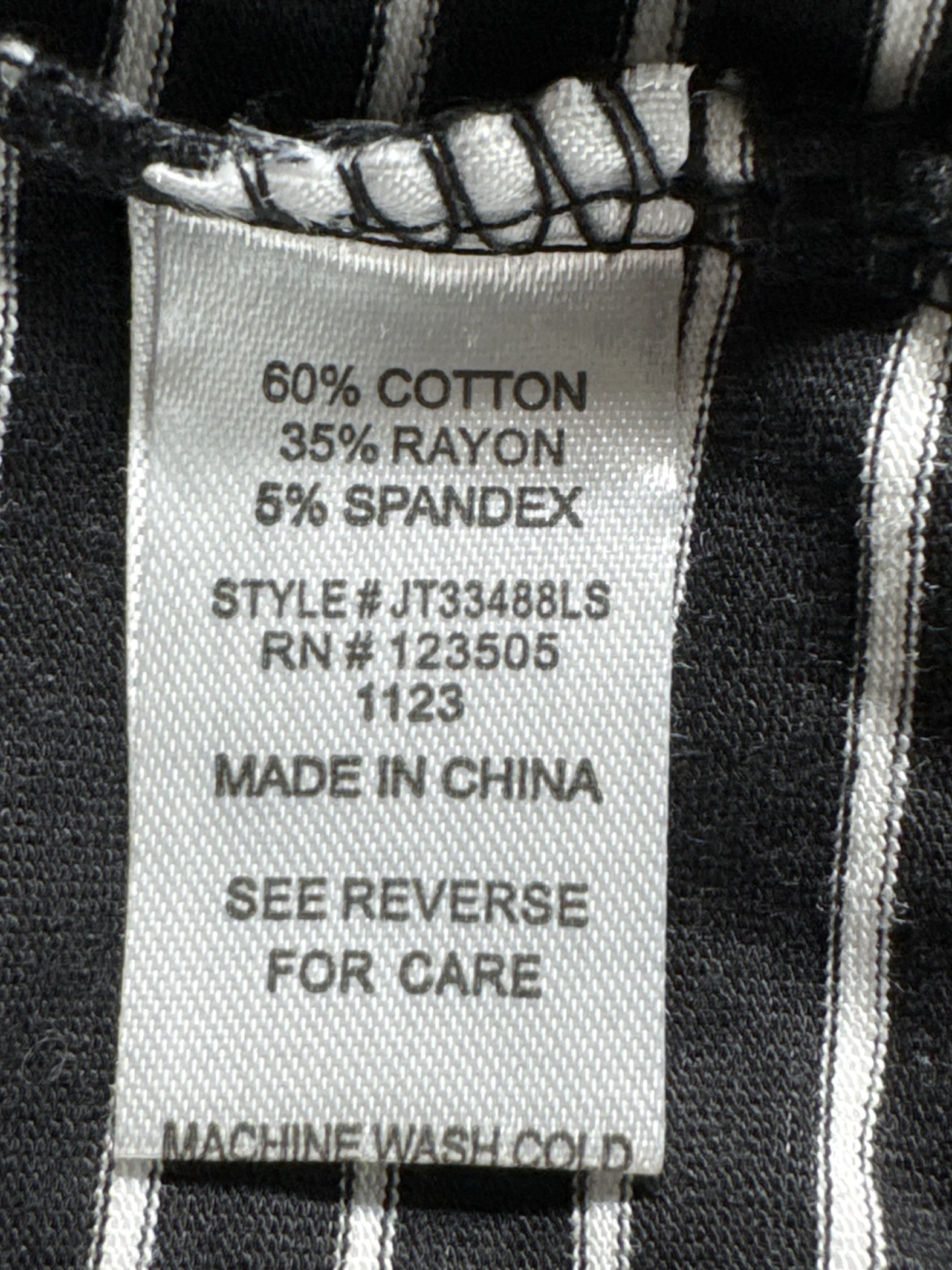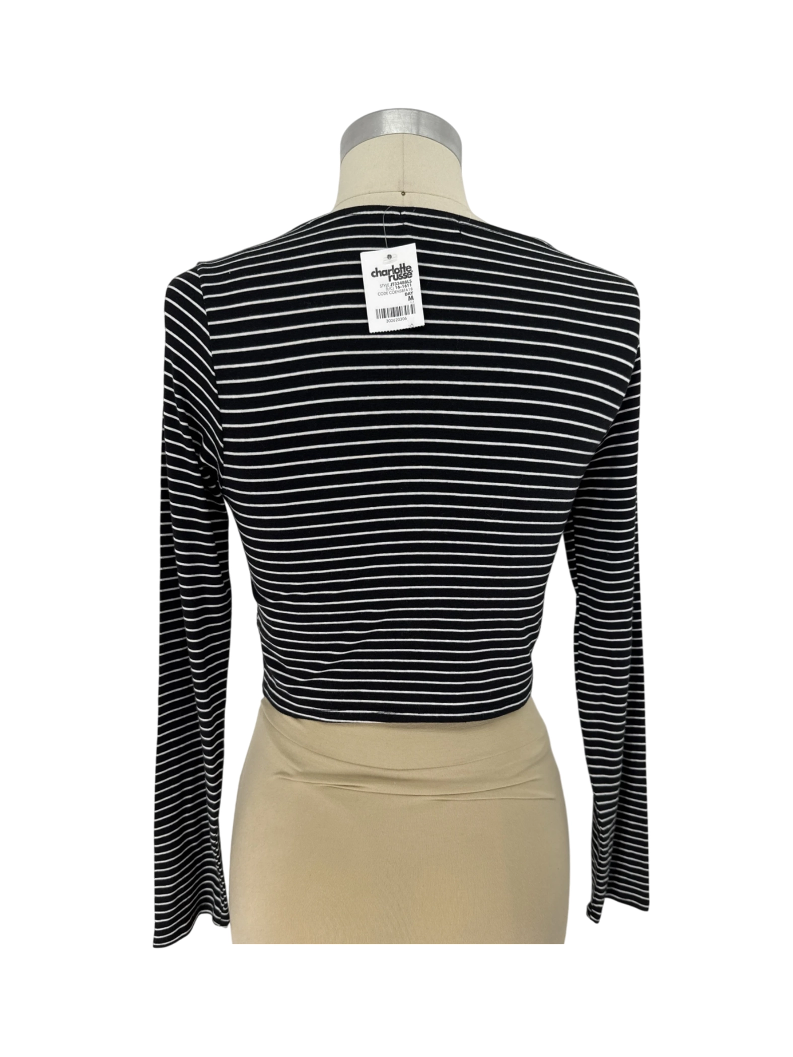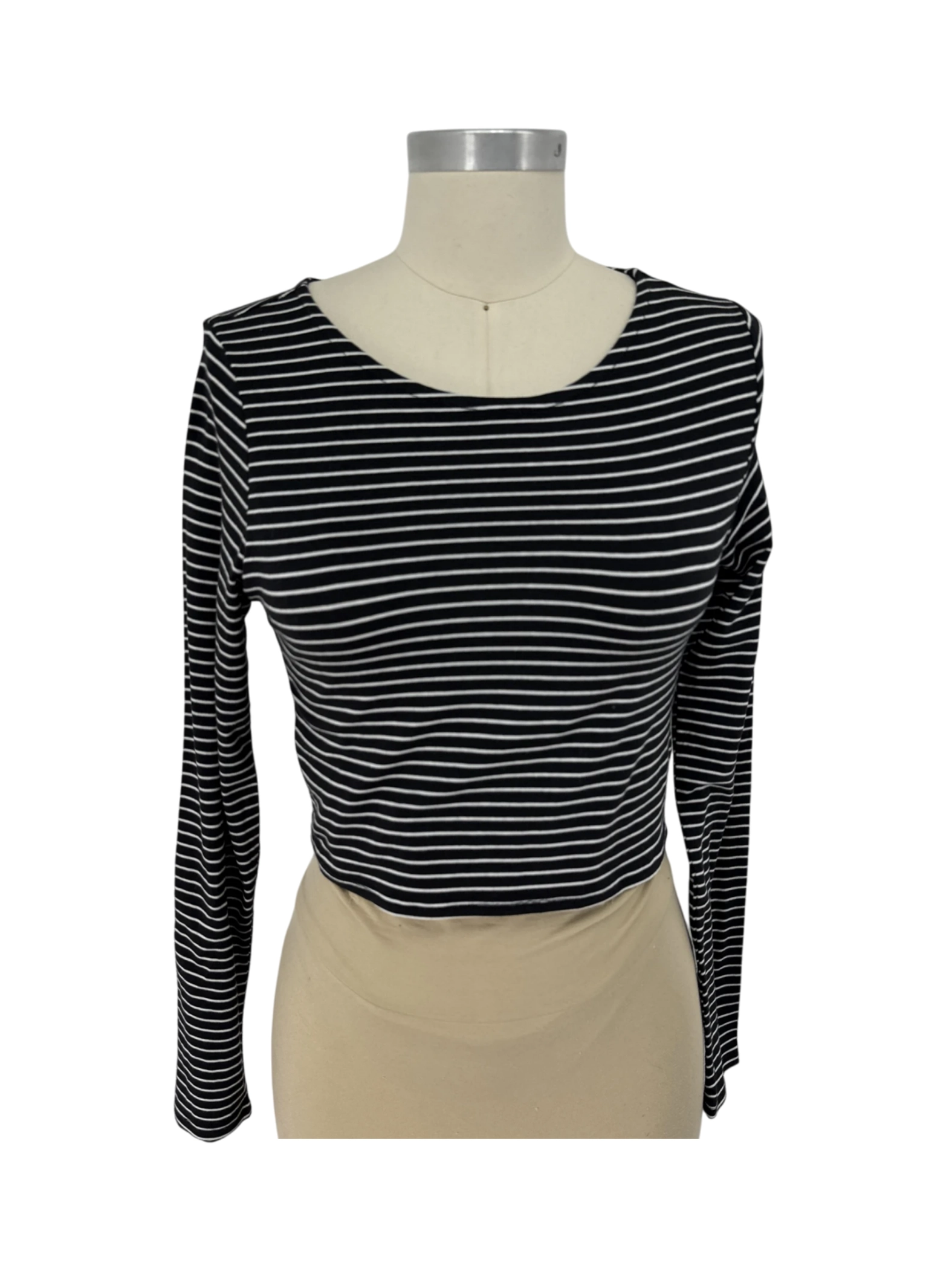 This pre-owned Heart & Hips top is a stylish addition to any wardrobe. Featuring a classic black and white striped pattern, this long-sleeved crop top offers a trendy, versatile look. Made from a comfortable blend of cotton, rayon, and spandex, it's perfect for layering in cooler months. Its cropped design makes it ideal for pairing with high-waisted bottoms. This top offers a balance of comfort and style for everyday wear.