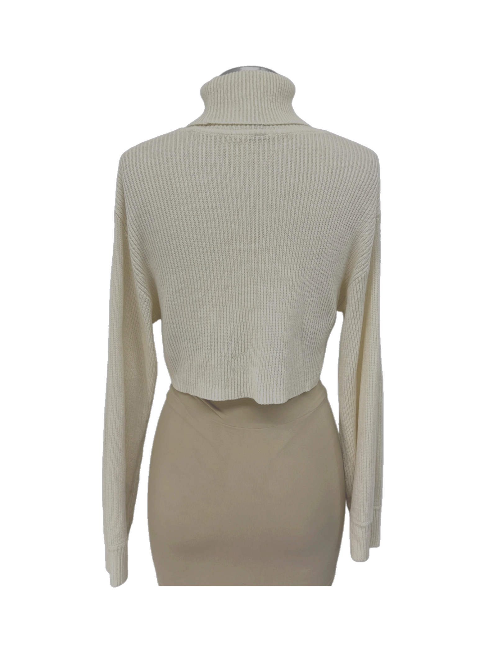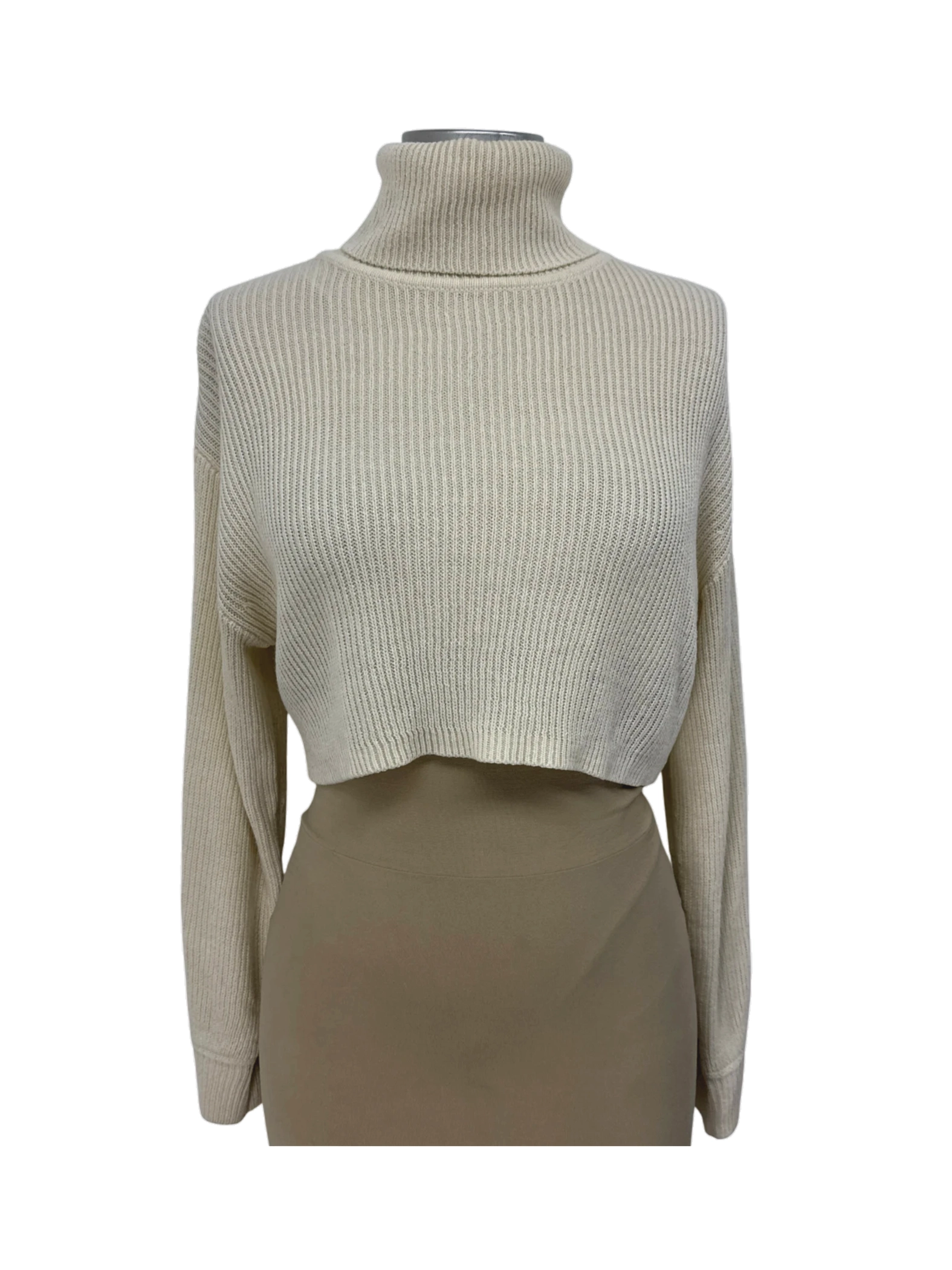 Cropped - Elevate your wardrobe with this chic, pre-owned H&M cropped turtleneck sweater. Crafted from a soft acrylic, this sweater offers a cozy fit and a stylish silhouette. The classic ivory hue and timeless turtleneck design make it a versatile piece for any season. Perfect for pairing with high-waisted jeans or skirts, this sweater adds a touch of elegance to your everyday look. Embrace sustainable fashion and add this pre-loved gem to your collection.