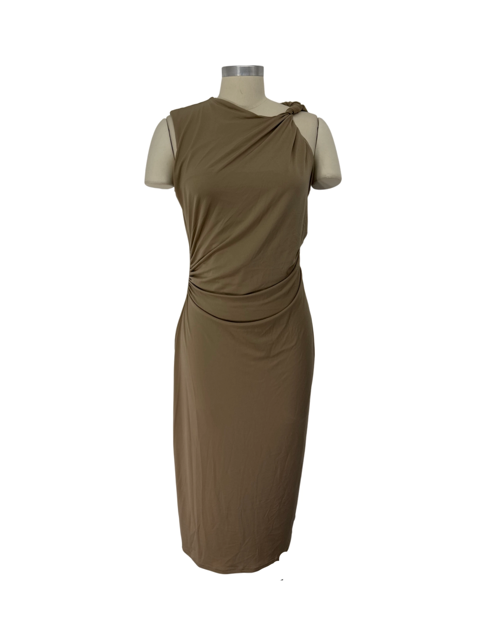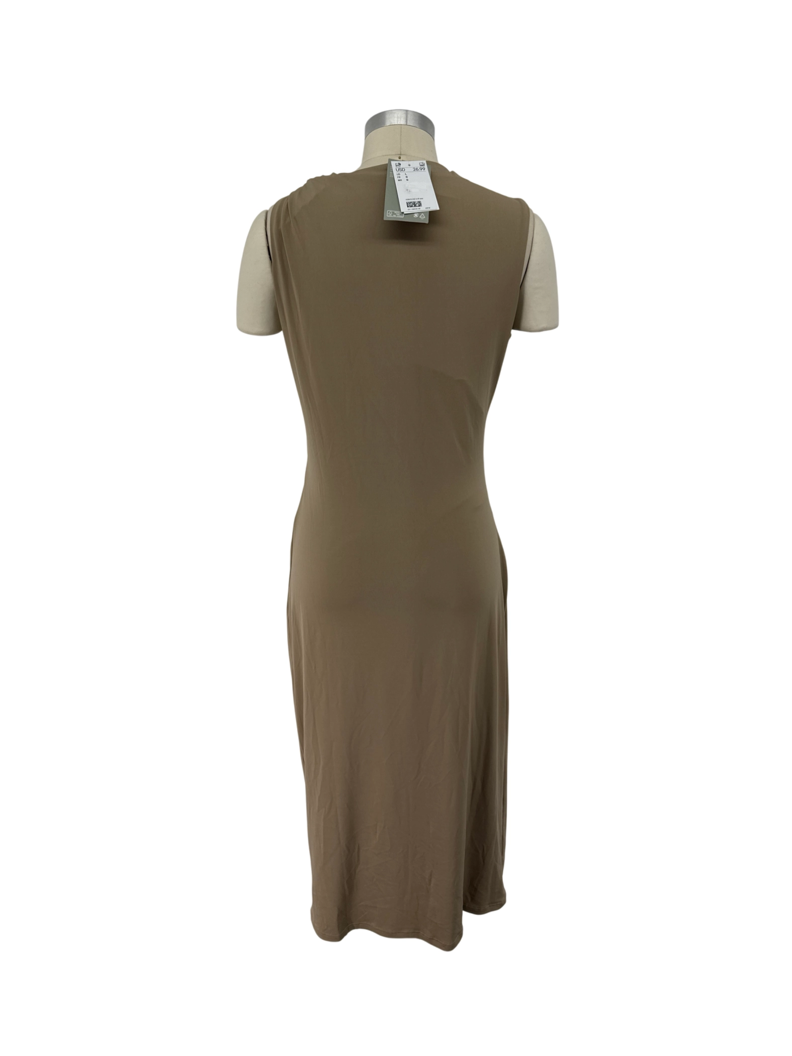 Embrace effortless style with this pre-owned H&M A-line dress in a versatile beige hue, perfect for warm weather. Crafted from a blend of recycled polyester and elastane, this midi dress offers a flattering fit and comfortable feel. Featuring a classic round neck and sleeveless design, it's an ideal choice for casual outings or summer events. Its eco-conscious construction adds a touch of sustainability to your wardrobe. Shop sustainable fashion with this stylish and eco-friendly find.