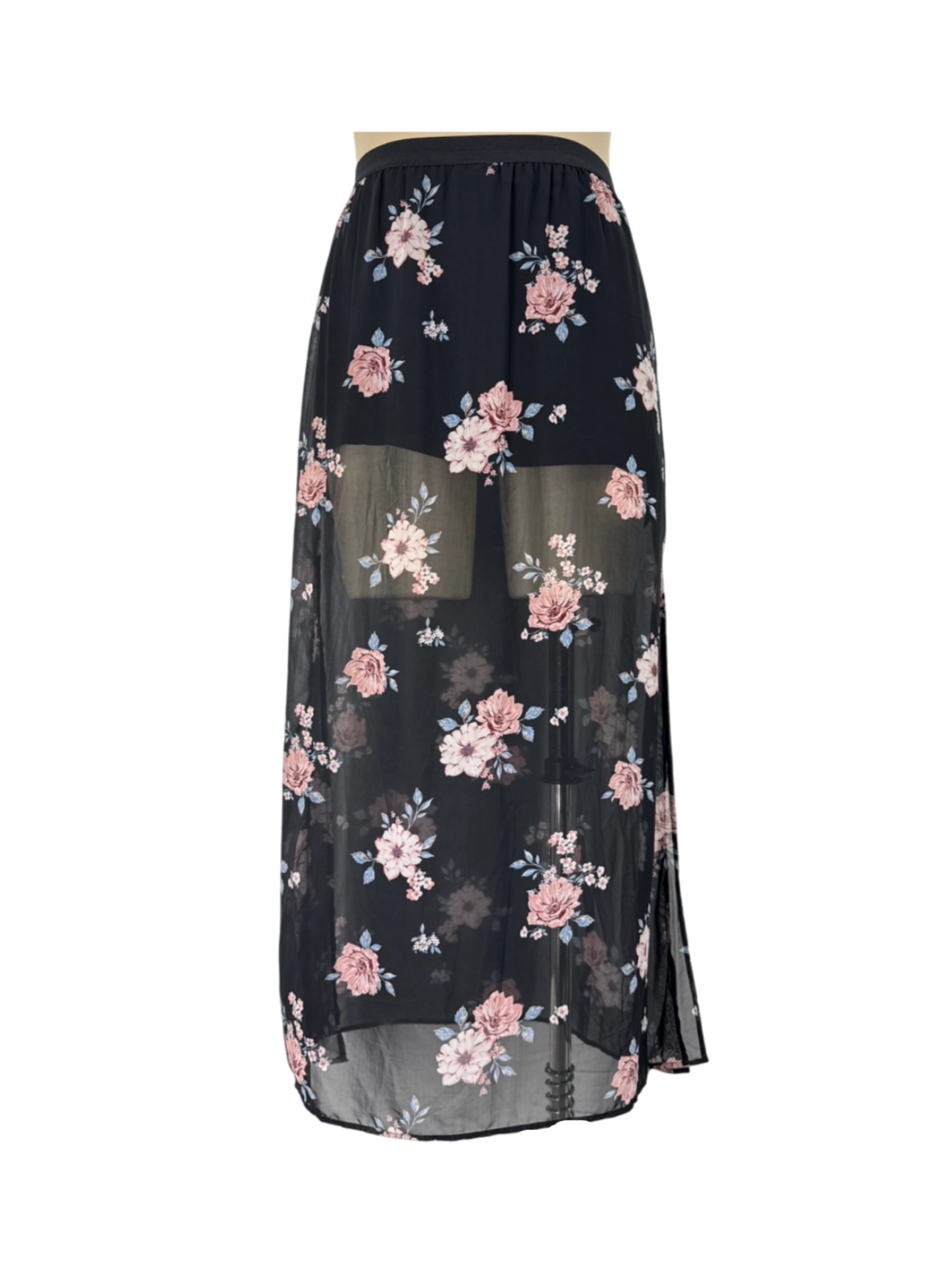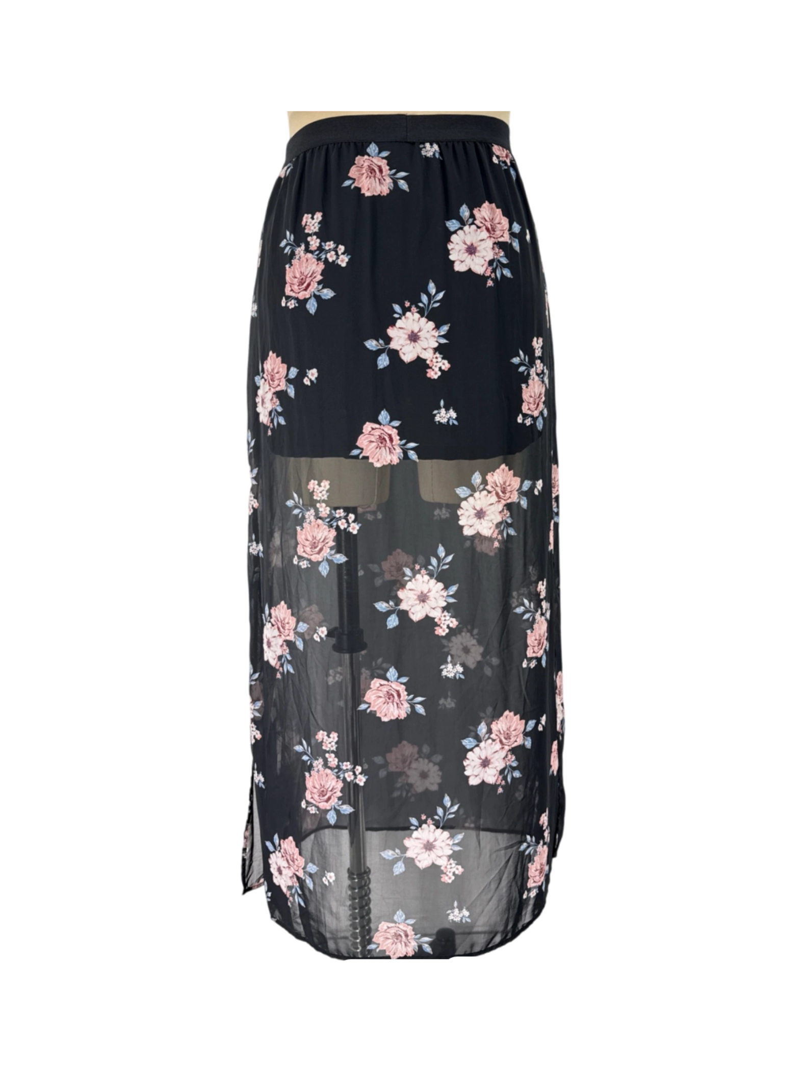 This pre-owned H&M maxi skirt features a stylish A-line silhouette. The skirt has a see-through floral design. Perfect for summer or spring, this skirt is made from lightweight polyester fabric, ensuring comfort and breathability. The skirt is ideal for casual outings or dressing up for an evening event. The elastic waistband ensures a perfect fit. The floral pattern adds a touch of femininity and style to any outfit.