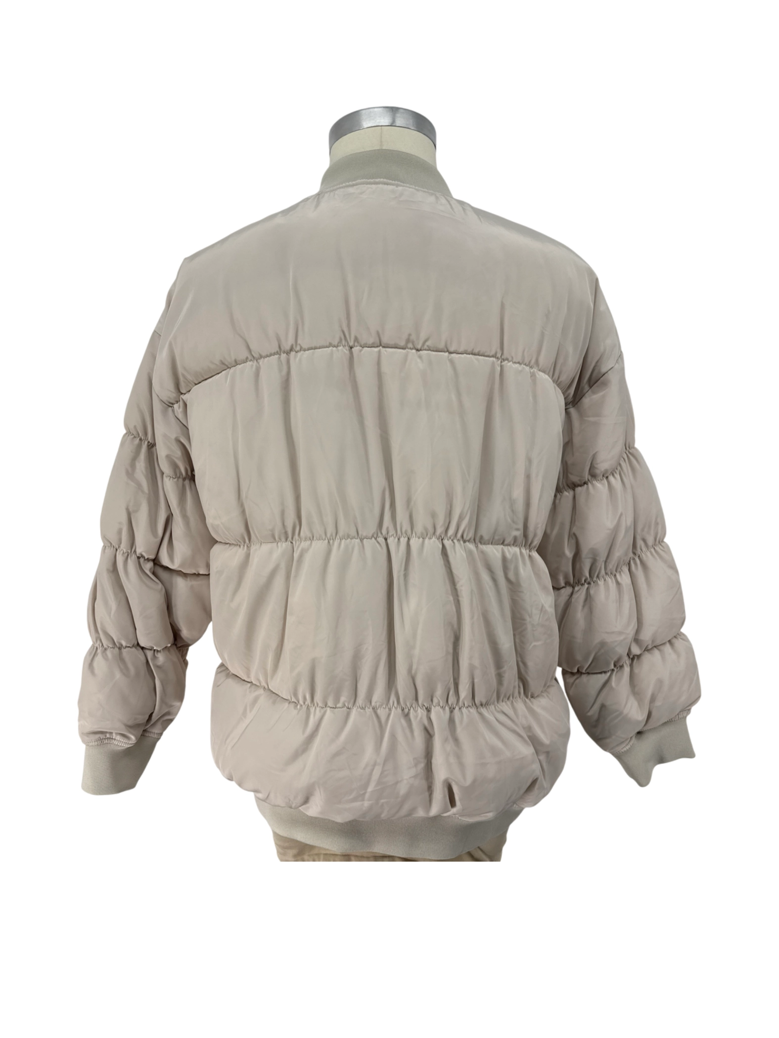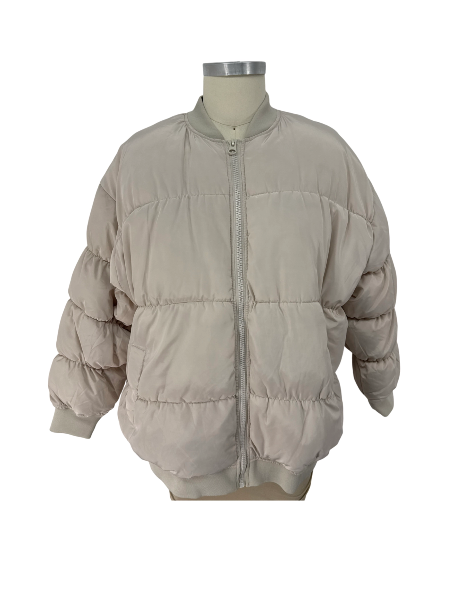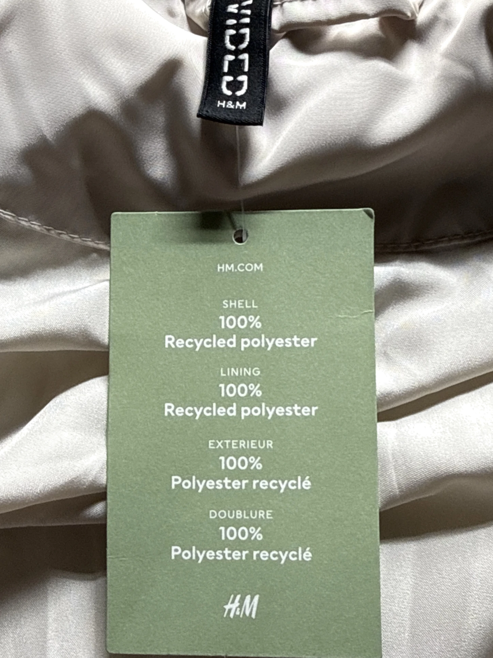 This pre-owned H&M puffer jacket is a stylish and cozy choice for colder weather. The beige color offers versatility, while the design ensures both warmth and a modern look. Crafted from recycled polyester, it's a sustainable option. Perfect for adding a layer of warmth and fashion to any outfit, this jacket is ideal for winter and fall. Its a great find for those seeking a blend of practicality, style, and eco-consciousness.