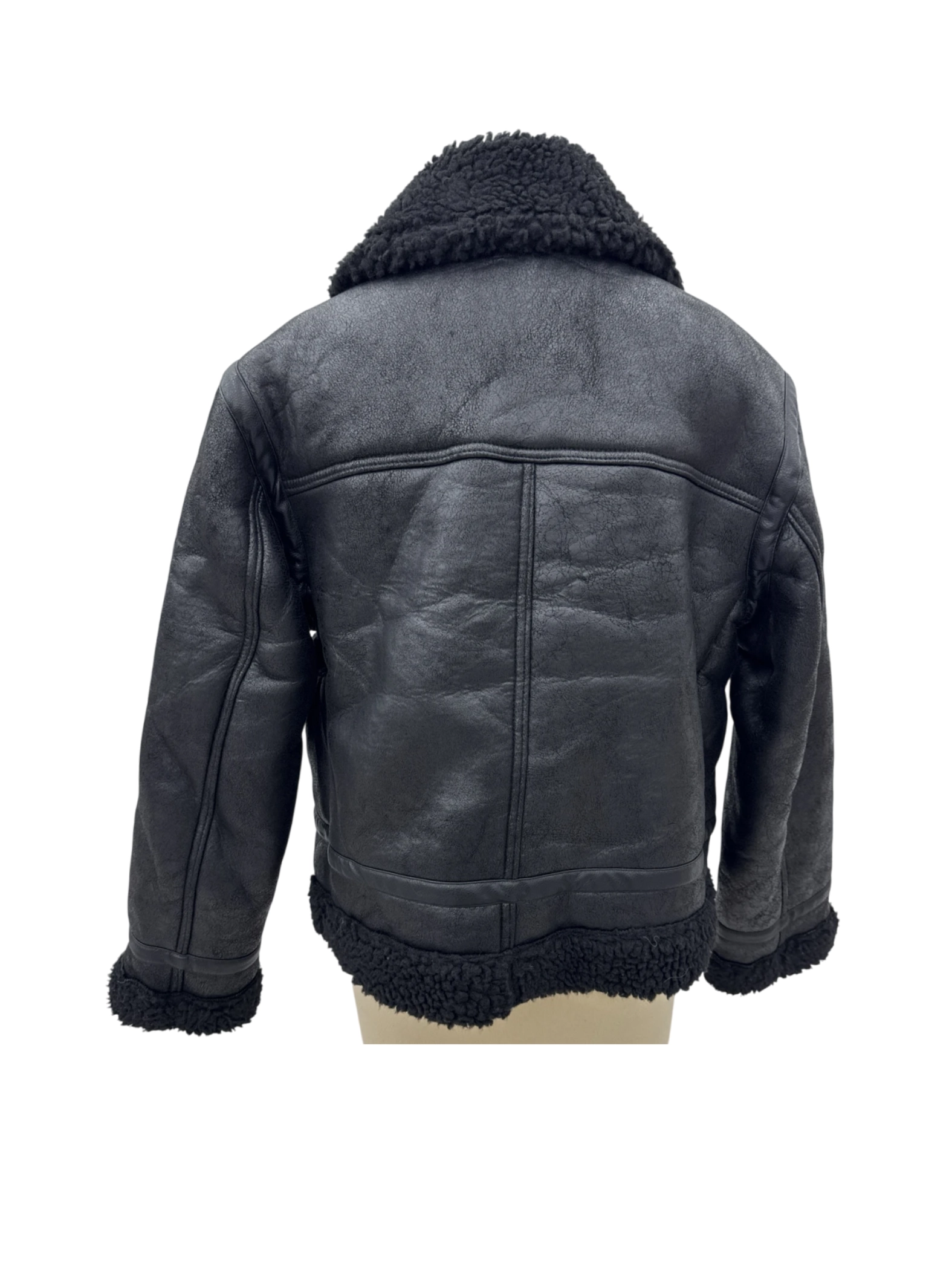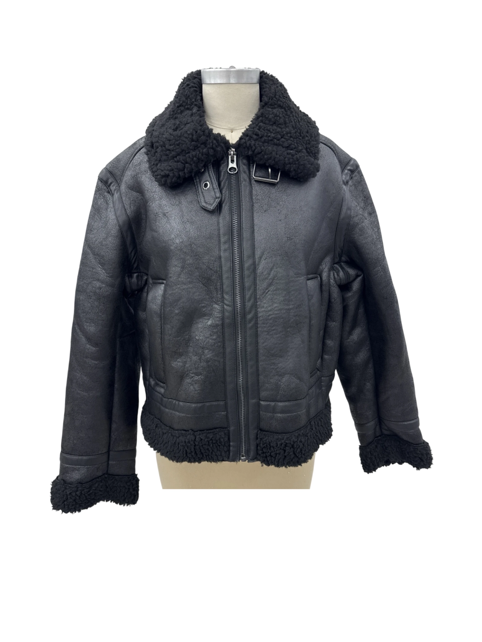 This pre-owned H&M jacket is a stylish and warm addition to any wardrobe. Crafted from faux leather and lined with cozy material, it features a classic design with a shearling collar for added comfort and style. The jacket is in great condition, making it a perfect choice for those seeking a fashionable and affordable winter outerwear option. Great for everyday wear or a night out. Black color that goes well with everything.