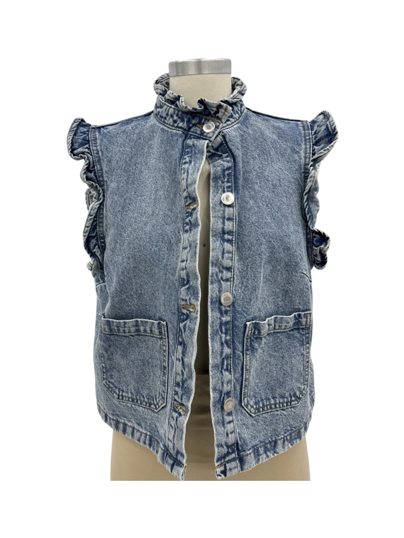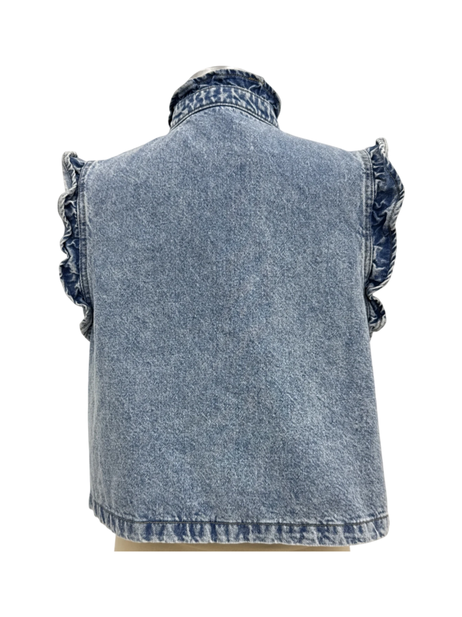 Elevate your denim game with this stylish pre-owned H&M denim vest. This chic vest features a classic denim wash, a flattering silhouette, and fun ruffle details. Perfect for layering, this versatile piece can be dressed up or down. A must-have addition to any wardrobe, offering comfort and timeless style.