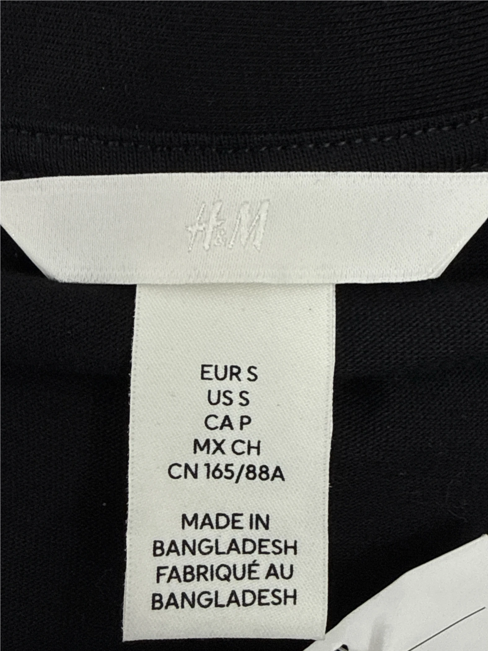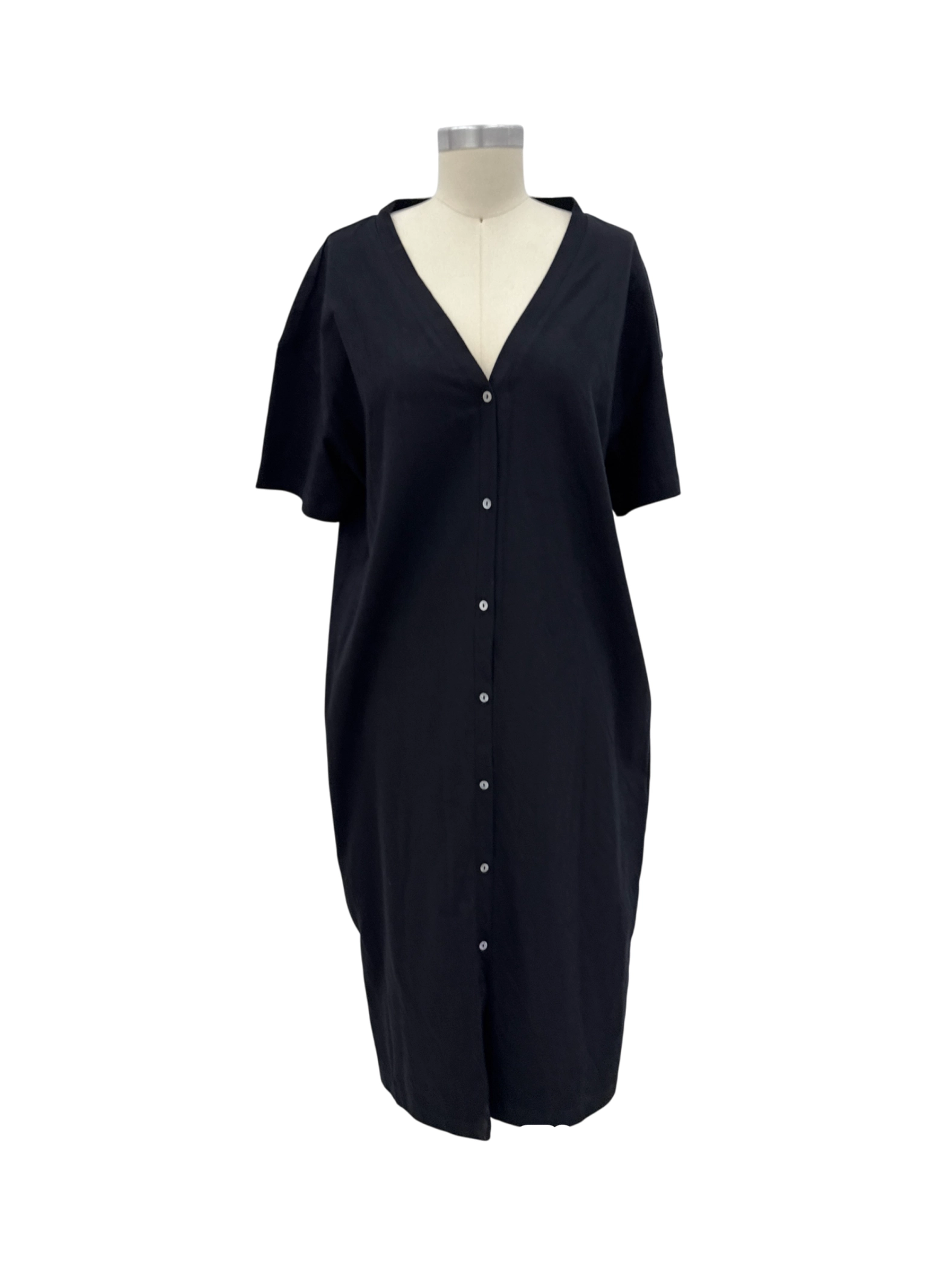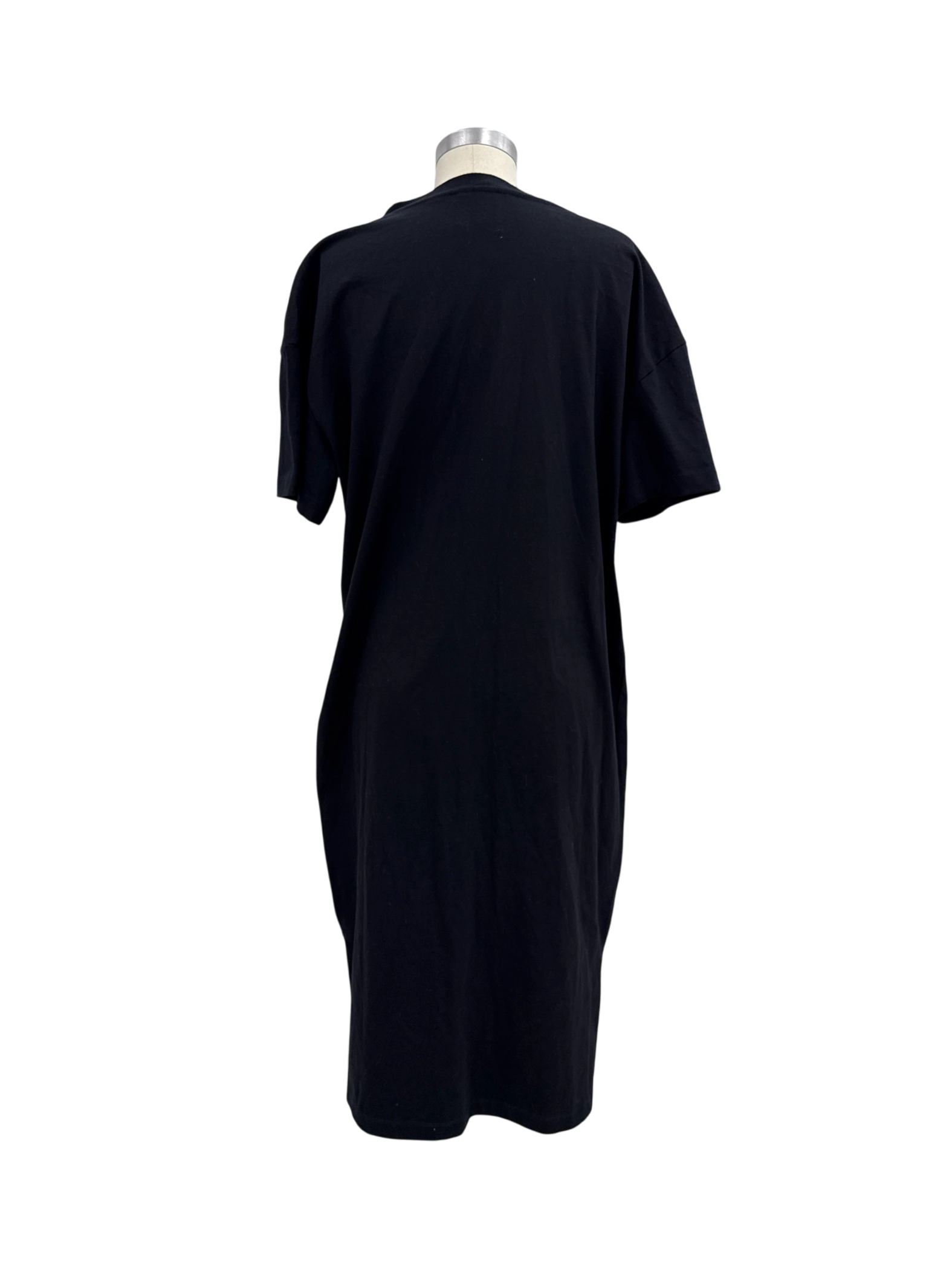 This H&M black dress is a versatile addition to any wardrobe. Featuring a classic V-neck and a relaxed A-line silhouette, it's perfect for casual outings or layering. Made from comfortable cotton fabric, the dress offers a flattering fit. The short sleeves and midi skirt length make it ideal for warmer seasons. Great as a secondhand piece.