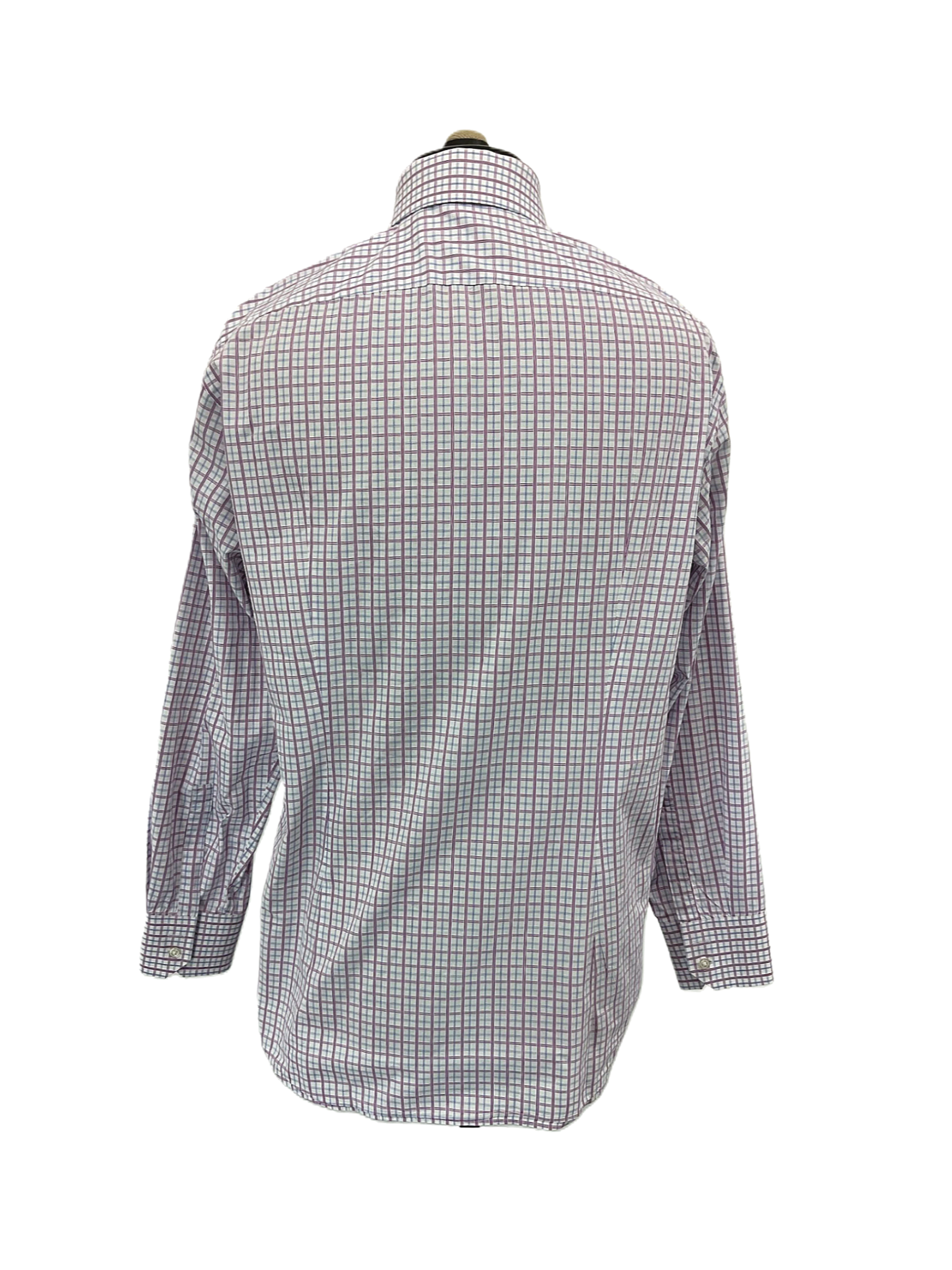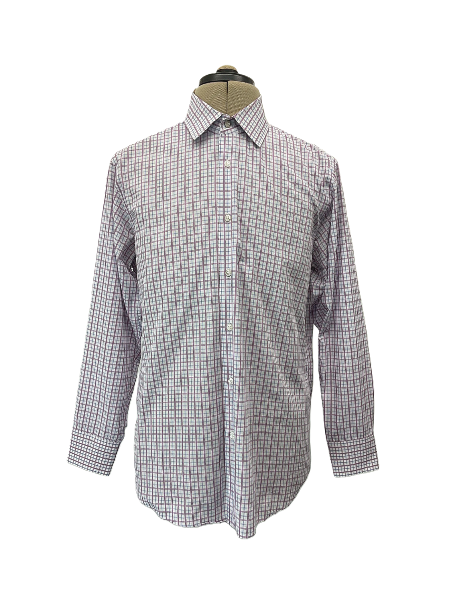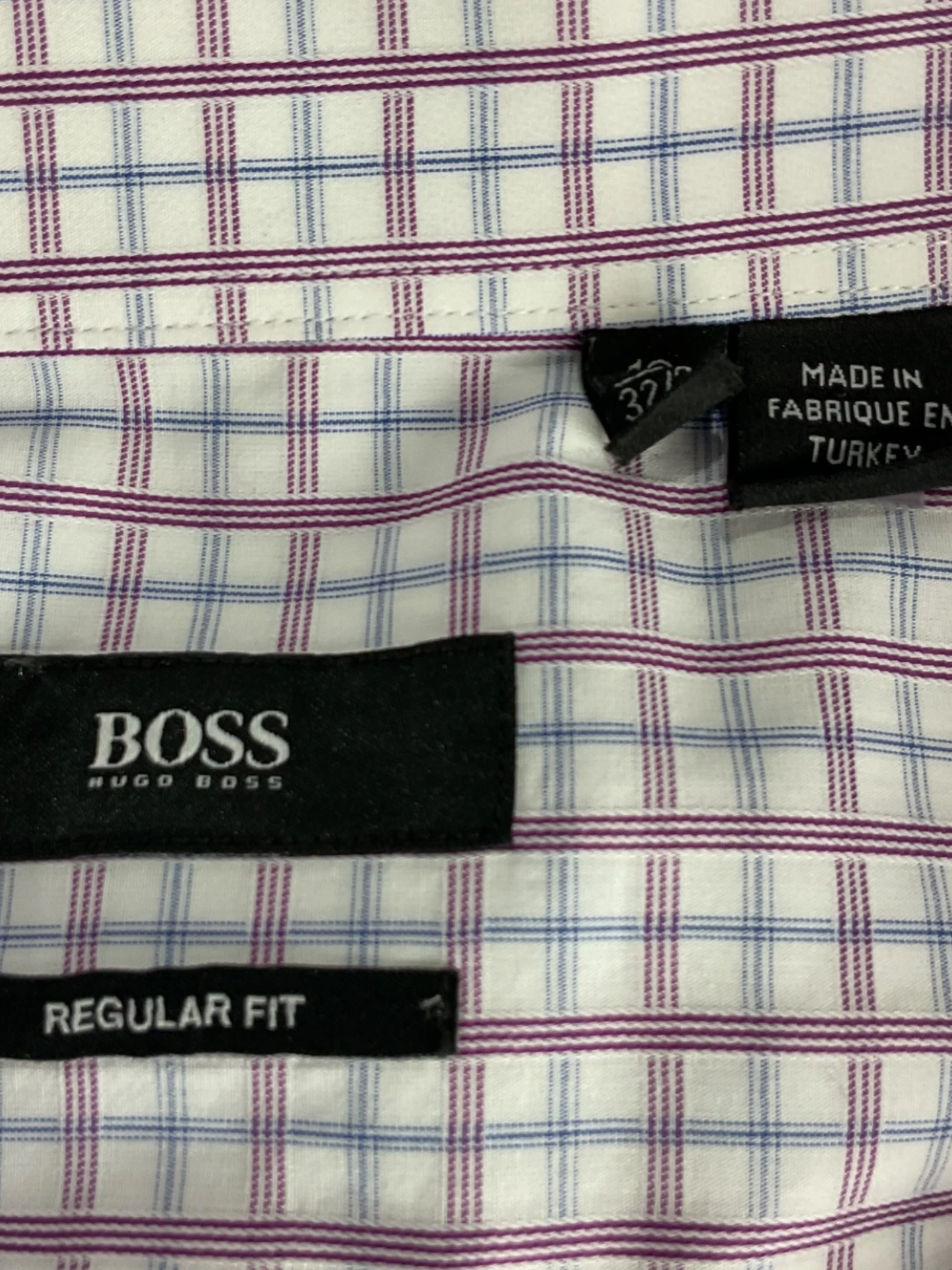 This is a white, light blue, and purple checkered pattern long sleeve button-up shirt for men from Hugo Boss in size 16. Made: 100% Cotton.