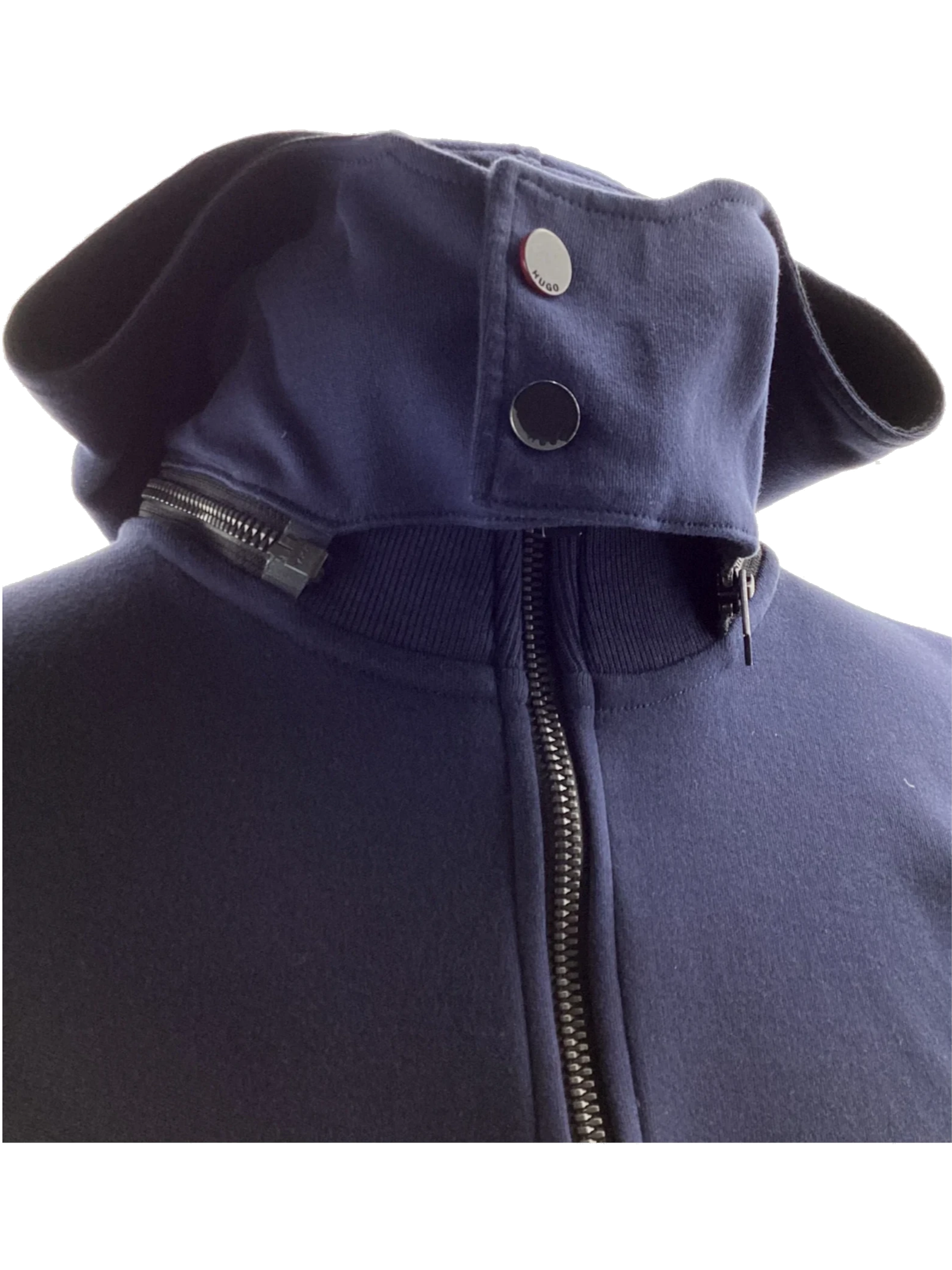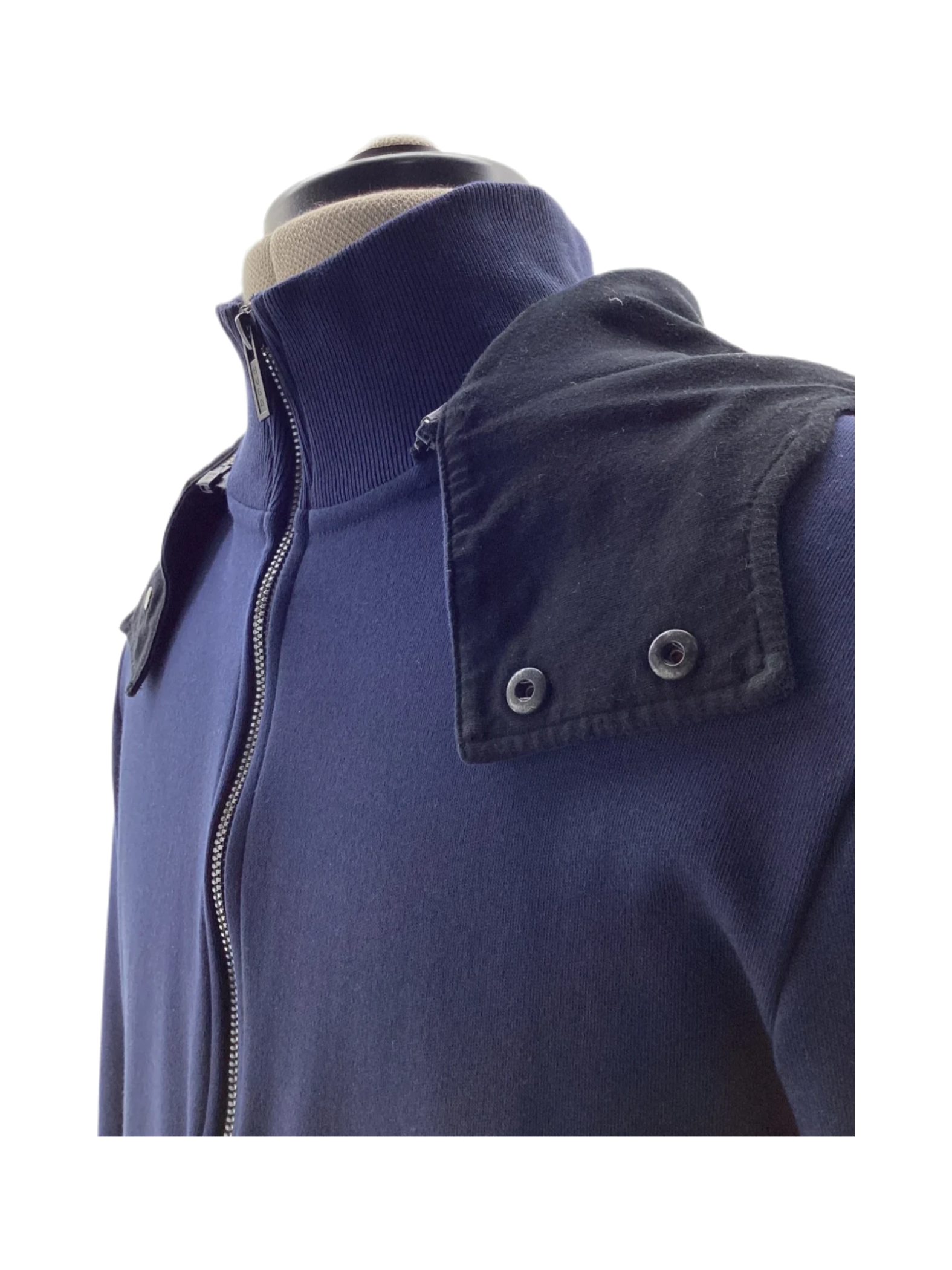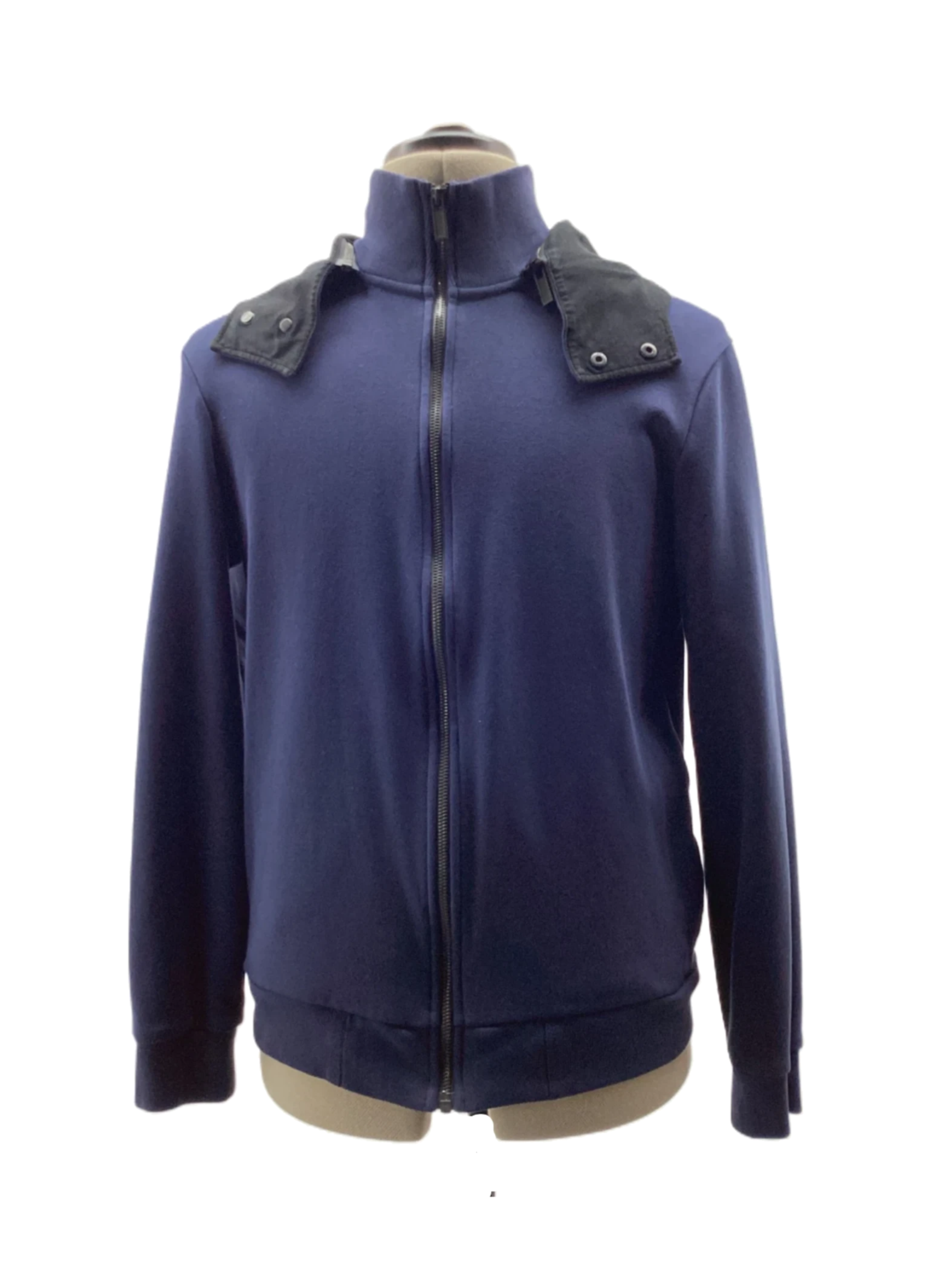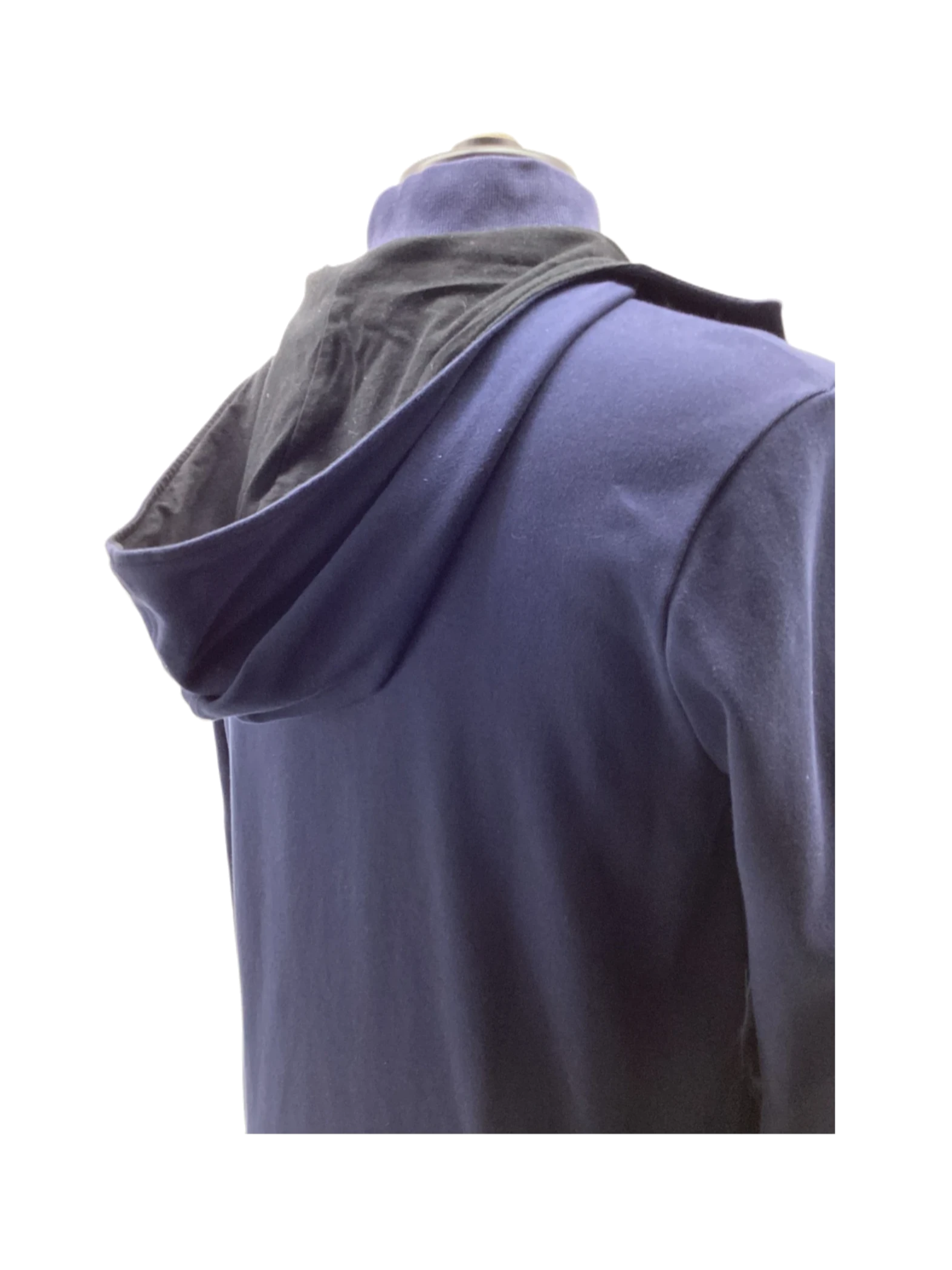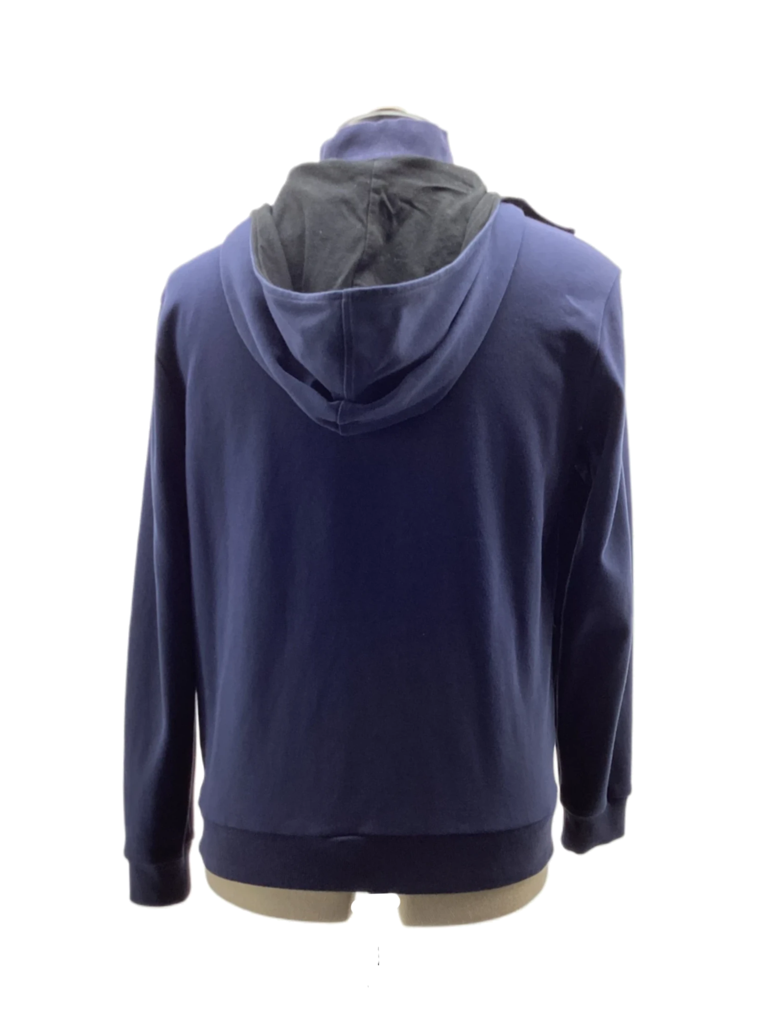 A men's zip-up hoodie in blue and black fleece, size Large.