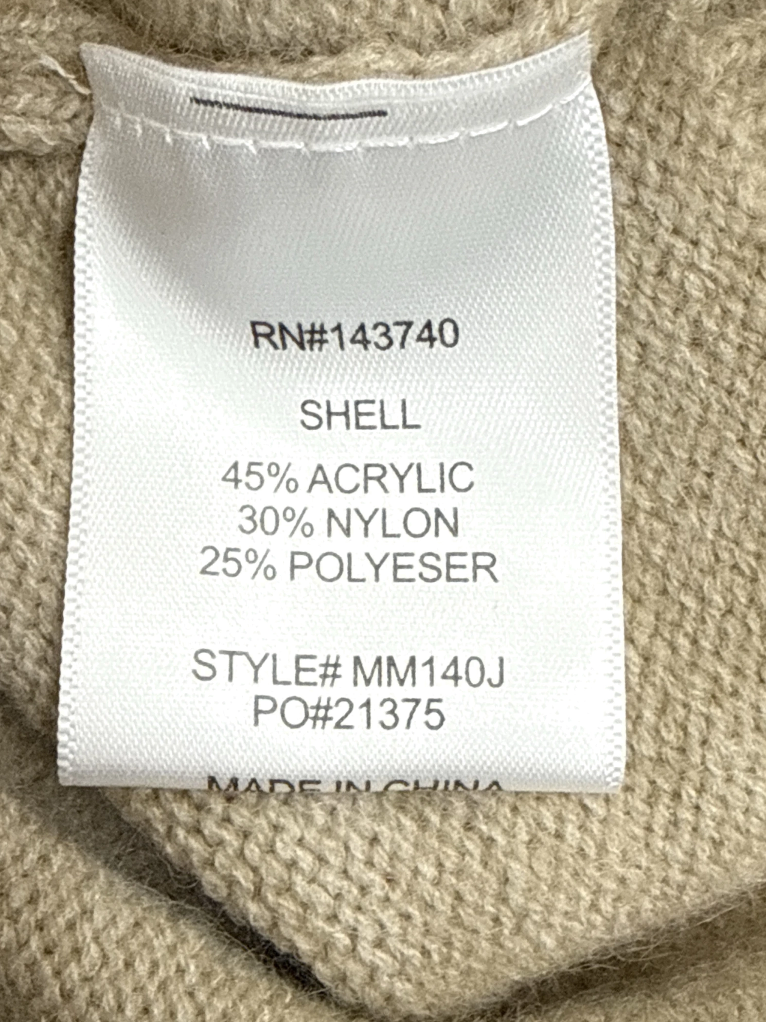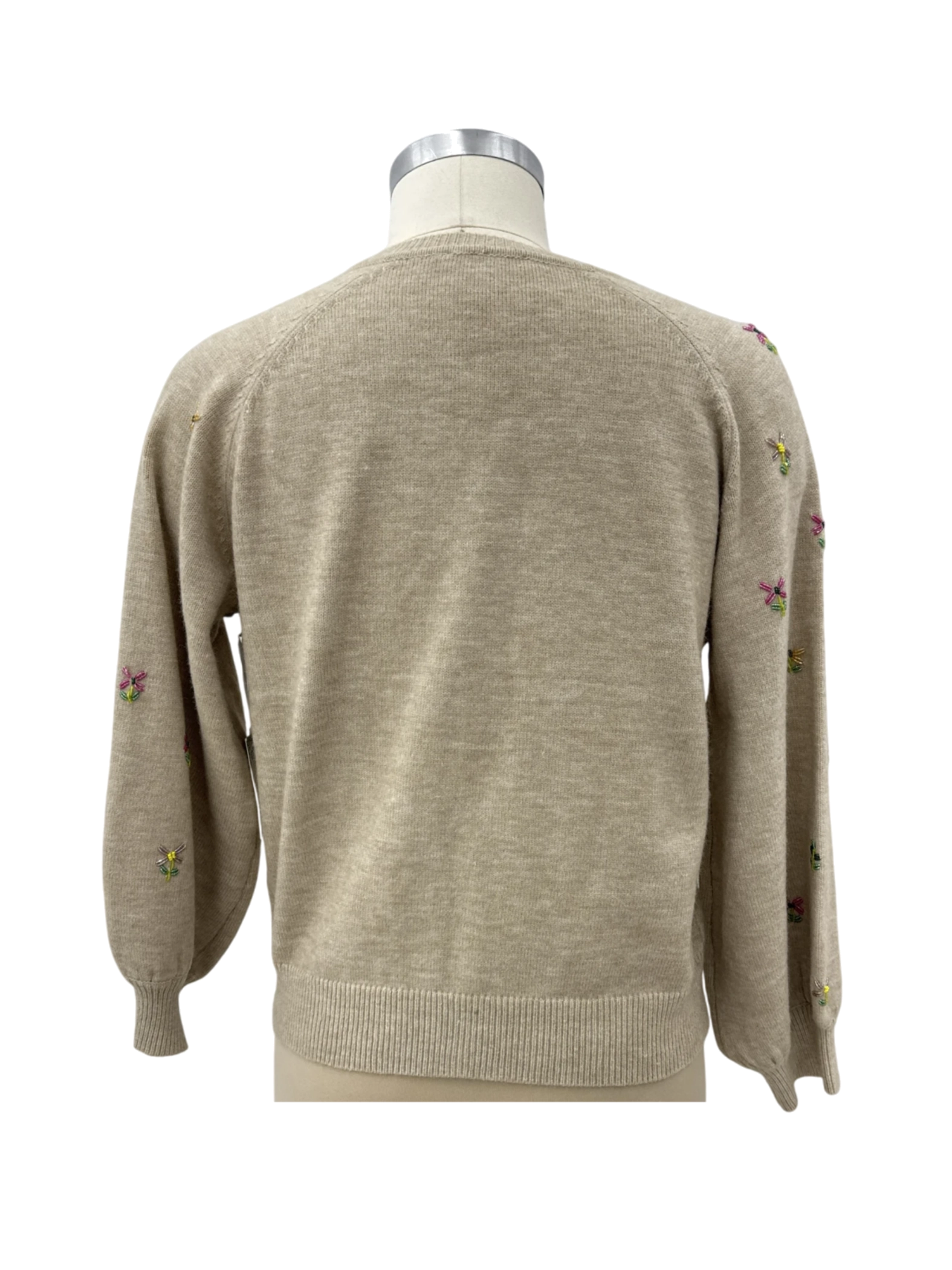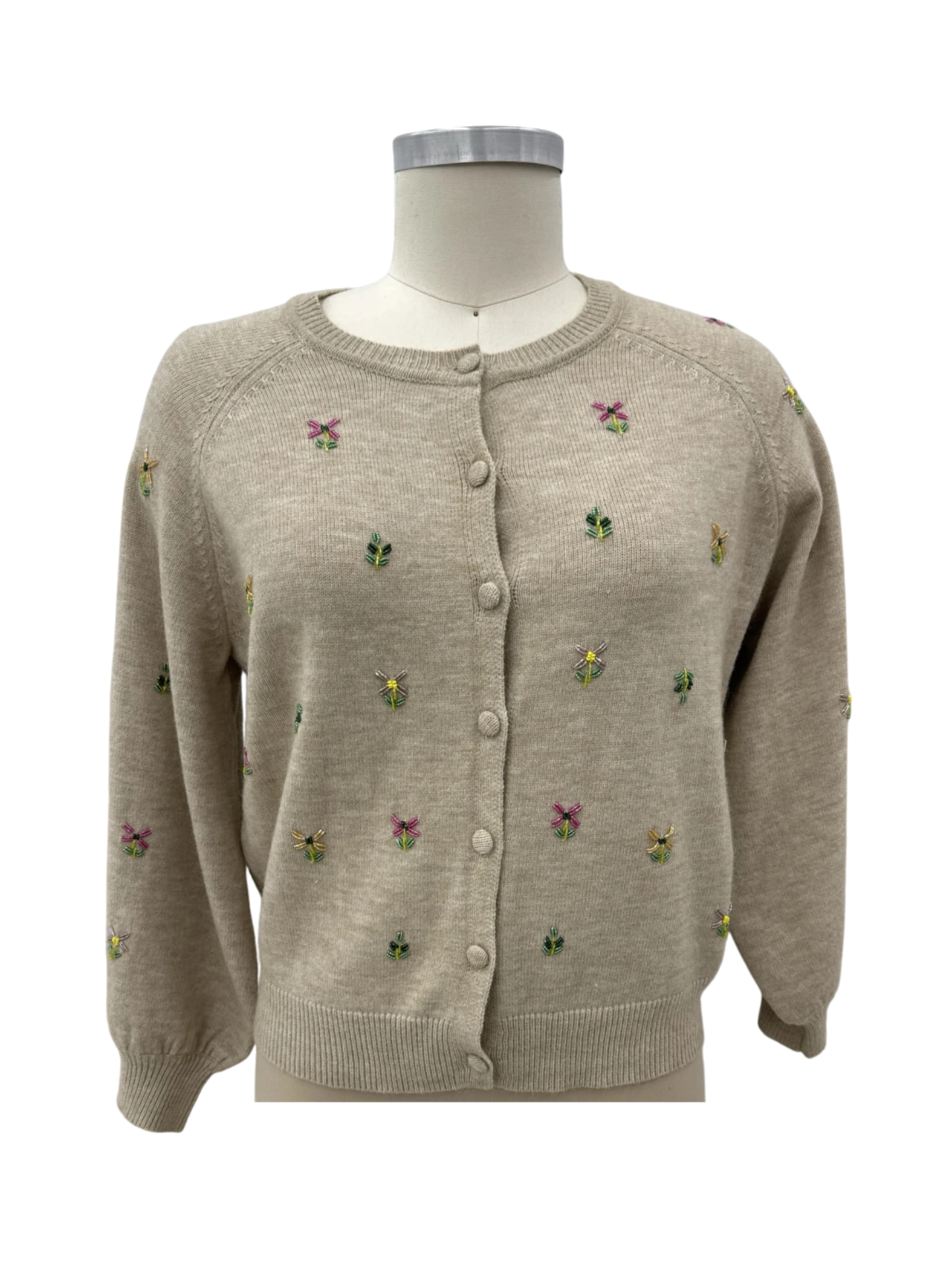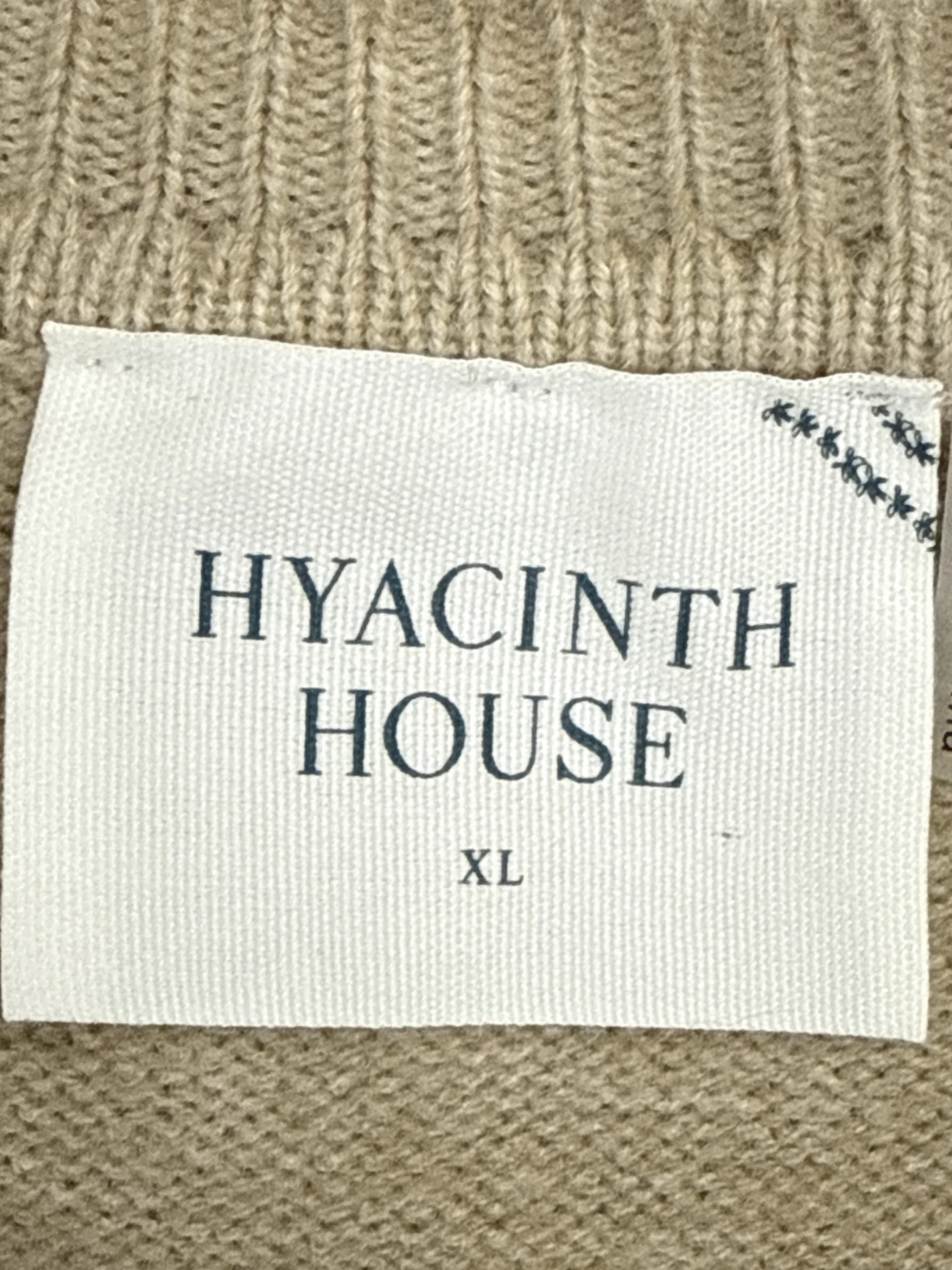 This pre-owned HYACINTH HOUSE cardigan sweater is a stylish addition to any wardrobe. Featuring a beautiful floral embroidery on a beige background, it's perfect for layering during the fall and winter months. The sweater is made from a blend of acrylic, nylon, and polyester for a comfortable and durable fit. With a classic button-up closure and round neckline, this cardigan is a versatile piece that can be dressed up or down.