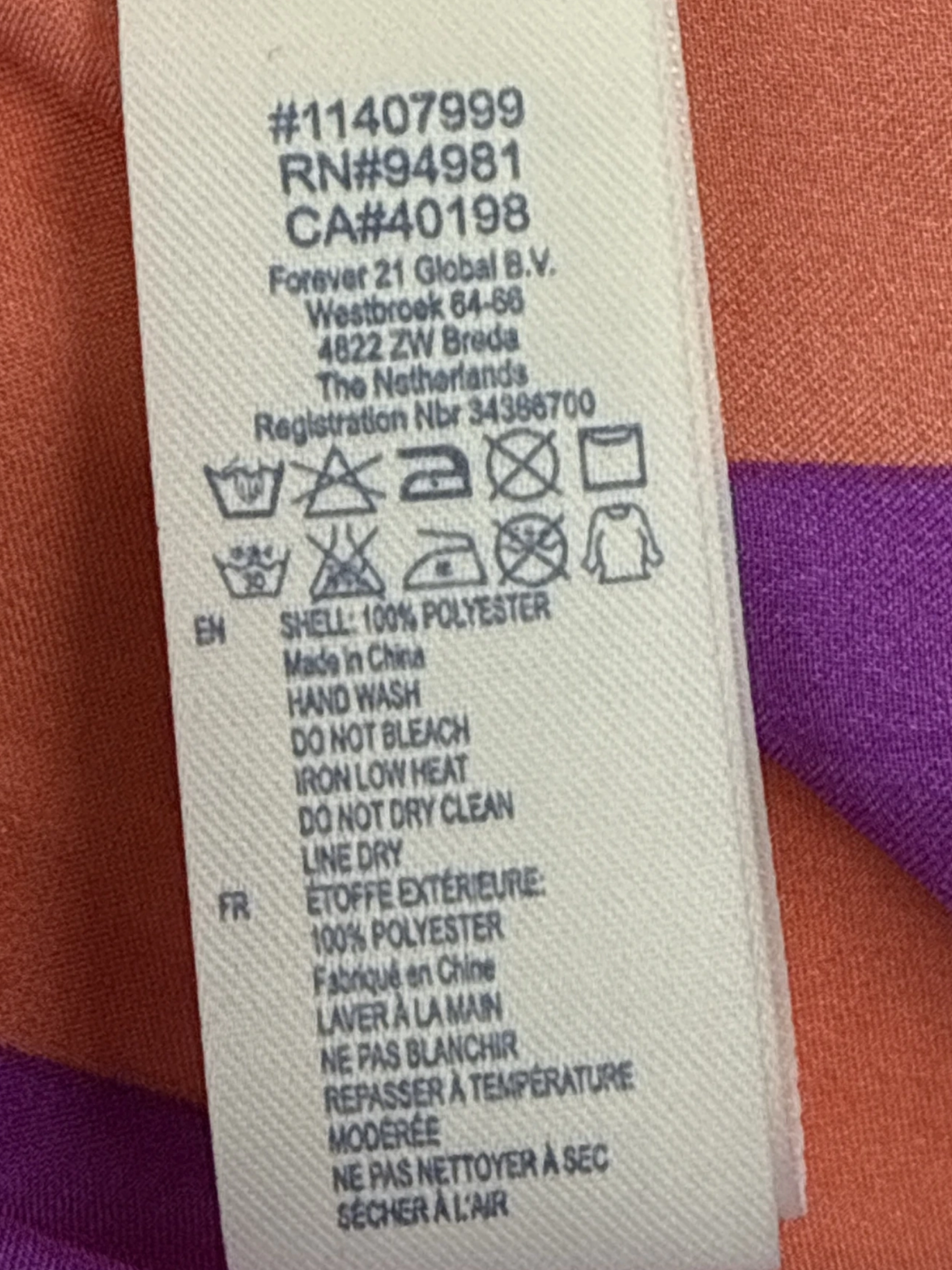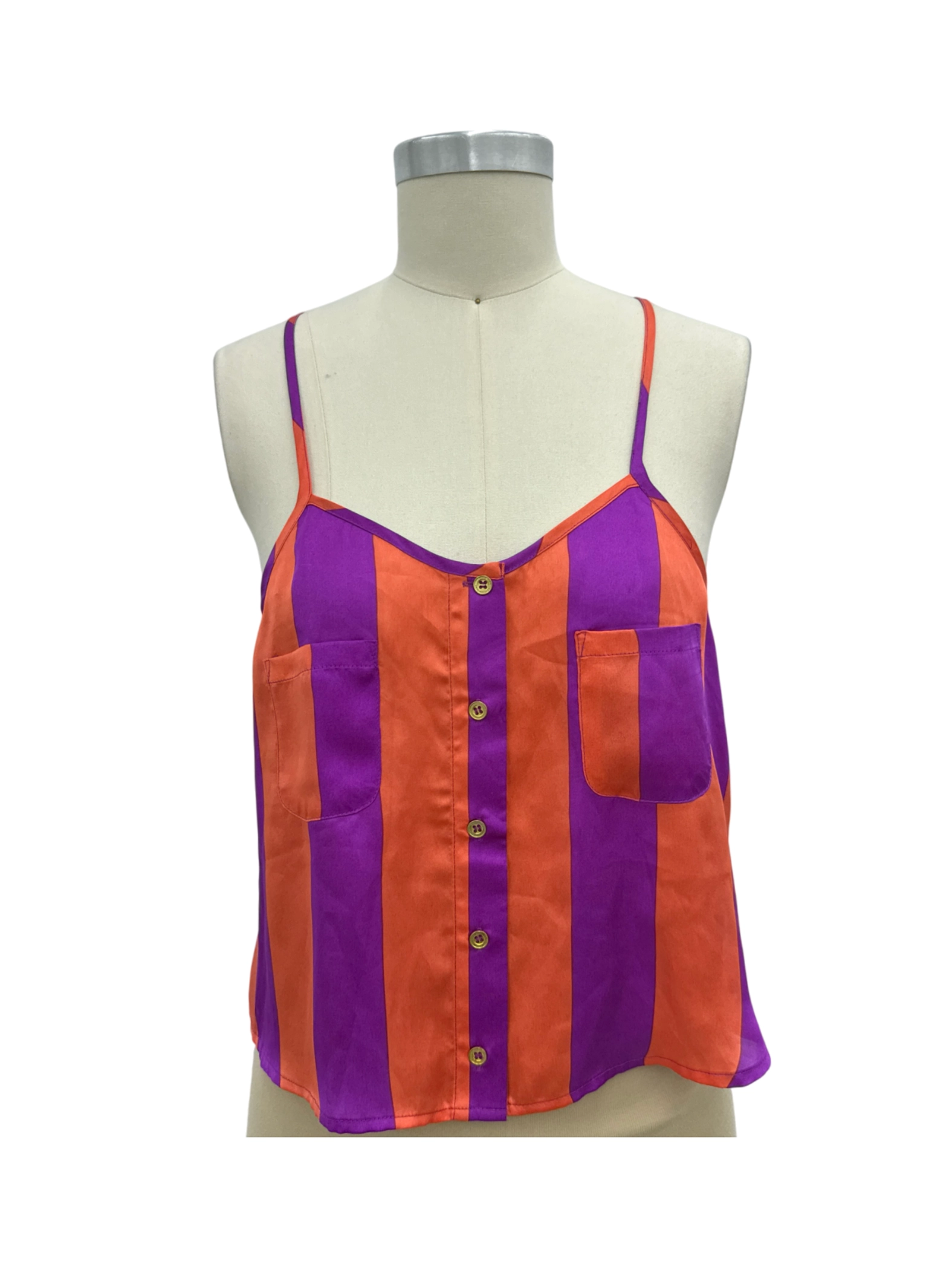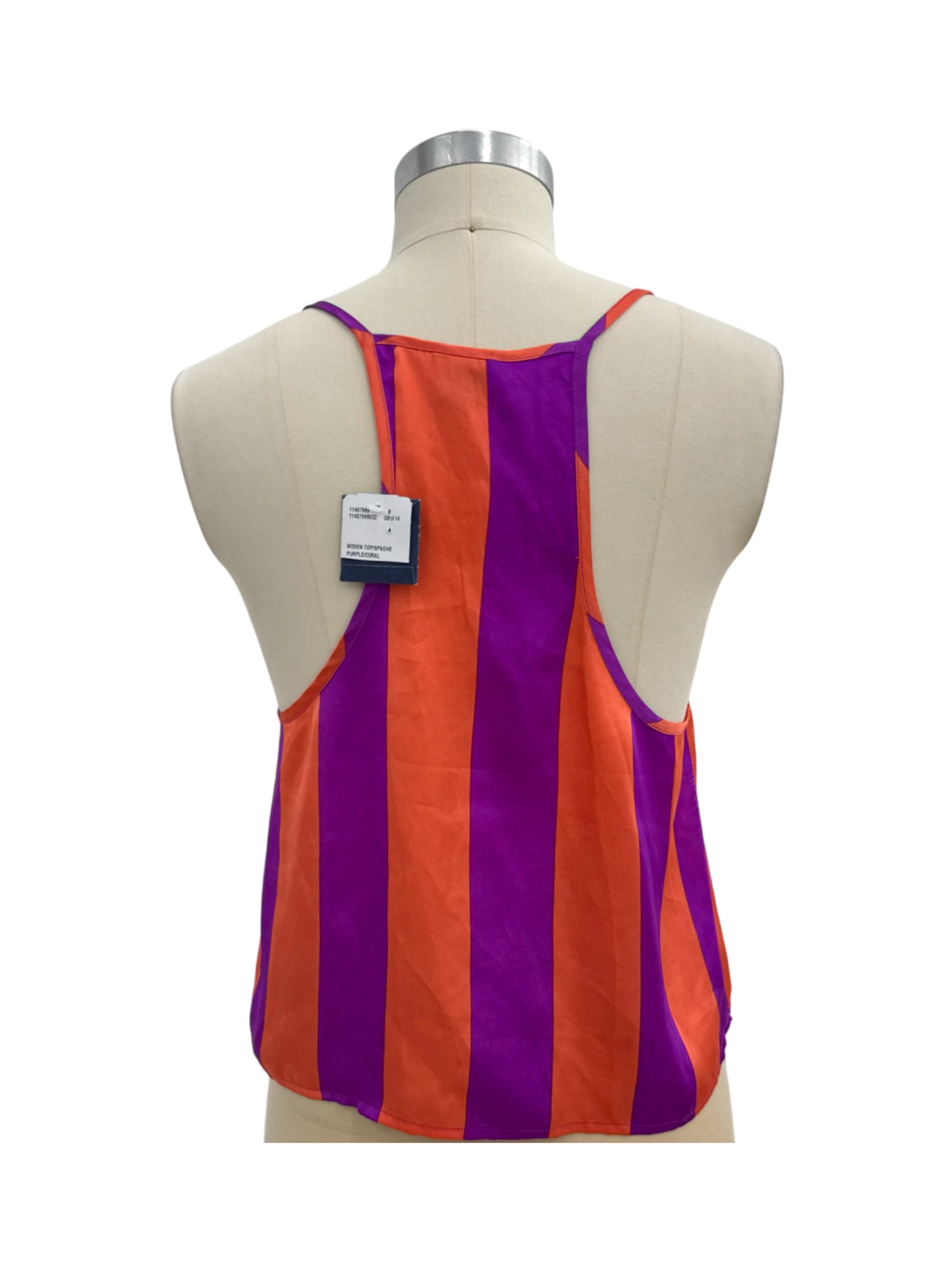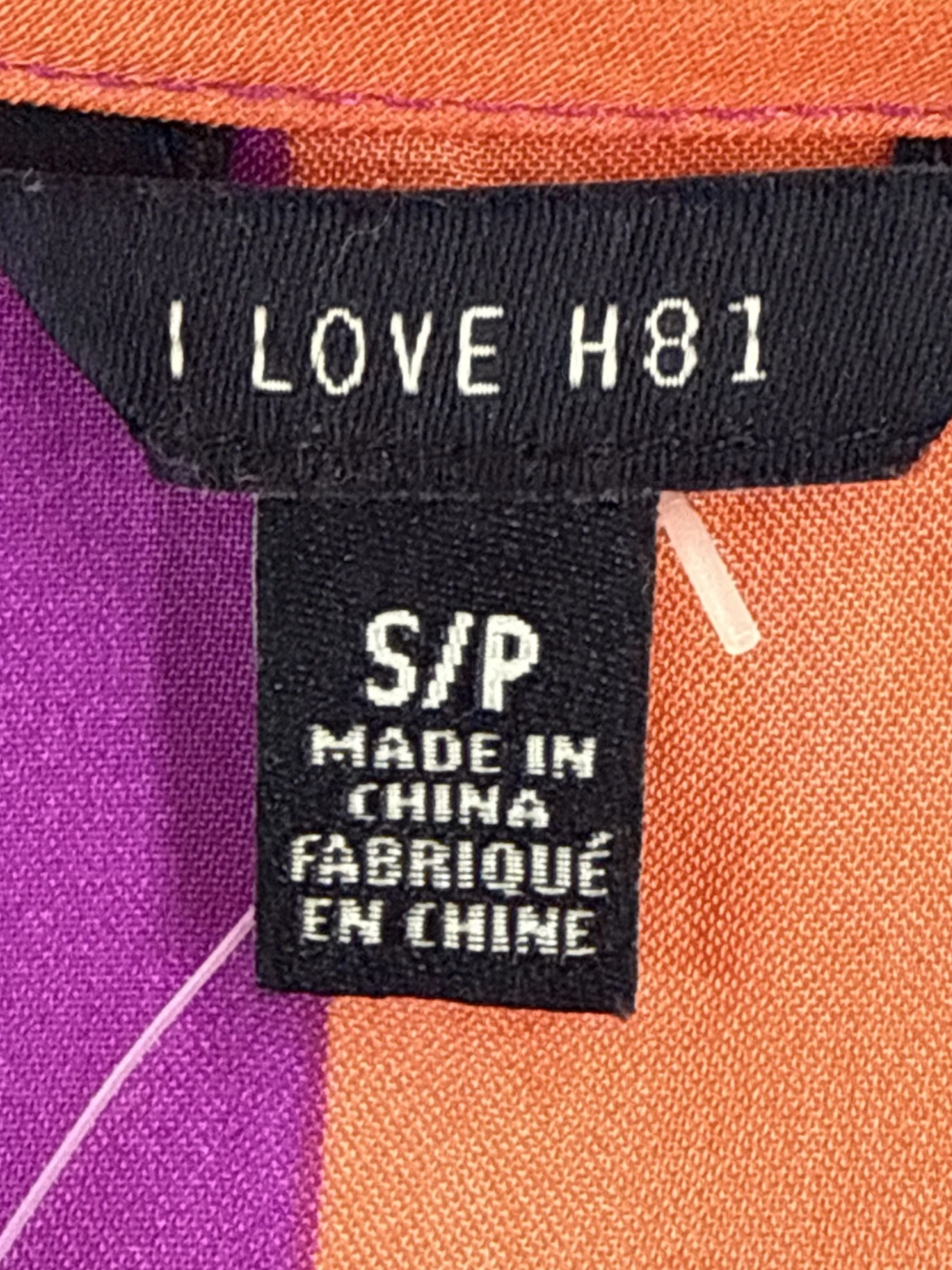 This stylish I Love H81 tank top is perfect for adding a pop of color to your summer wardrobe. Featuring a vibrant striped pattern in purple and orange, this tank top is made from comfortable polyester. Its a great option for casual wear or dressing up for a night out. In a size small, it offers a flattering fit. This pre-owned top is a sustainable and fashionable choice, giving a second life to an already amazing piece.