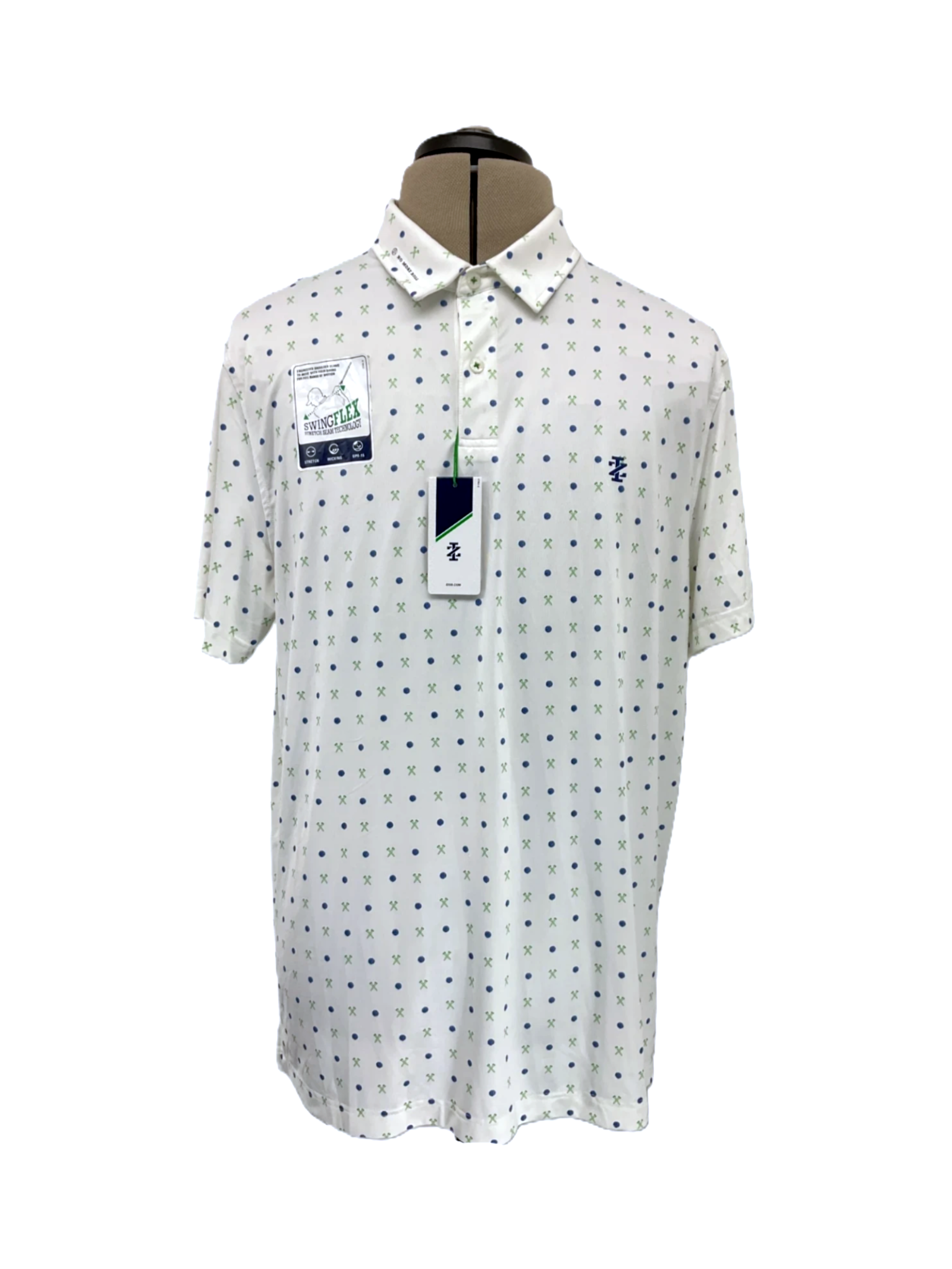 Men's short-sleeved golf shirt in white, green, and blue, size large.