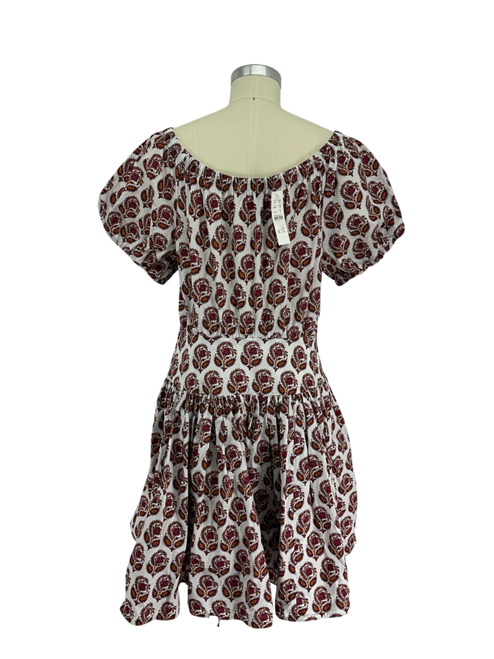 J. Crew is selling a drop waist cotton poplin mini dress with a block print design. It features a boat neck and off-shoulder style, and it is available in size 8.