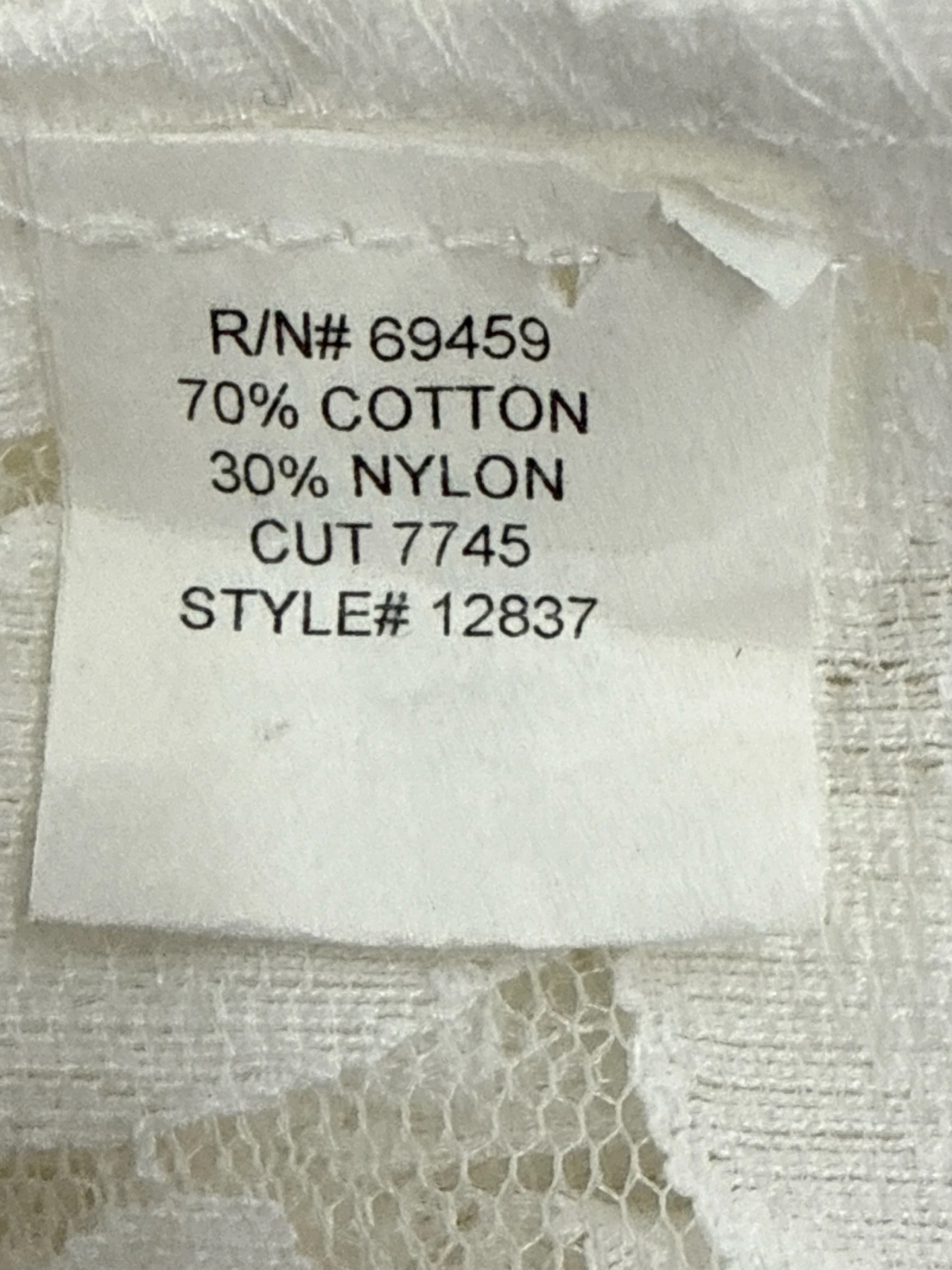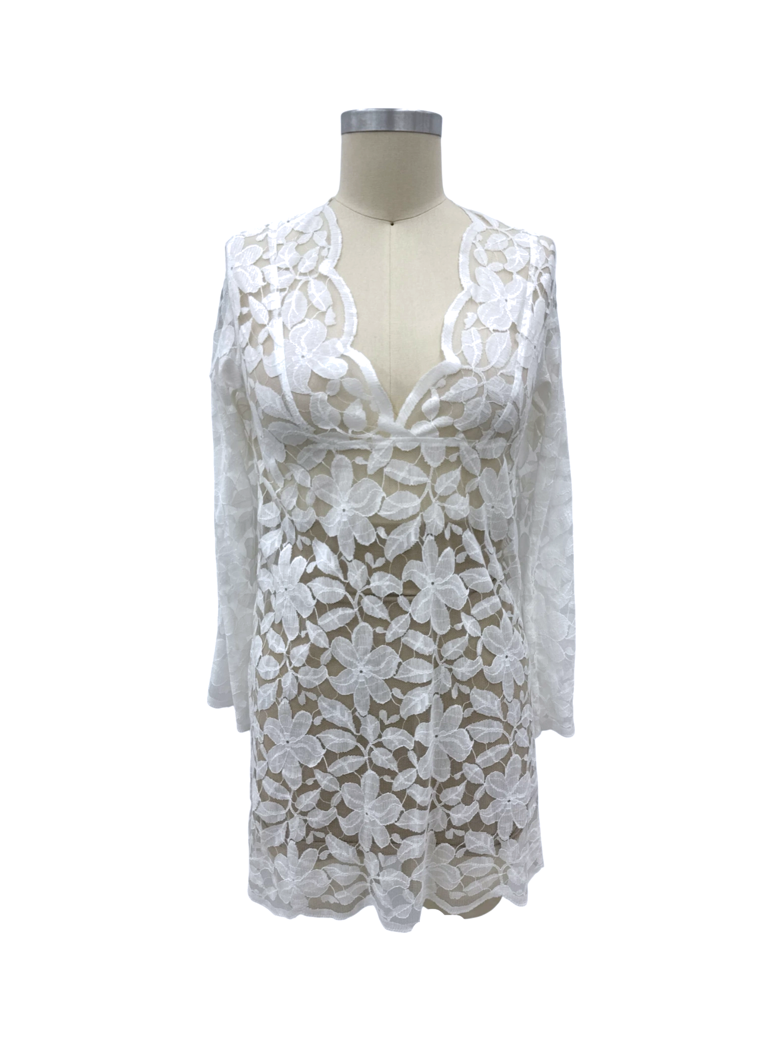 This beautiful J. Vladi mini dress is perfect for a summer day. Featuring a stunning white floral lace design, this dress offers a touch of elegance. With its long sleeves and a flattering A-line silhouette, it's suitable for casual occasions. Crafted from a blend of cotton and nylon, this pre-owned dress is a great addition to any wardrobe.