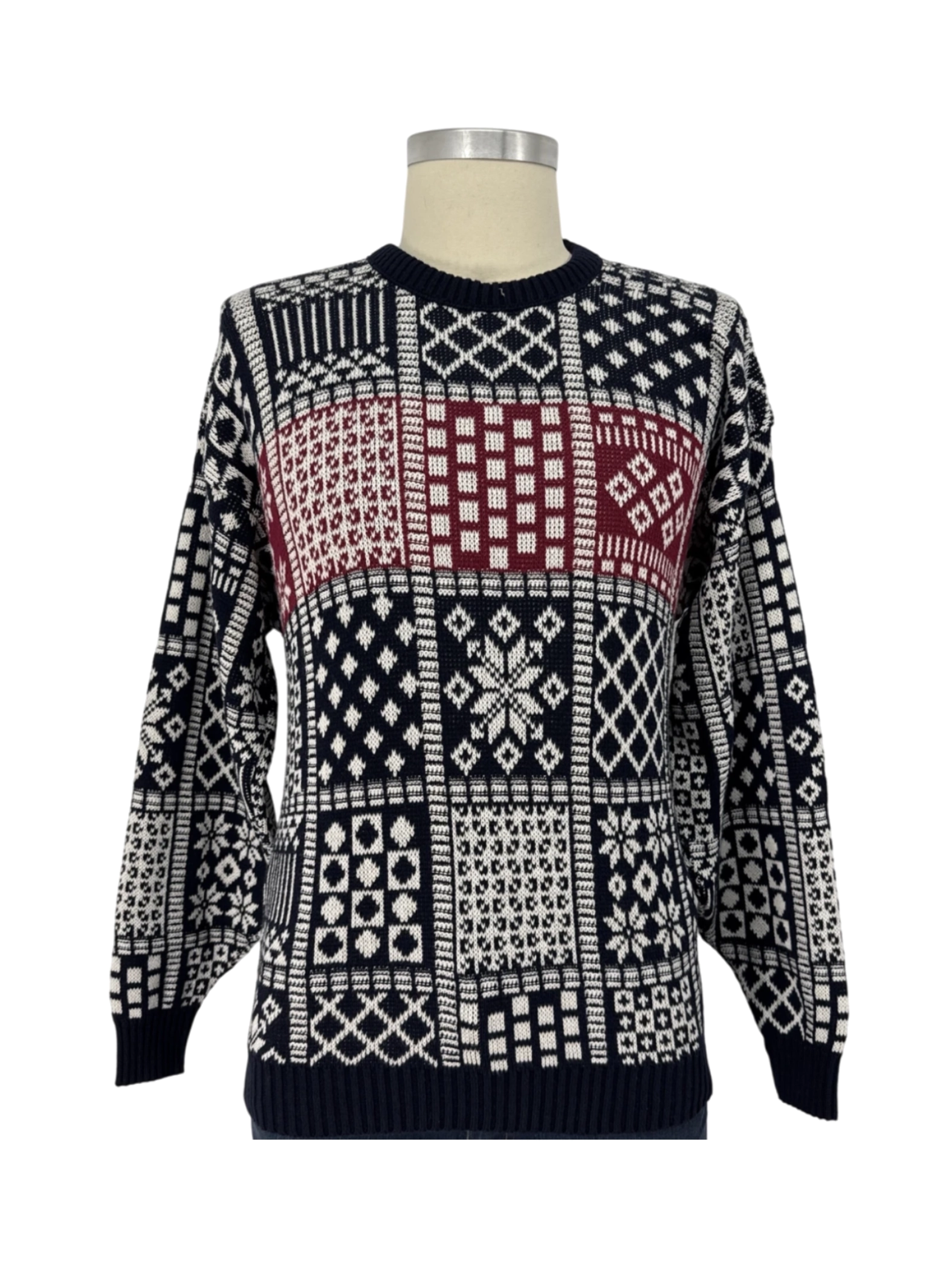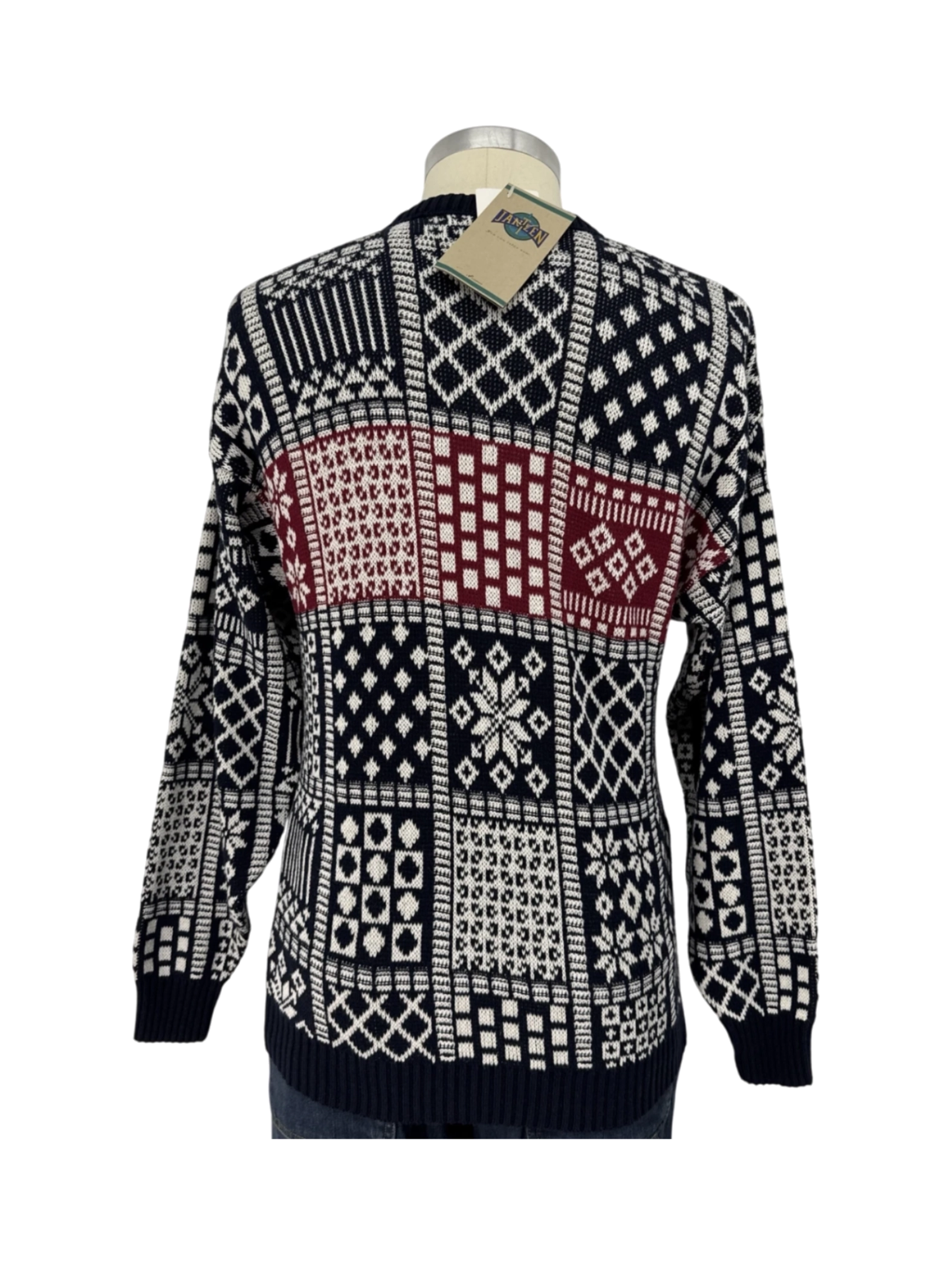 This pre-owned Jantzen sweater is a stylish addition to any wardrobe. Featuring a unique geometric pattern in a mix of colors, this sweater offers both warmth and visual interest. Made with quality materials, it promises comfort and durability. The crew neck and long sleeves make it perfect for cooler weather. A perfect blend of classic design and eye-catching patterns, this sweater is a timeless piece.