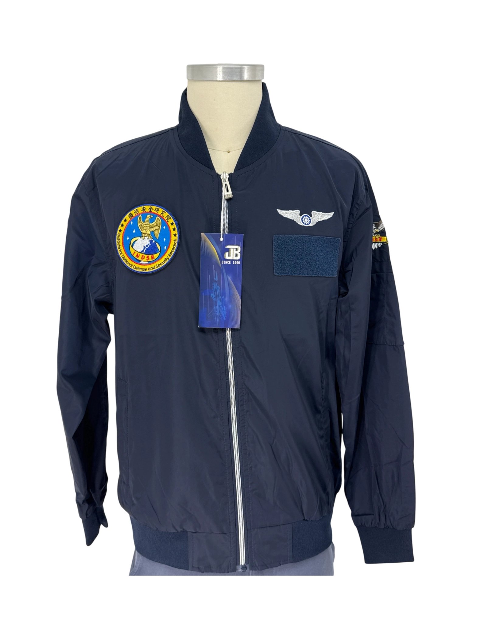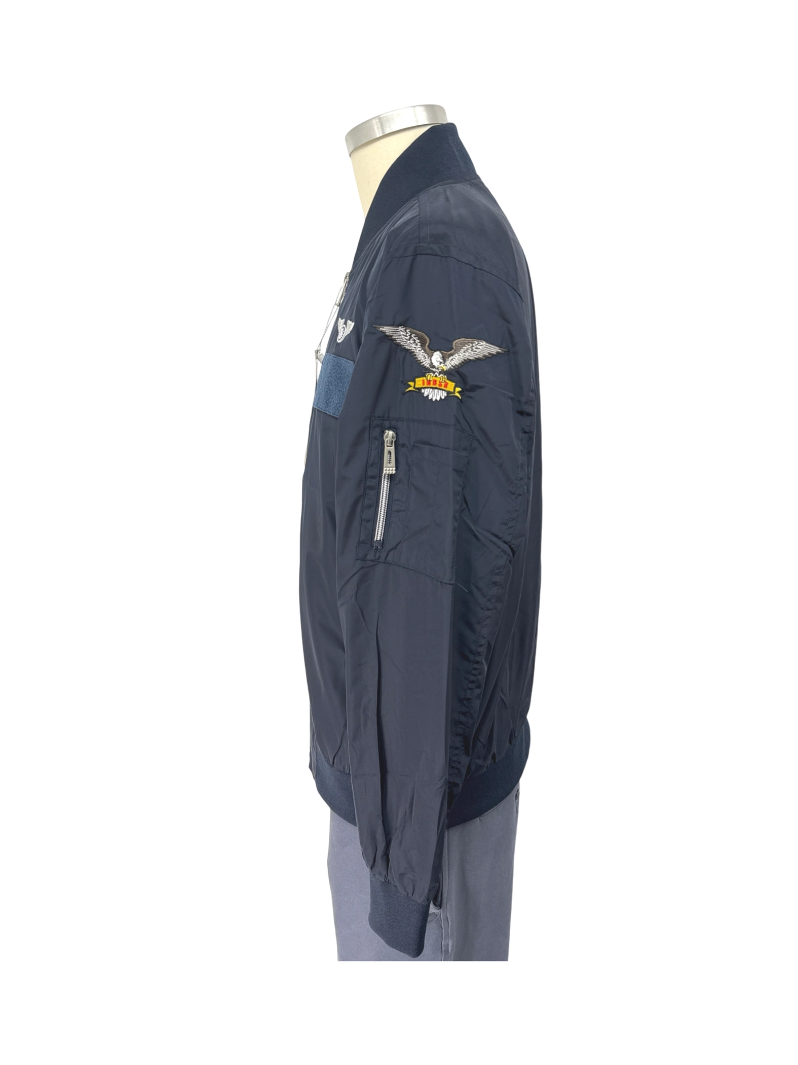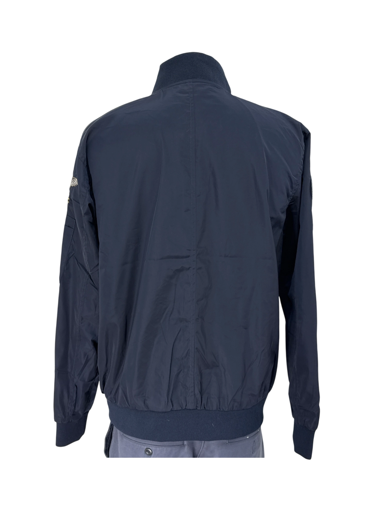 This pre-owned JB bomber jacket is a stylish and versatile addition to any man's wardrobe. Crafted from durable polyester, it's perfect for transitional weather. The jacket features a classic bomber design with a navy blue color and unique patches. Its comfortable fit and timeless appeal make it ideal for everyday wear. A great combination of style and practicality, it's a must-have for any fashion-conscious individual looking for a quality pre-owned jacket.