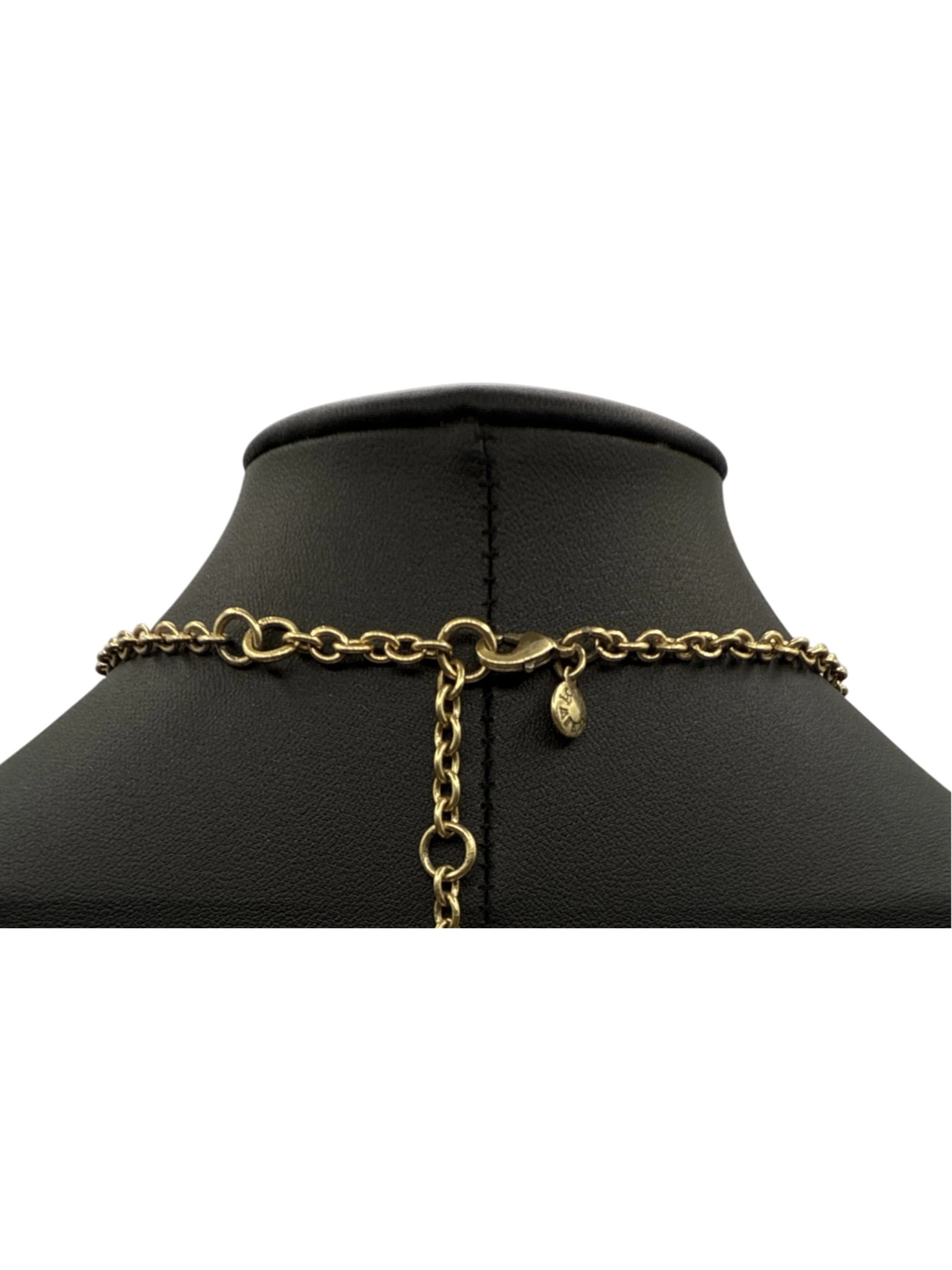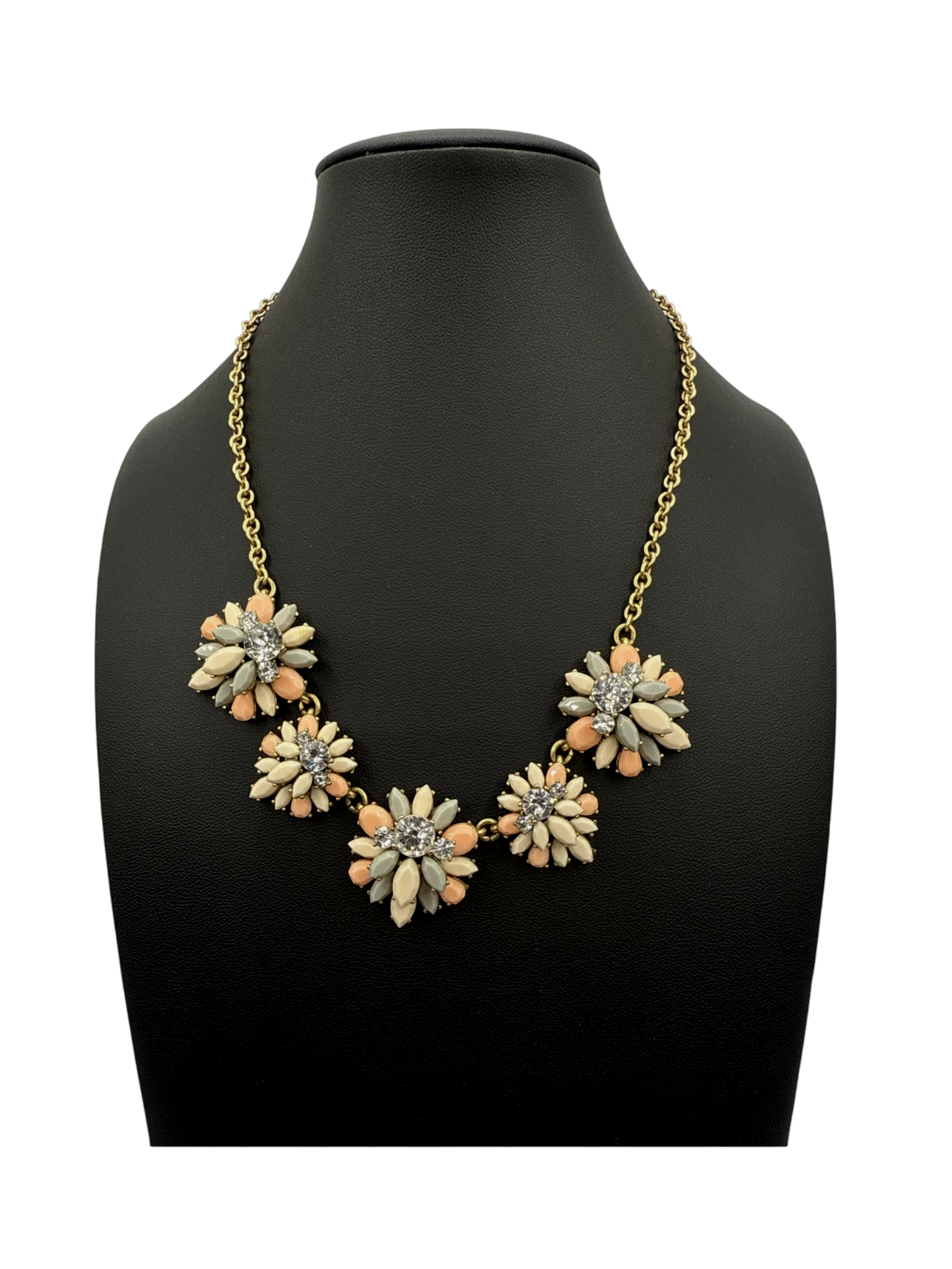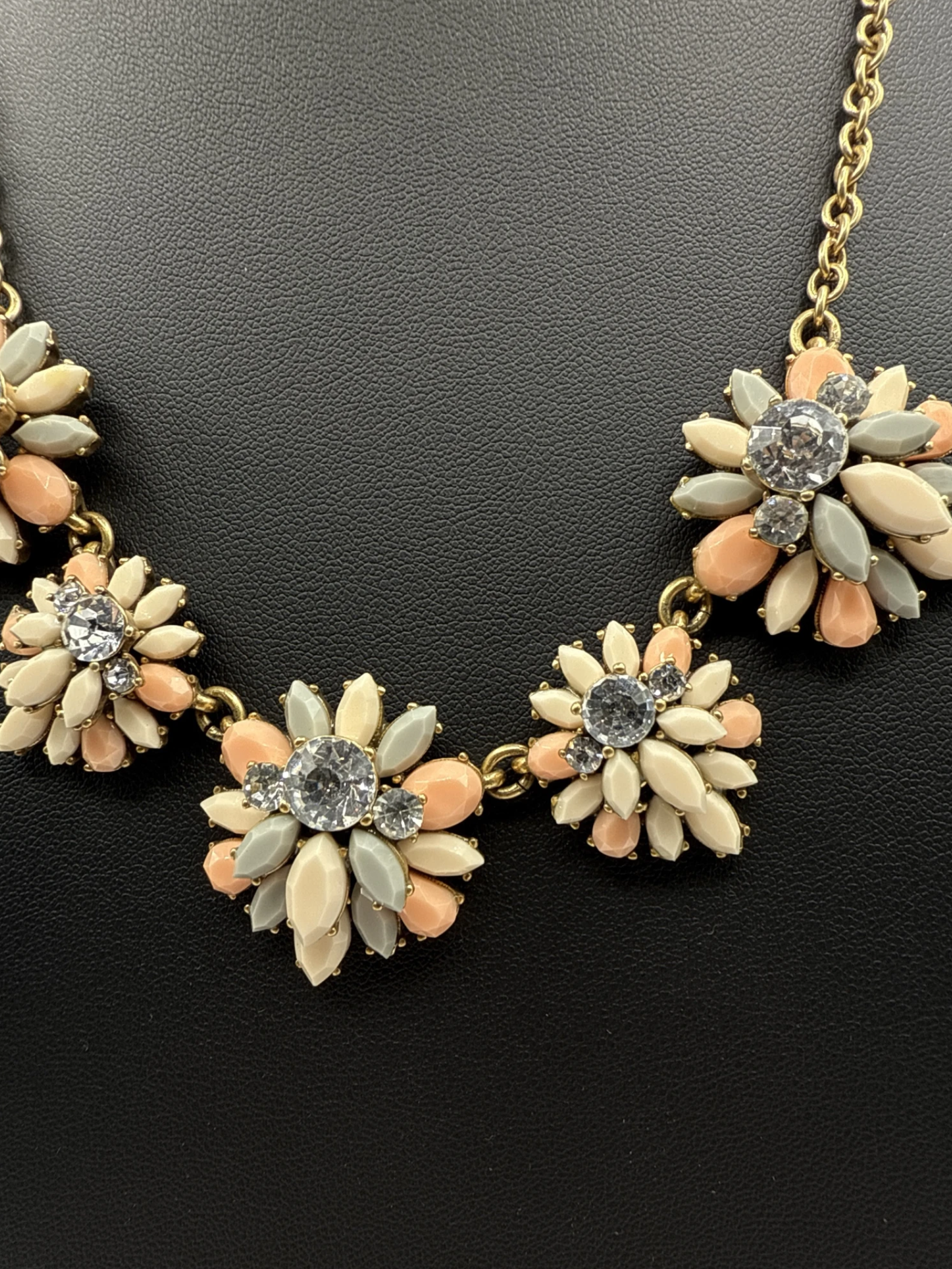 The J.Crew necklace has a gold-tone chain and a bold floral design. It consists of five flowers with pastel-colored petals in pink, gray, and cream, each featuring sparkling crystal accents at the center.