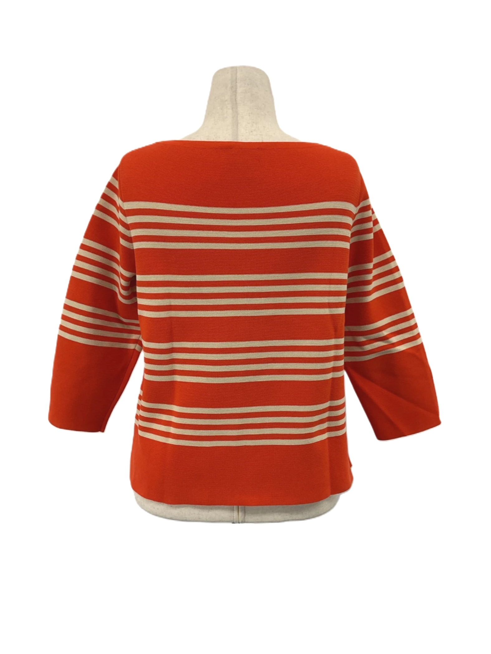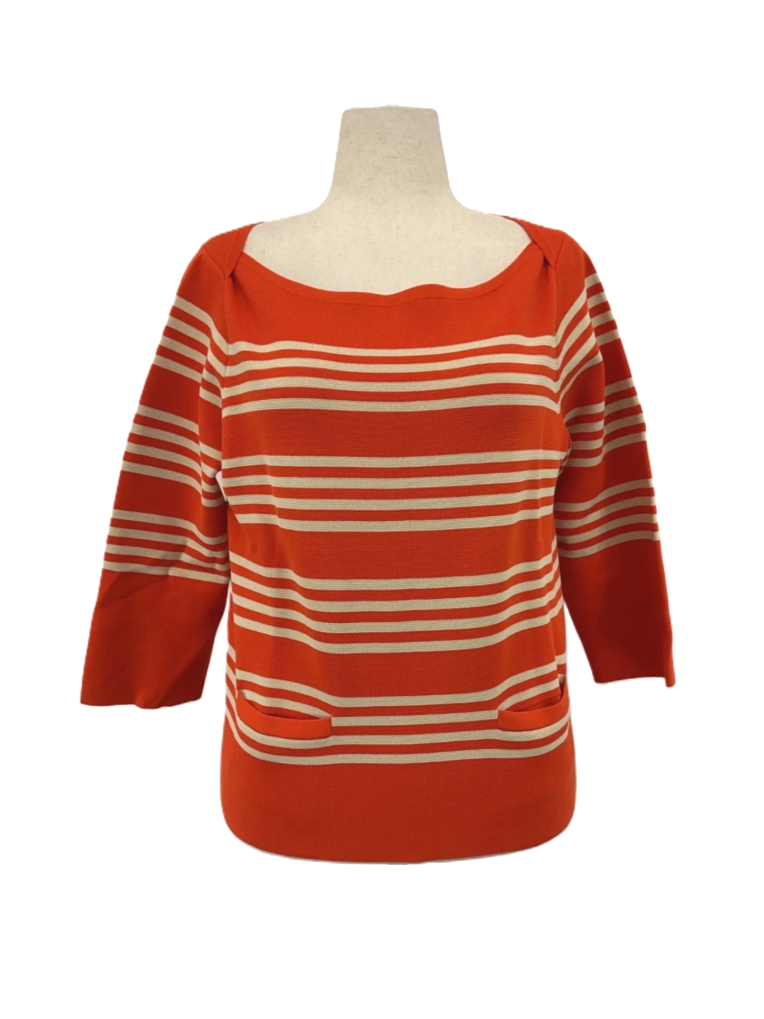 This J.CREW sweater, perfect for spring and fall, features a vibrant orange and white striped design. Made from a comfortable blend of cotton, nylon, and spandex, it offers a flattering fit with a classic round neckline and three-quarter sleeves. The sweater includes two front pockets adding functionality and style. Ideal for casual wear, this pre-owned sweater is in excellent condition and is a stylish addition to any wardrobe.