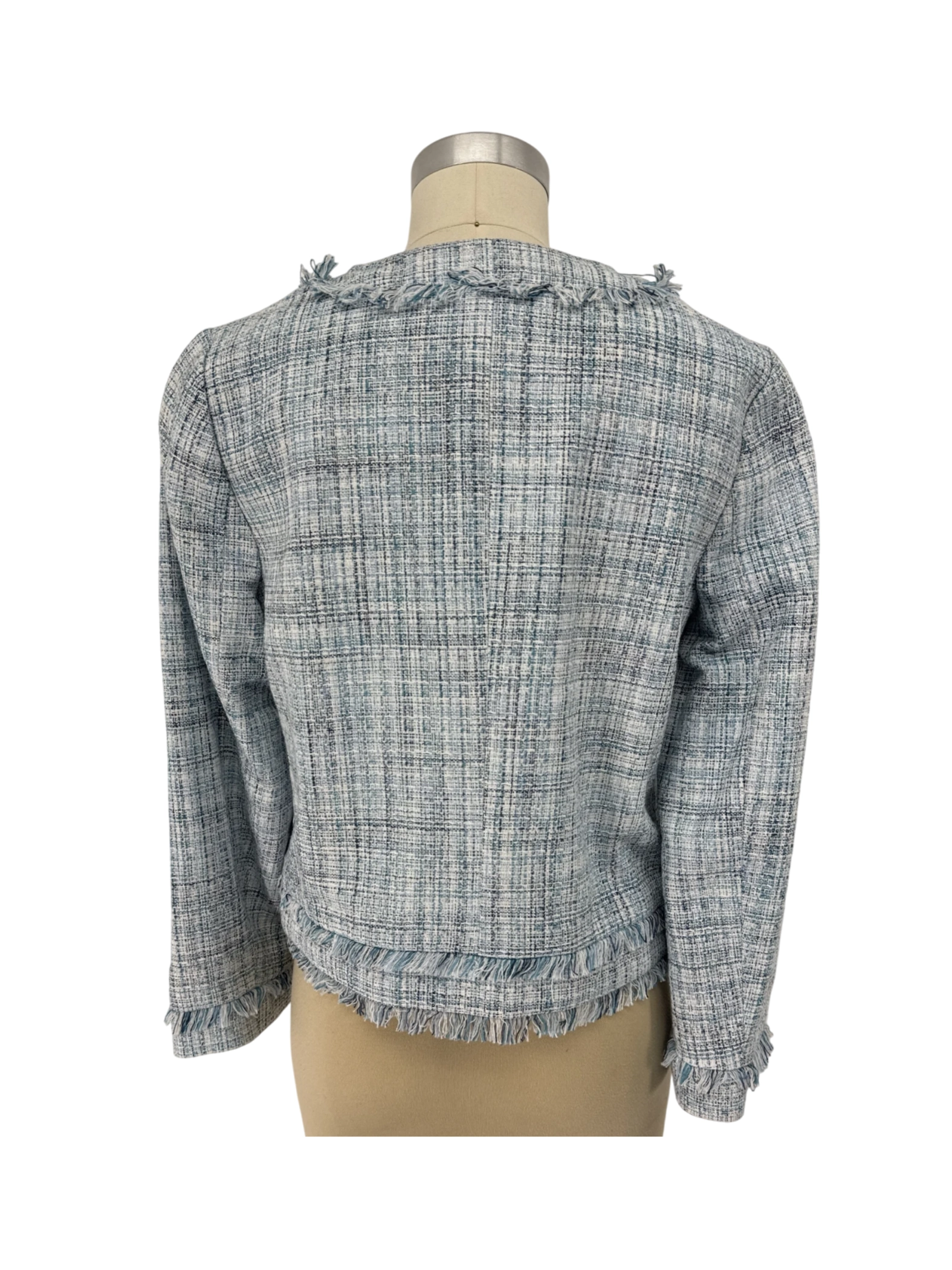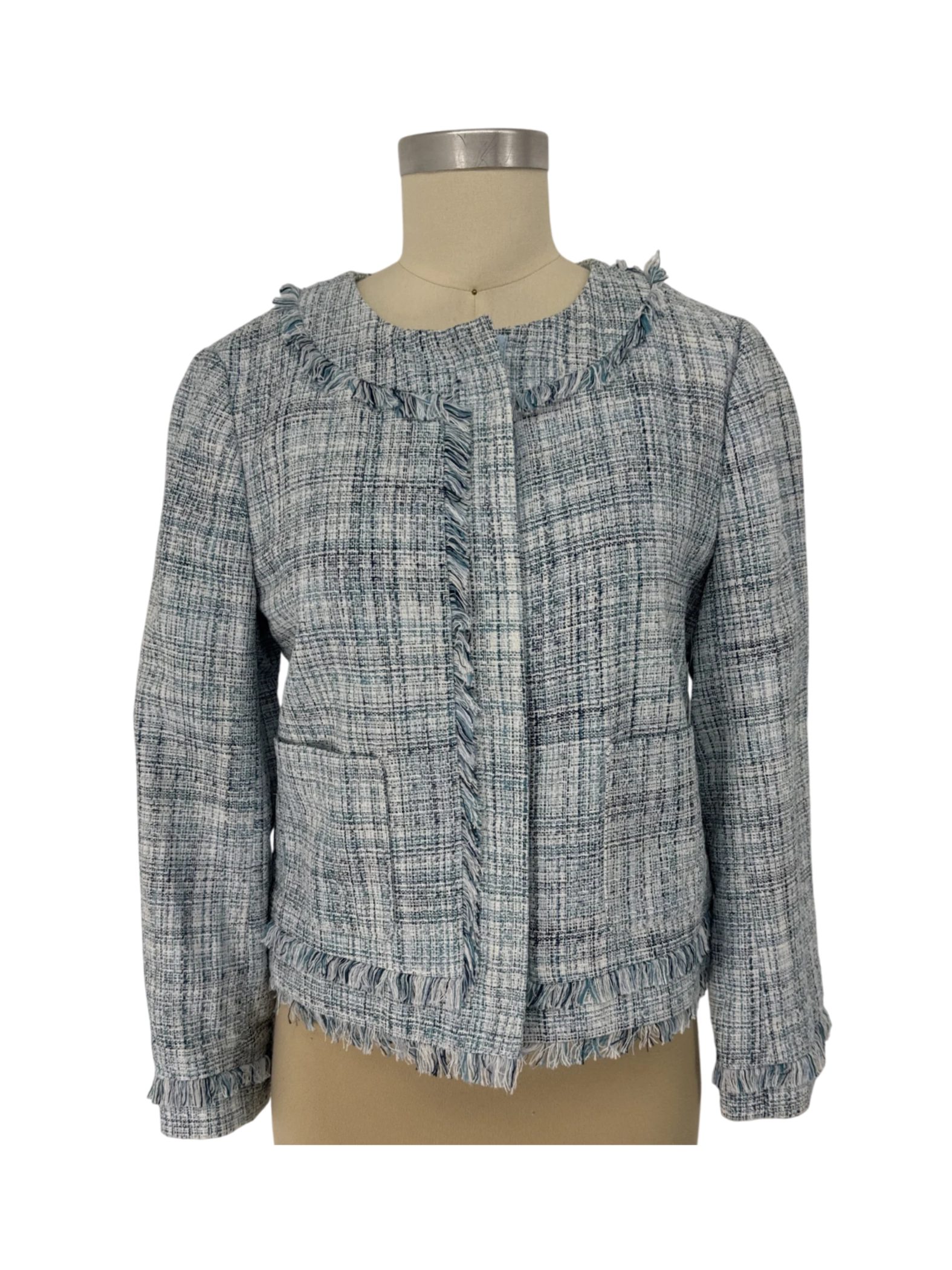 Elevate your wardrobe with this pre-owned J.CREW tweed blazer. This stylish jacket features a classic design with a flattering fit, perfect for both casual and professional settings. Crafted from a comfortable cotton blend, the blazer adds a touch of elegance with its textured tweed fabric and subtle fringe detailing. Pair it with your favorite jeans for a chic daytime look, or dress it up with a skirt or trousers for a polished evening outfit.