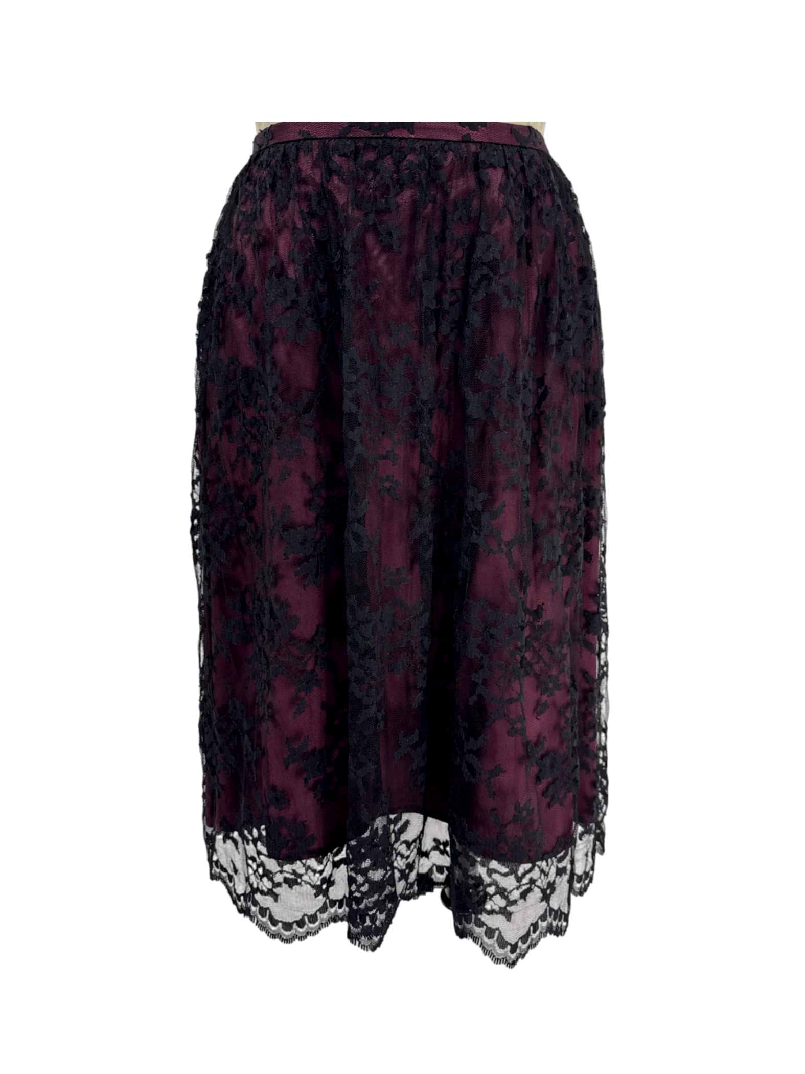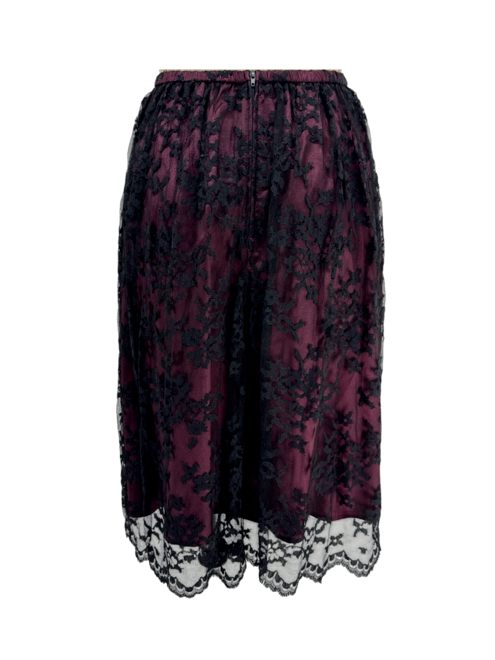 This pre-owned JESSICA HOWARD skirt is a stunning piece featuring a beautiful combination of black lace overlay and a rich burgundy lining. The A-line silhouette flatters any figure, while the midi length adds a touch of elegance. Made from a blend of nylon, rayon, and acetate, this skirt is both comfortable and stylish. Perfect for fall or winter, this skirt is a versatile addition to any wardrobe.