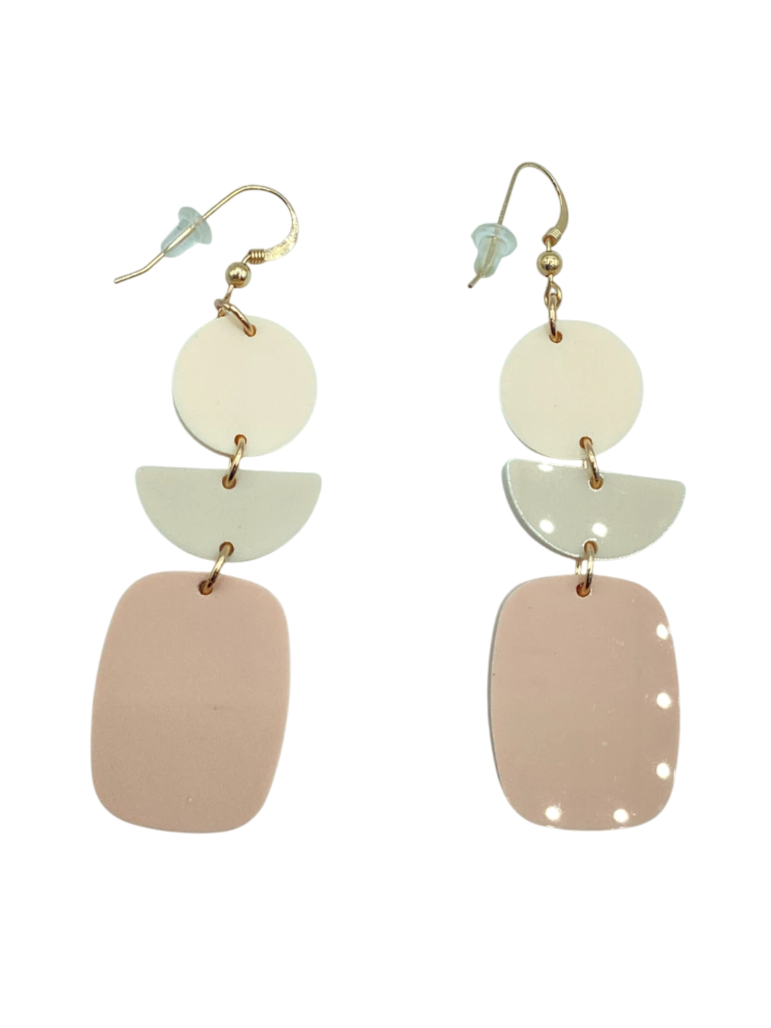 The earrings are made up of a circle, a half-circle, and a rounded rectangle, connected by small gold-toned rings. The color scheme consists of off-white, pale green, and a muted pink, with subtle white dots on the pink rectangle. The ear wires are gold-toned and come with clear plastic stop