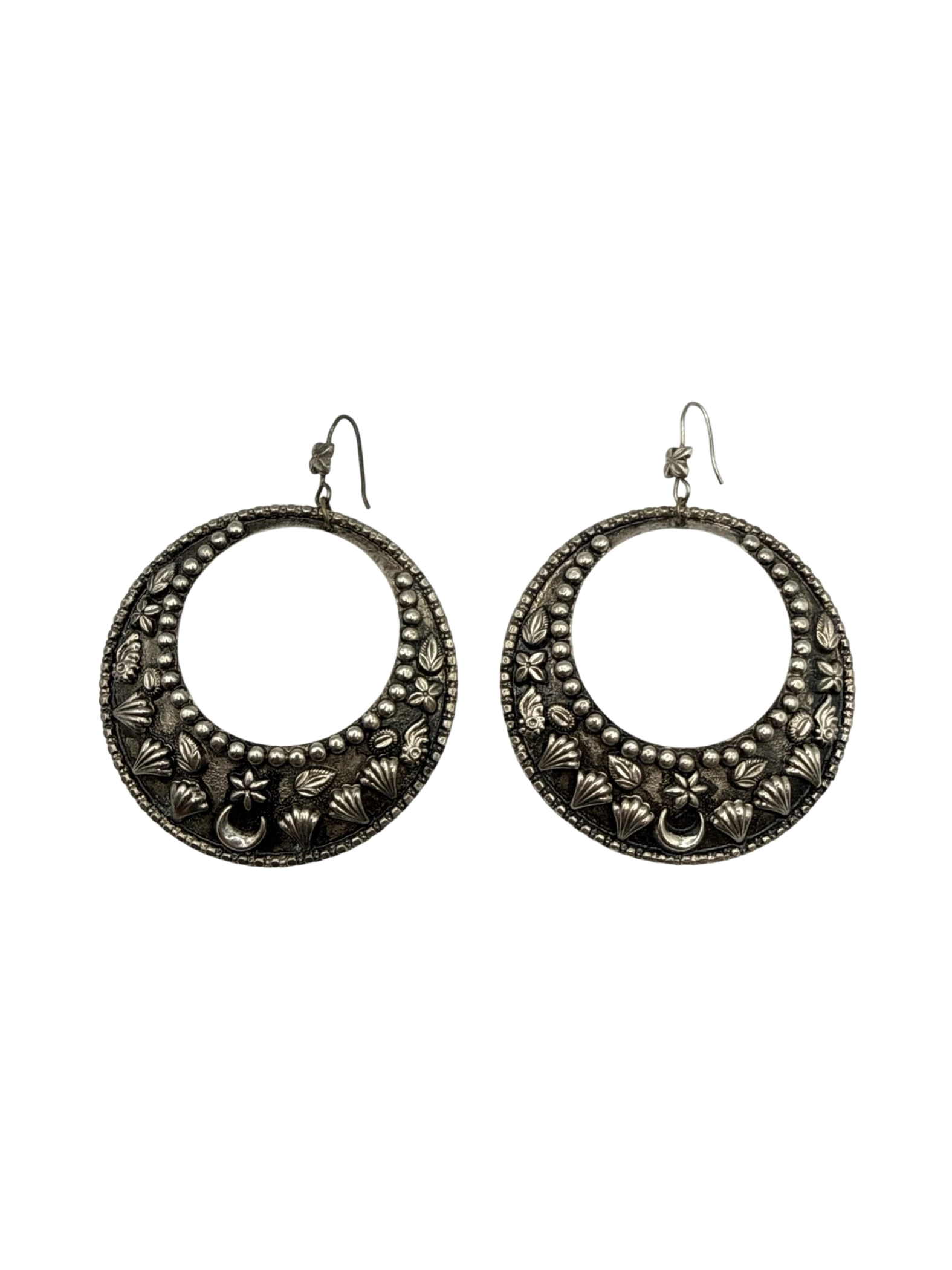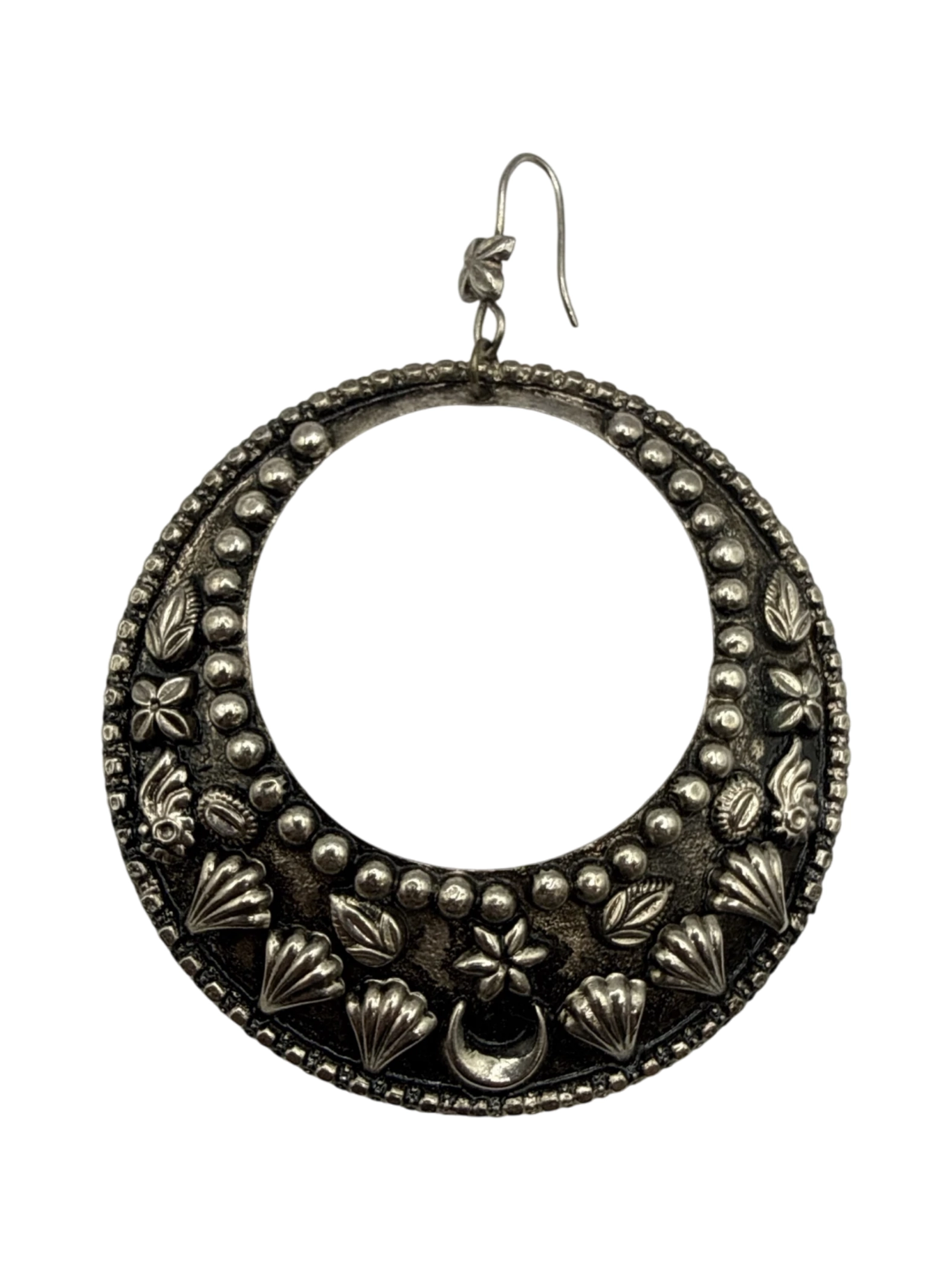 These stunning vintage silver hoop earrings are a perfect statement piece. Featuring intricate floral and geometric designs around the outer rim, and a classic drop style. These earrings are sure to complement any outfit. These earrings are in excellent condition and add a touch of elegance and sophistication to any look.