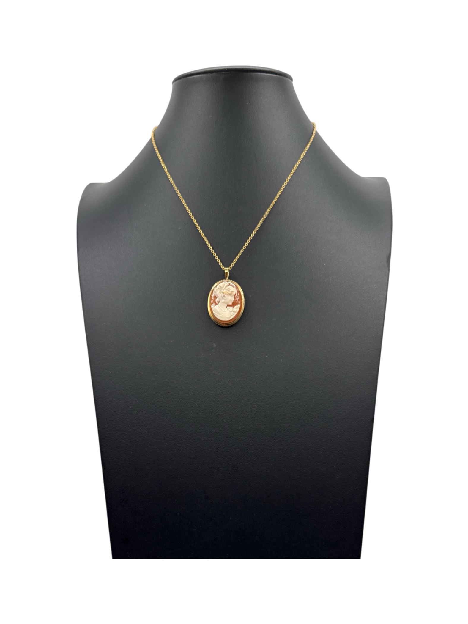 Elegant and timeless, this pre-owned gold necklace features a classic cameo pendant. The gold chain complements the intricate details of the cameo, making it a beautiful accessory for any occasion. This necklace is a perfect addition to your jewelry collection, adding a touch of vintage charm and sophistication to your style. A perfect gift for someone special.