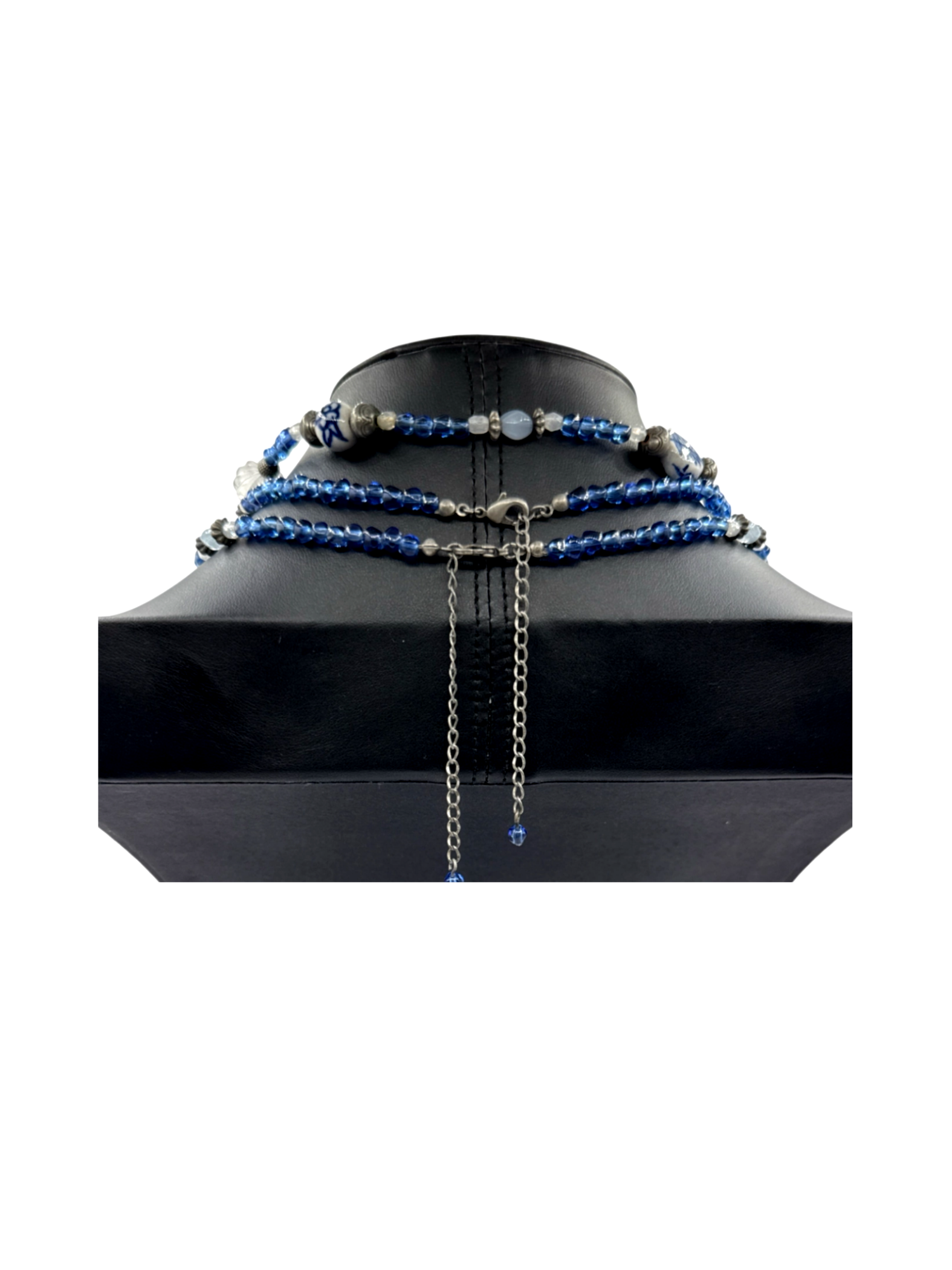 This beautiful pre-owned necklace is a unique piece that makes a statement. The intricate design and blue and white color combination add a touch of elegance to any outfit. The necklace is perfect for any woman who wants to add a special touch to her jewelry collection. This pendant necklace will be an eye-catcher! This necklace is a perfect gift for yourself or a loved one!