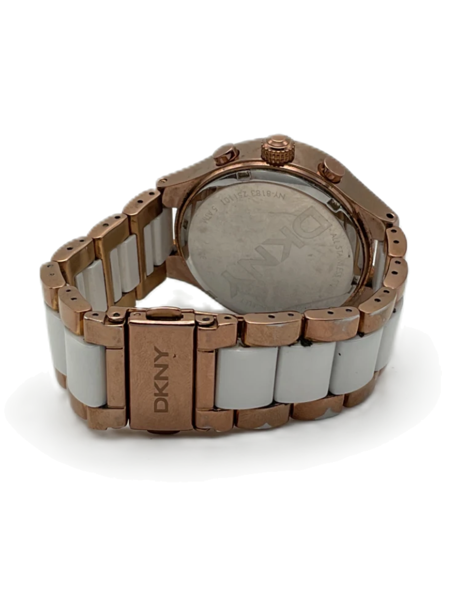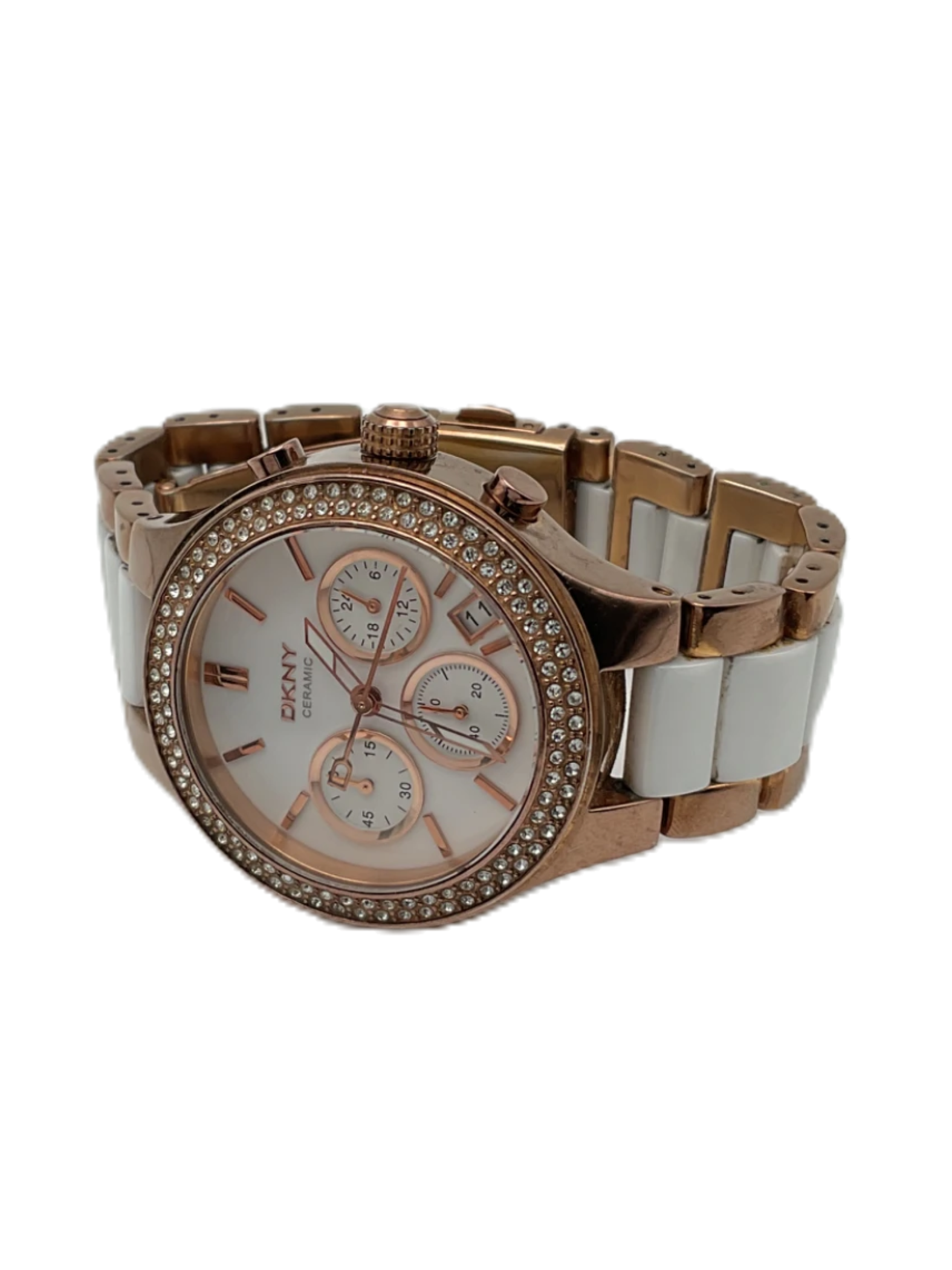 A women's DKNY Chambers ceramic watch in white and rose gold.