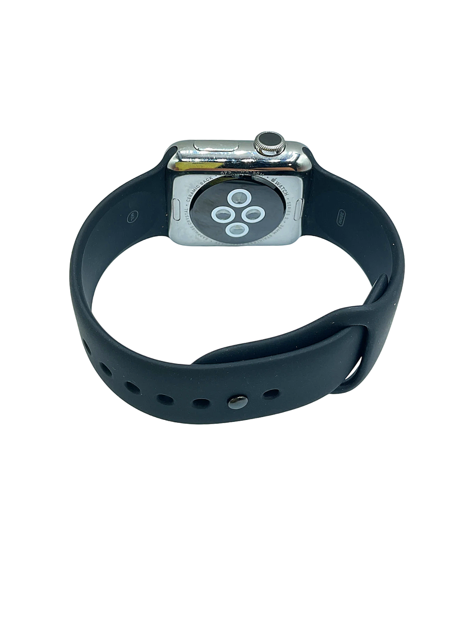 This is a photo of a silver Apple Watch, which is most likely a Series 4 based on its design, paired with a black sports band. The Apple Watch is a versatile smartwatch known for its health tracking, connectivity, and safety features. It enables users to make calls, send messages, monitor fitness, and more.