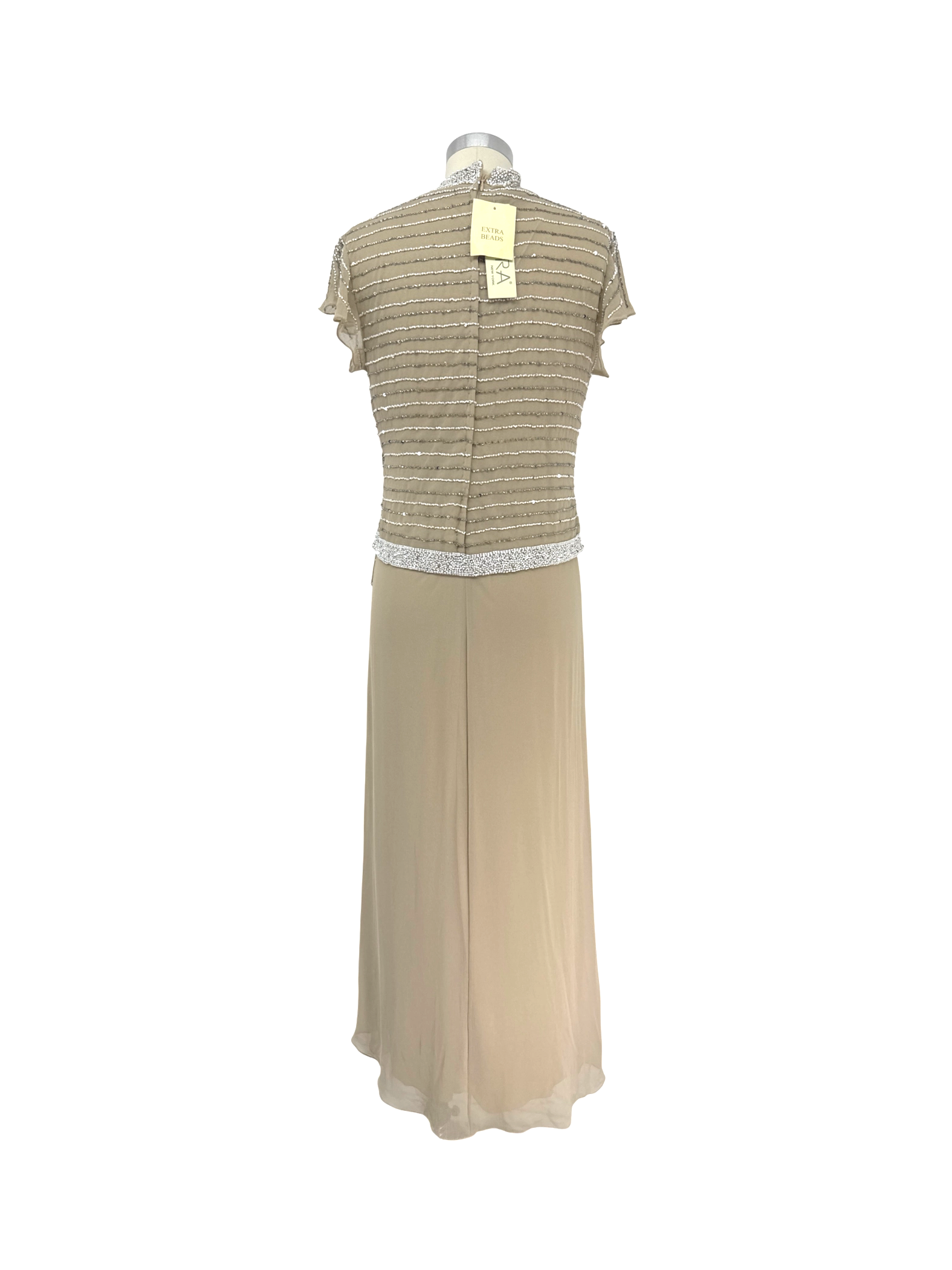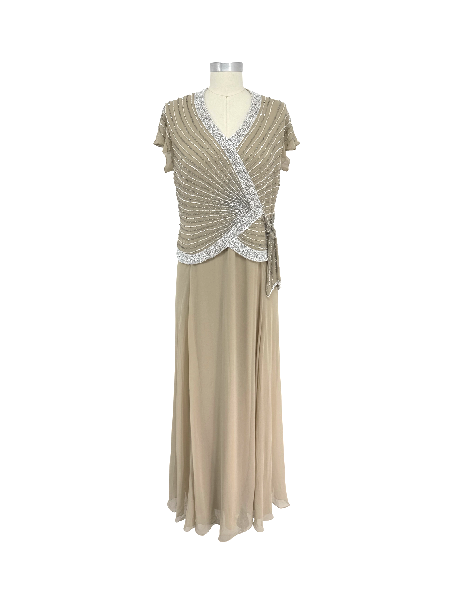 Elegant JKARA formal dress, perfect for special occasions. This pre-owned maxi dress features a V-neckline and short sleeves. The dress is made of 100% polyester with a beautiful sequin detailed top. Ideal for fall events, this dress offers a touch of sophistication and timeless style. The dress is in excellent condition and ready to make a statement.
