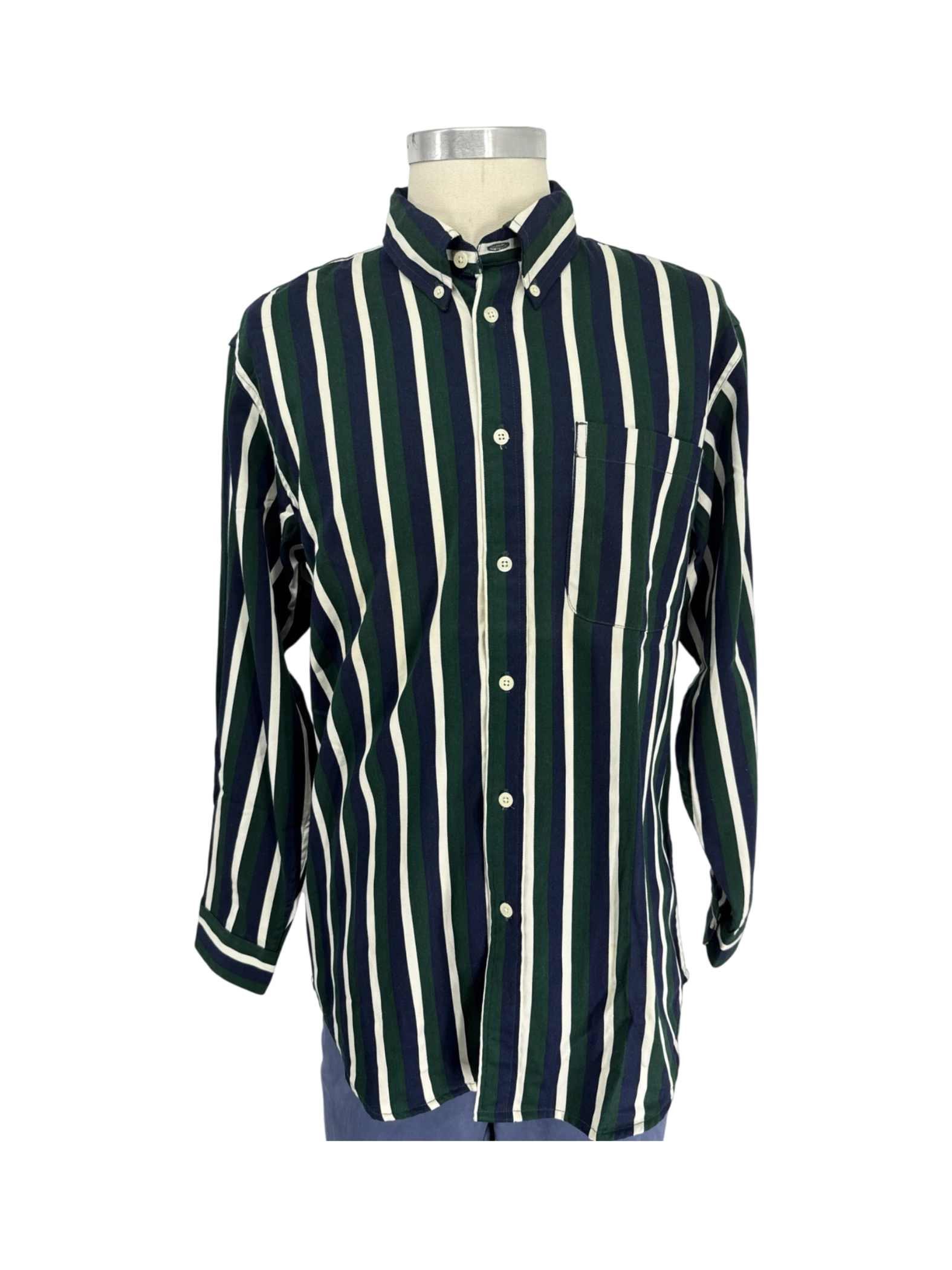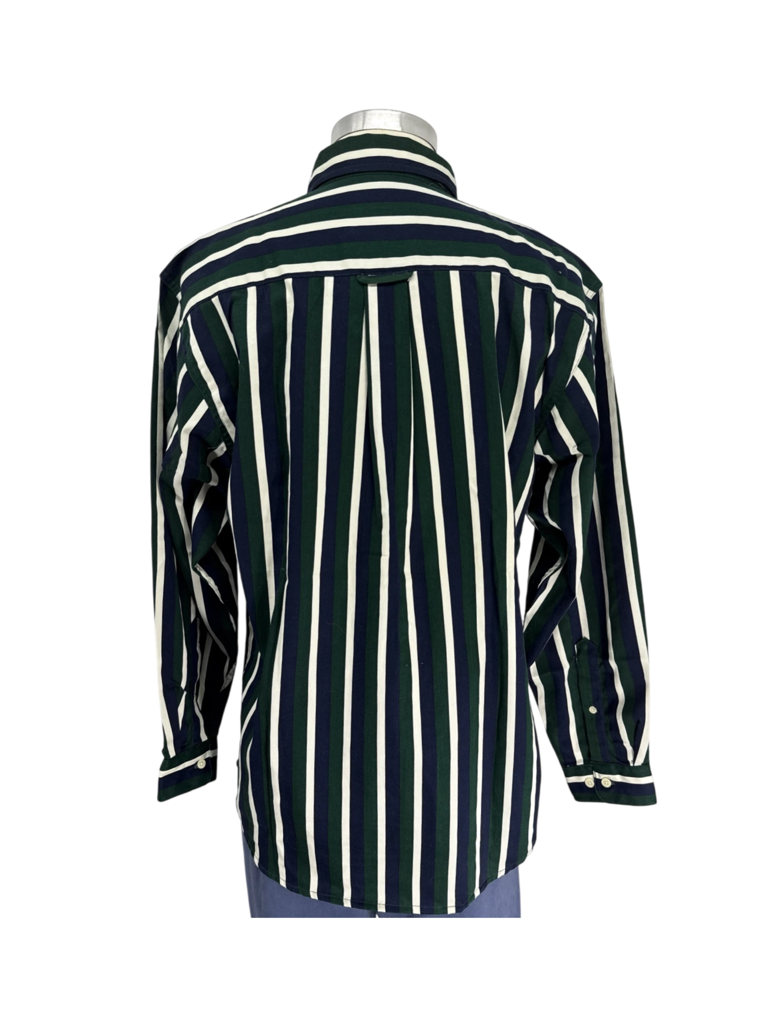 Elevate your casual wardrobe with this stylish John Ashford Sport long sleeve shirt. Featuring a classic striped pattern in navy, green, and white, this pre-owned shirt is made from 100% cotton for ultimate comfort. The button-up closure and collared neckline add a touch of sophistication, making it perfect for any occasion. Ideal for spring, summer, or fall, this versatile piece combines style and comfort effortlessly.