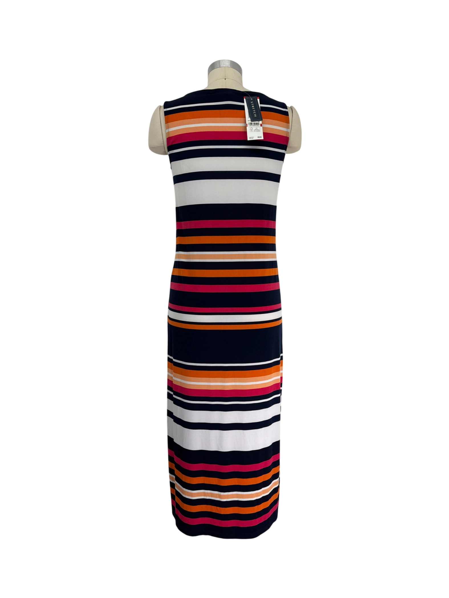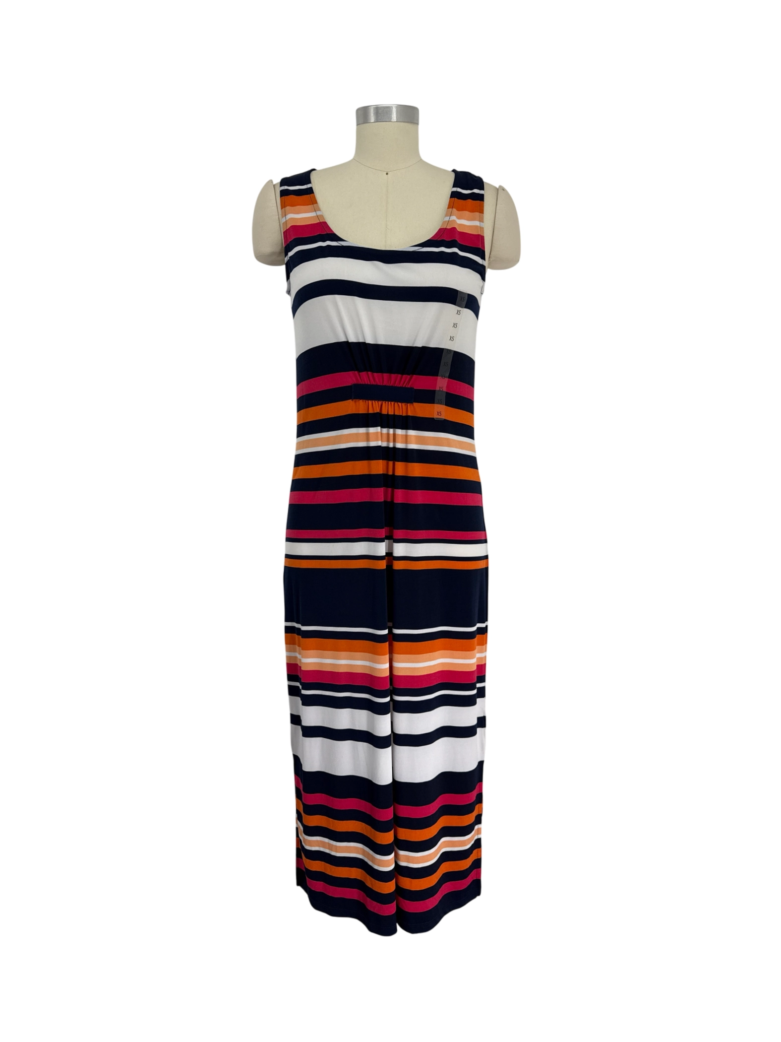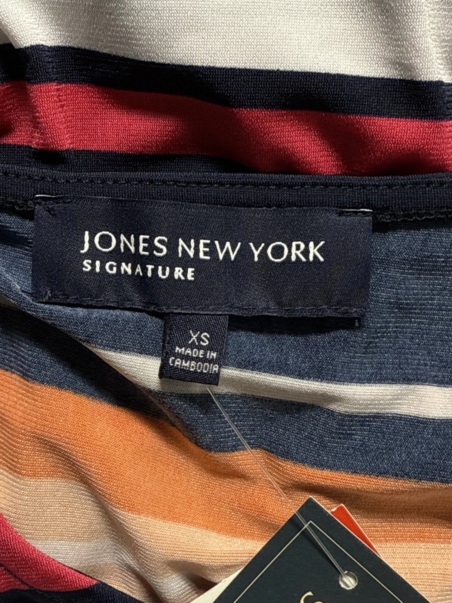 Embrace effortless style with this pre-owned JONES NEW YORK Signature dress! This vibrant midi dress features bold stripes and a flattering A-line silhouette, perfect for warm weather. Made from a comfortable polyester blend, it offers a comfortable fit and easy care. A chic and versatile addition to your wardrobe, ideal for everyday wear or casual outings. Gently used and ready for a new owner.