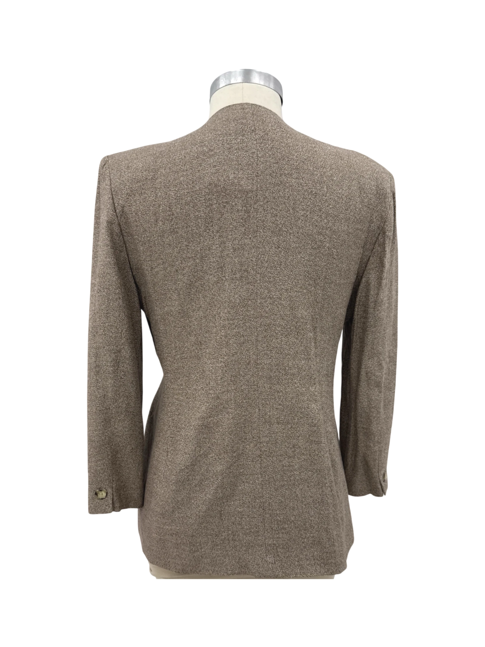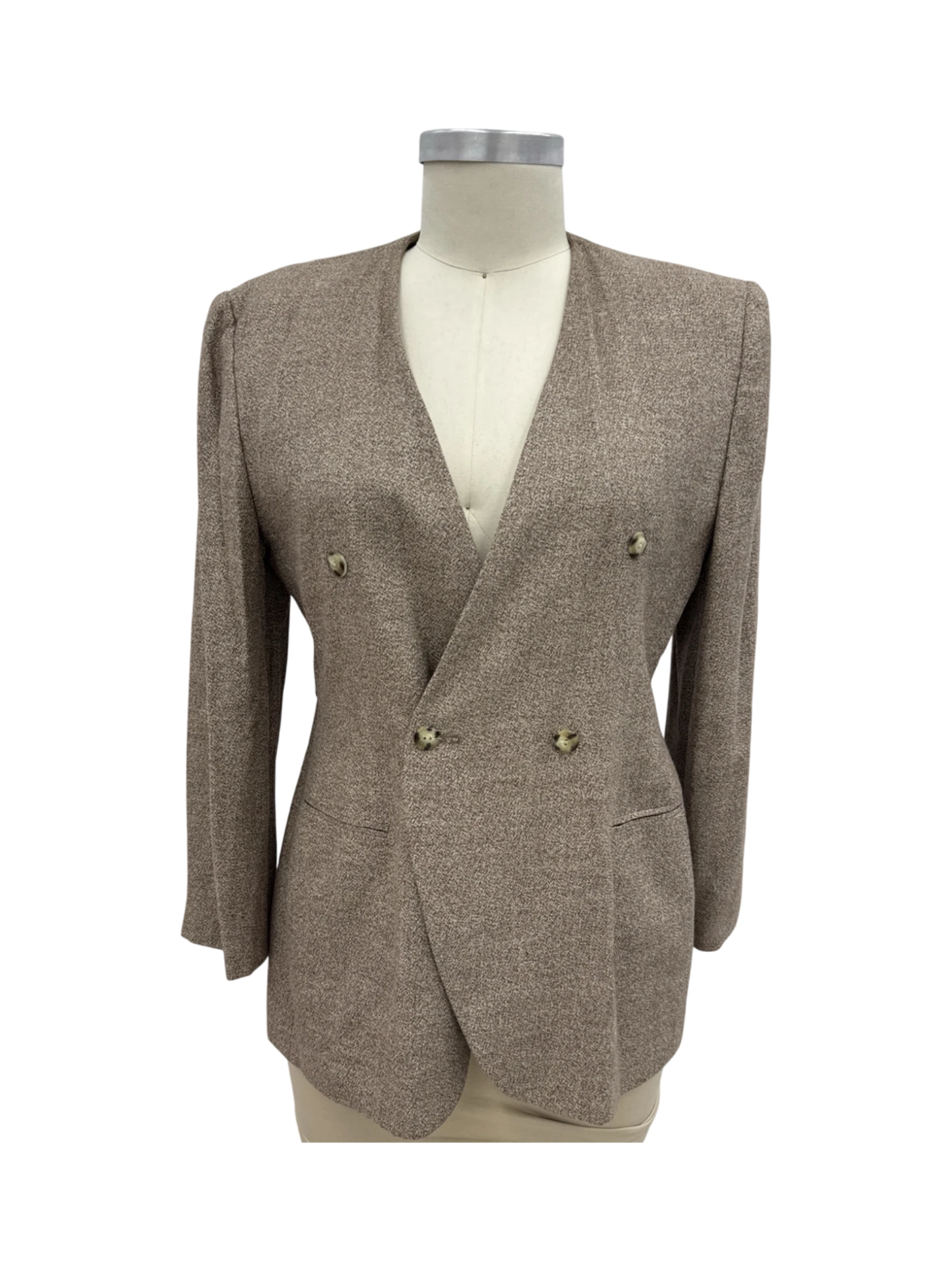 Elevate your wardrobe with this classic JONES NEW YORK blazer, a timeless piece perfect for any occasion. This pre-owned jacket, in a rich brown hue, is crafted from a comfortable blend of rayon and wool. The double-breasted design and tailored fit exude sophistication and style. Ideal for layering, this versatile blazer is perfect for creating polished looks during the fall and winter seasons, with the option for transitional wear into spring. This blazer is a pre-owned item, that shows some signs of wear