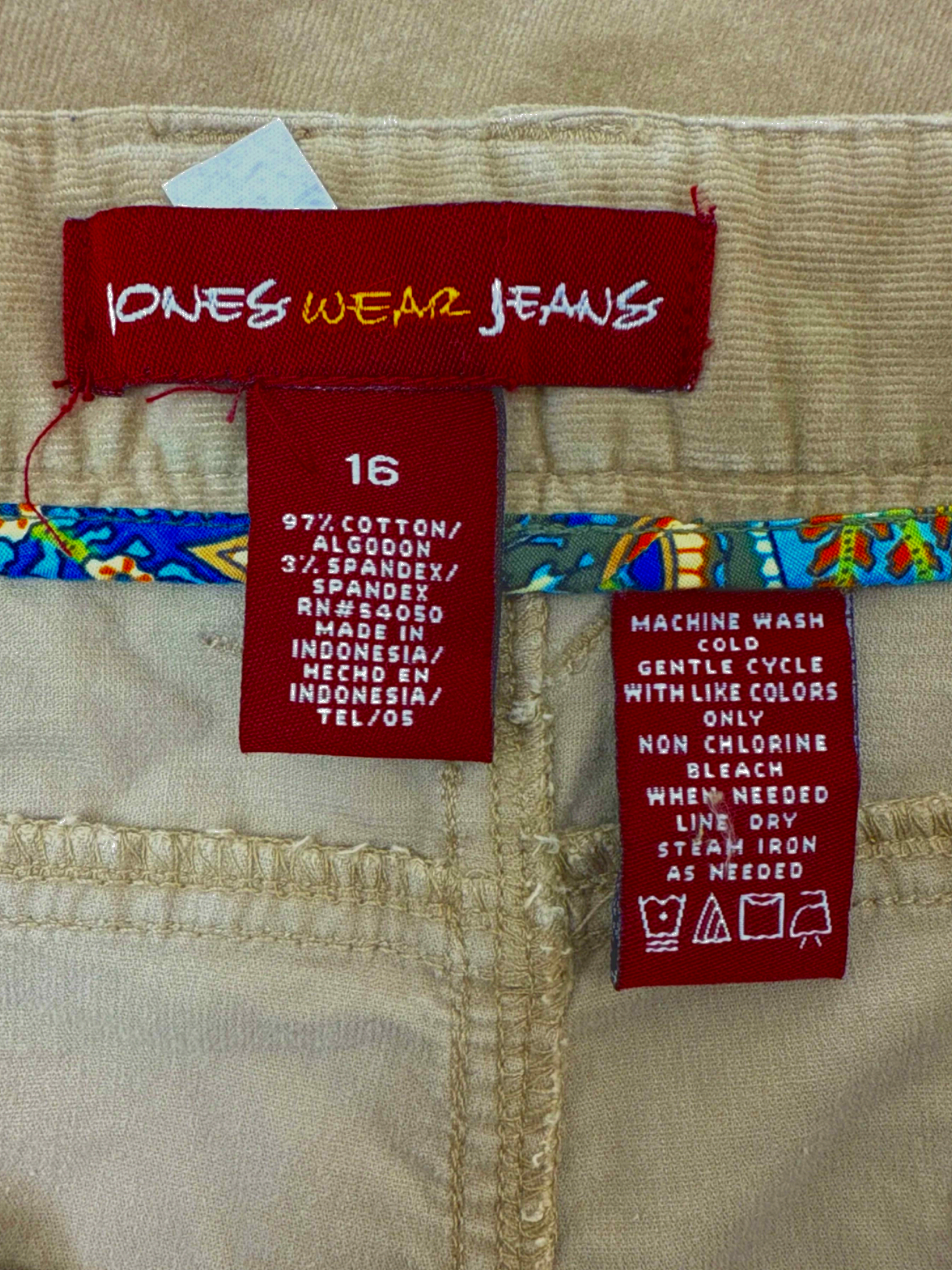 Elevate your wardrobe with these stylish Jones Wear Jeans corduroy pants, perfect for fall. Crafted from a comfortable cotton blend with a touch of spandex, these pants offer a classic straight-leg fit and a timeless khaki hue. They feature convenient zippered pockets. These pre-owned pants combine style and comfort, making them a versatile addition to any closet.