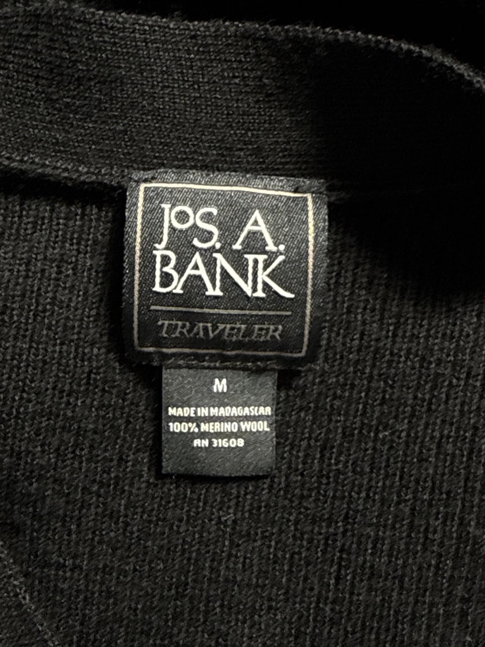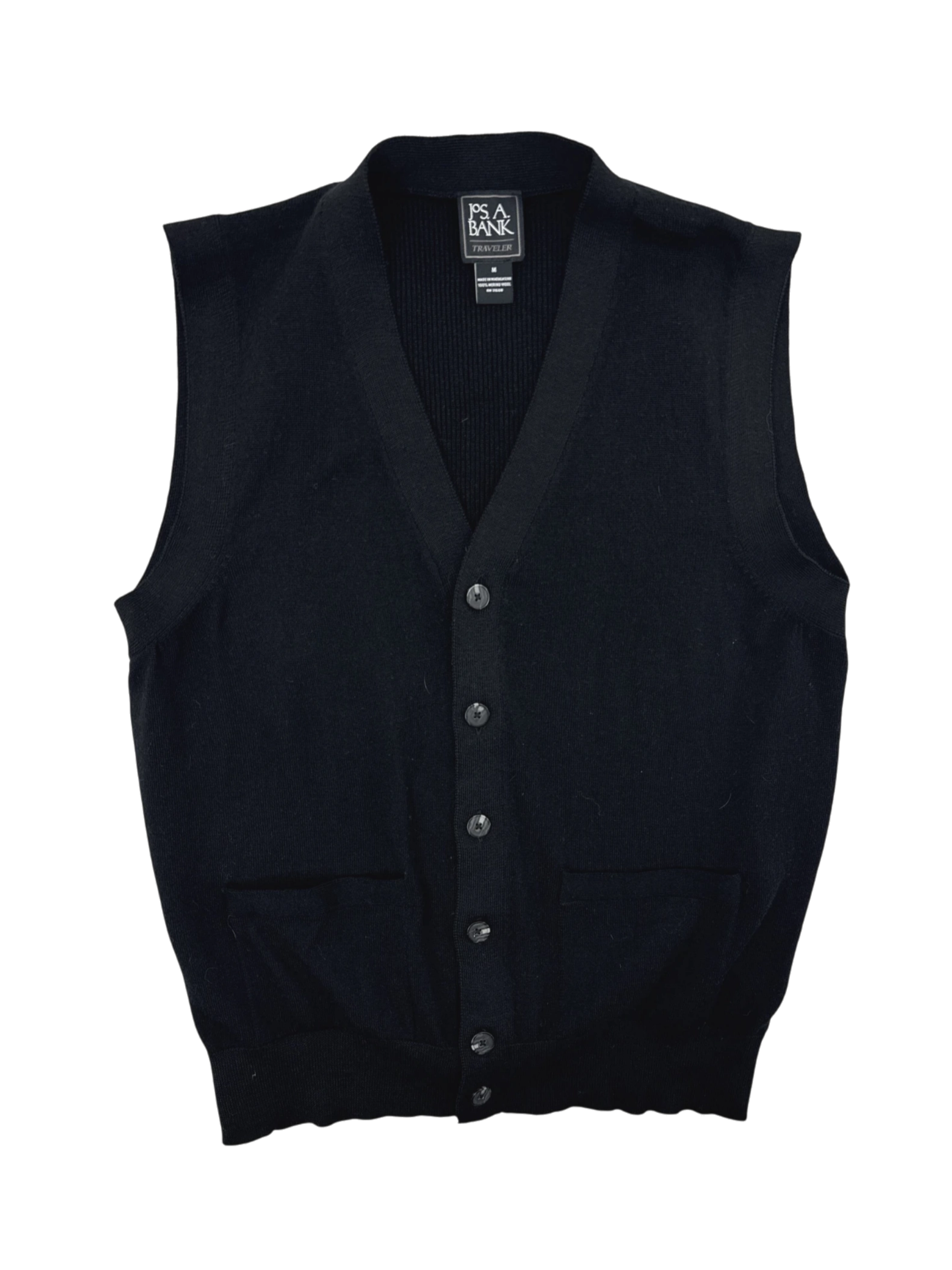 This pre-owned Jos. A. Bank Traveler vest is a stylish addition to any wardrobe. Crafted from 100% merino wool, it offers both comfort and warmth. The classic black color makes it versatile for various outfits. Featuring a button-down front and pockets, it's perfect for layering. Ideal for the cooler months, this vest blends quality and timeless design, making it a great choice for casual or semi-formal wear.