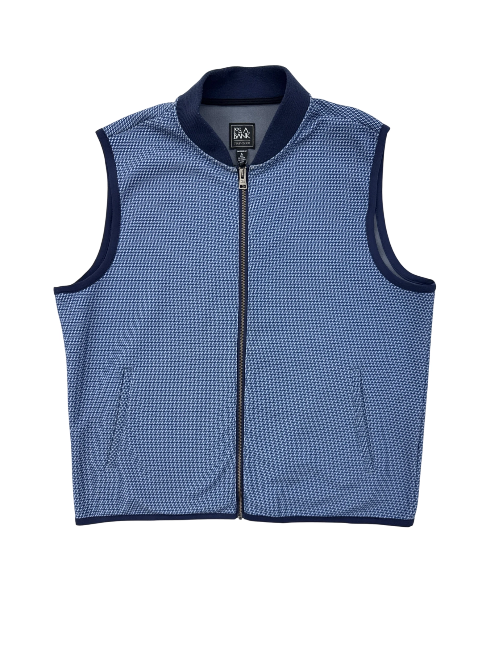 This pre-owned Jos. A. Bank Traveler vest is a stylish and versatile addition to any wardrobe. Crafted from a blend of polyester and spandex, this vest offers a comfortable fit and a modern look. The blue color and unique pattern make it easy to pair with various outfits. The vest is perfect for layering and can be worn during spring and fall. A great deal for a high-quality vest.