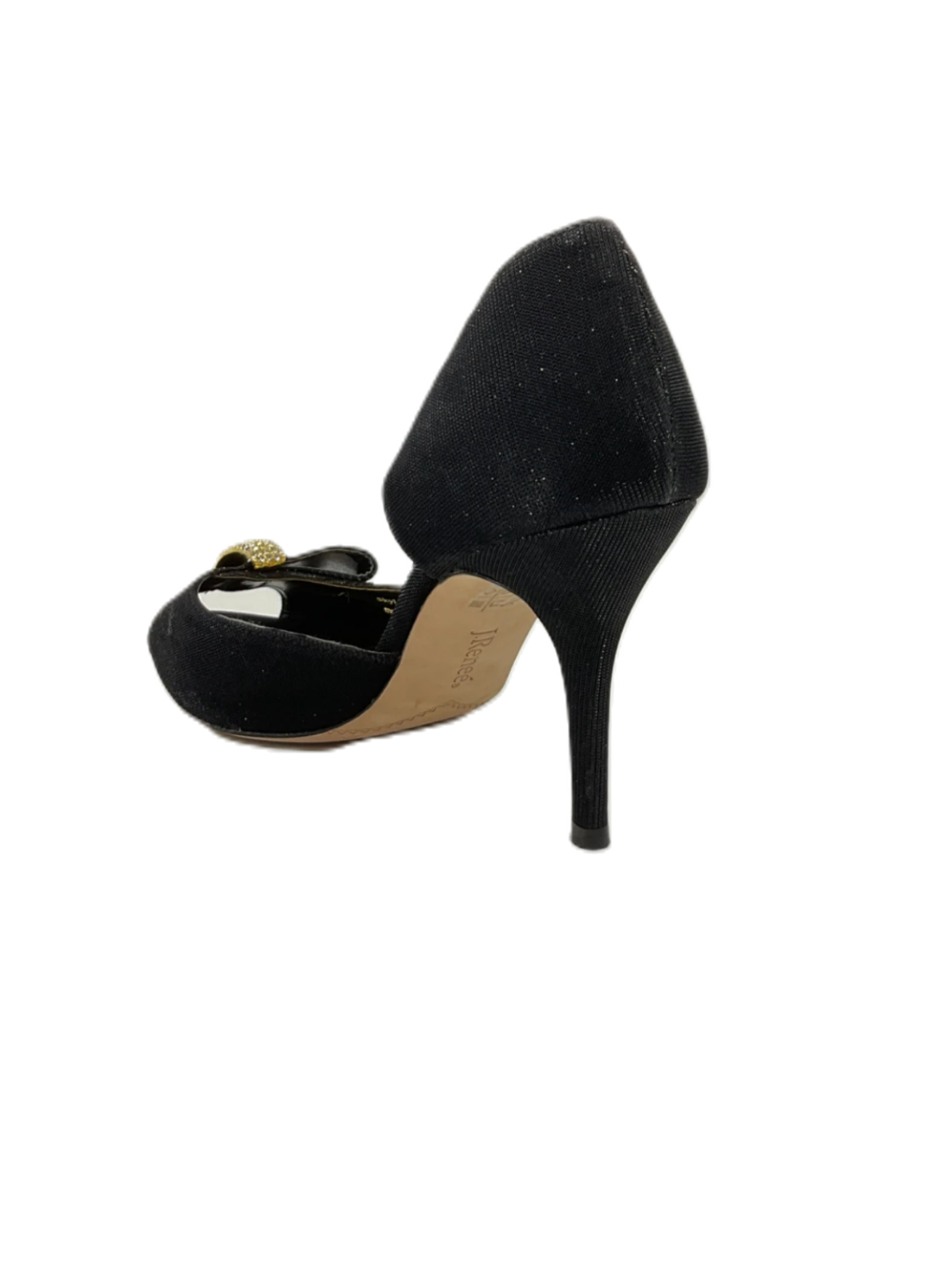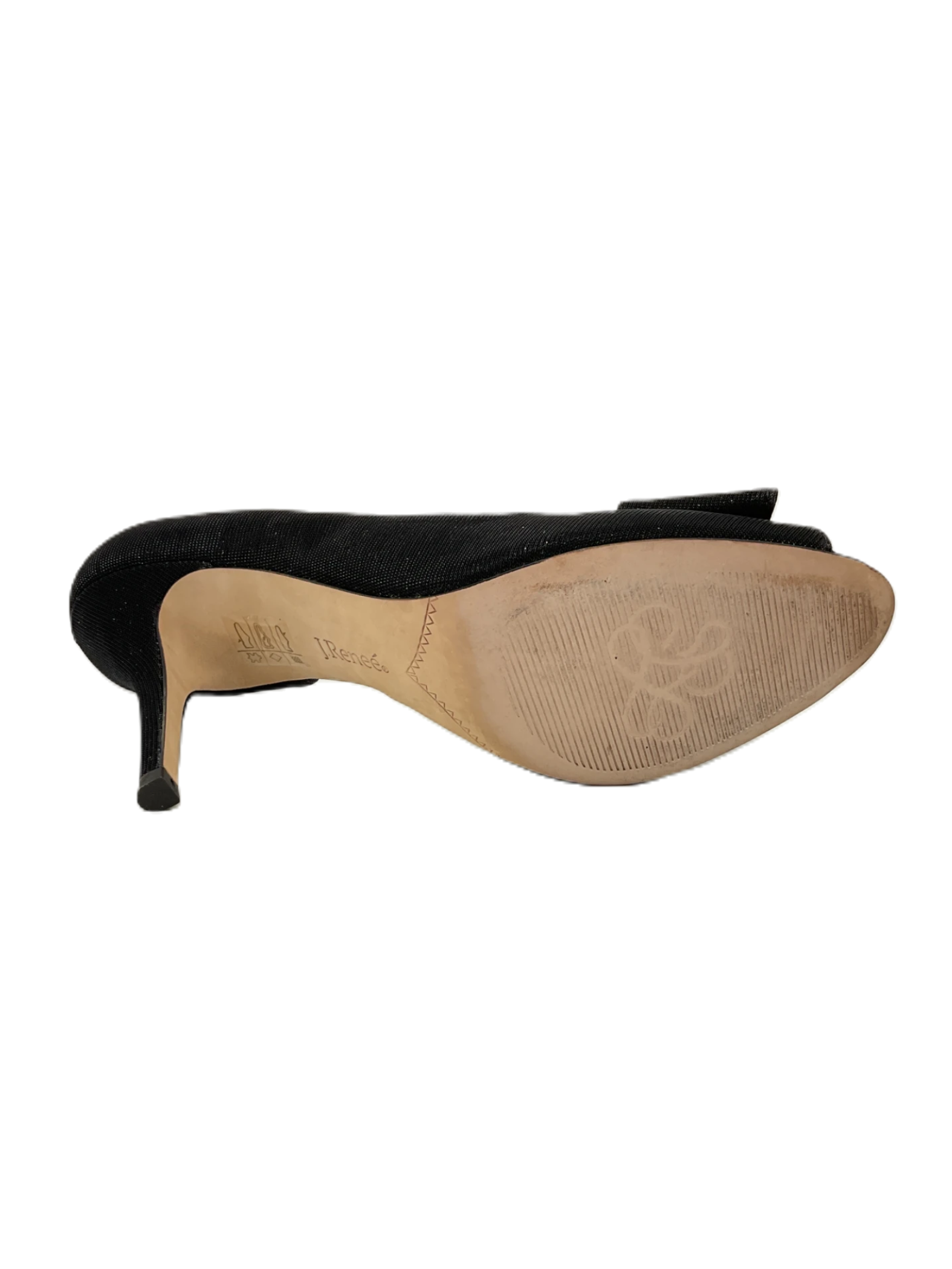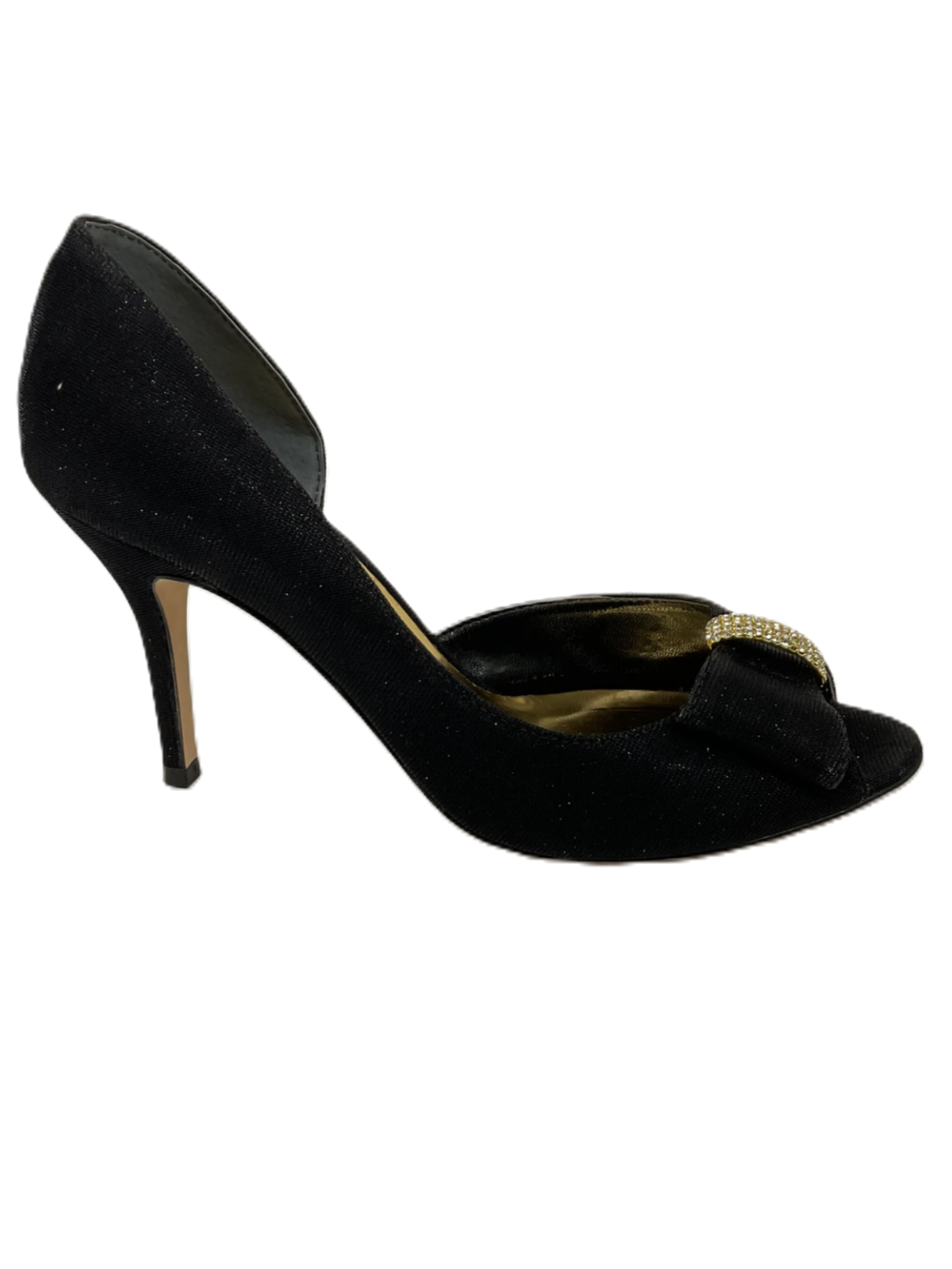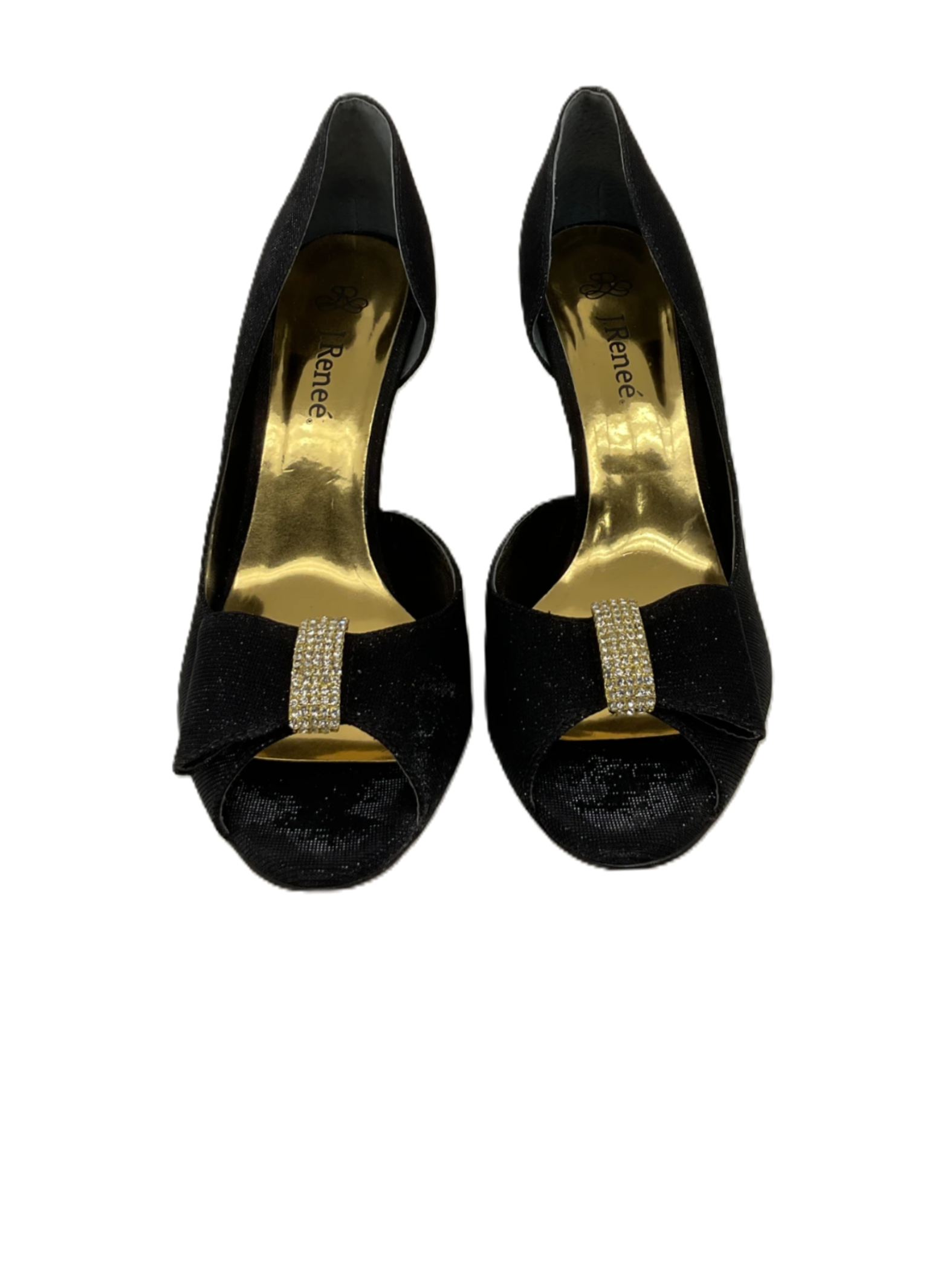 The shoe is a J.Renee Skylar Black Glitter Peep-toe pump in size 10M.