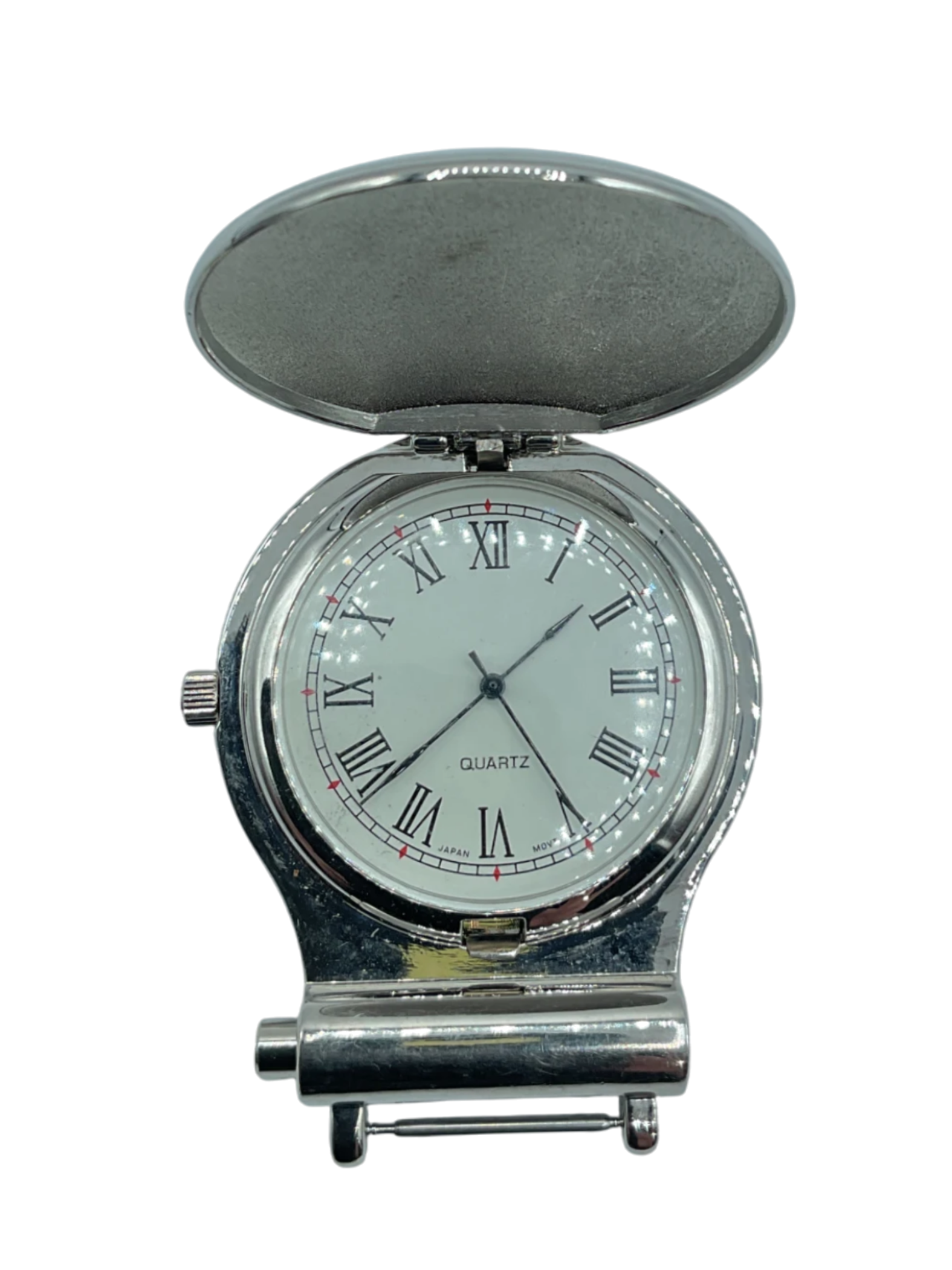 A silver-colored watch back case, with the initials "JSR" engraved in a traditional font. Displaying the engraving detail and the smooth, curved shape of the piece.