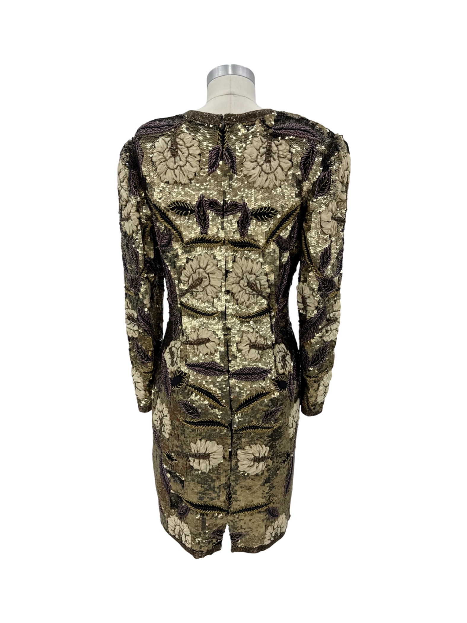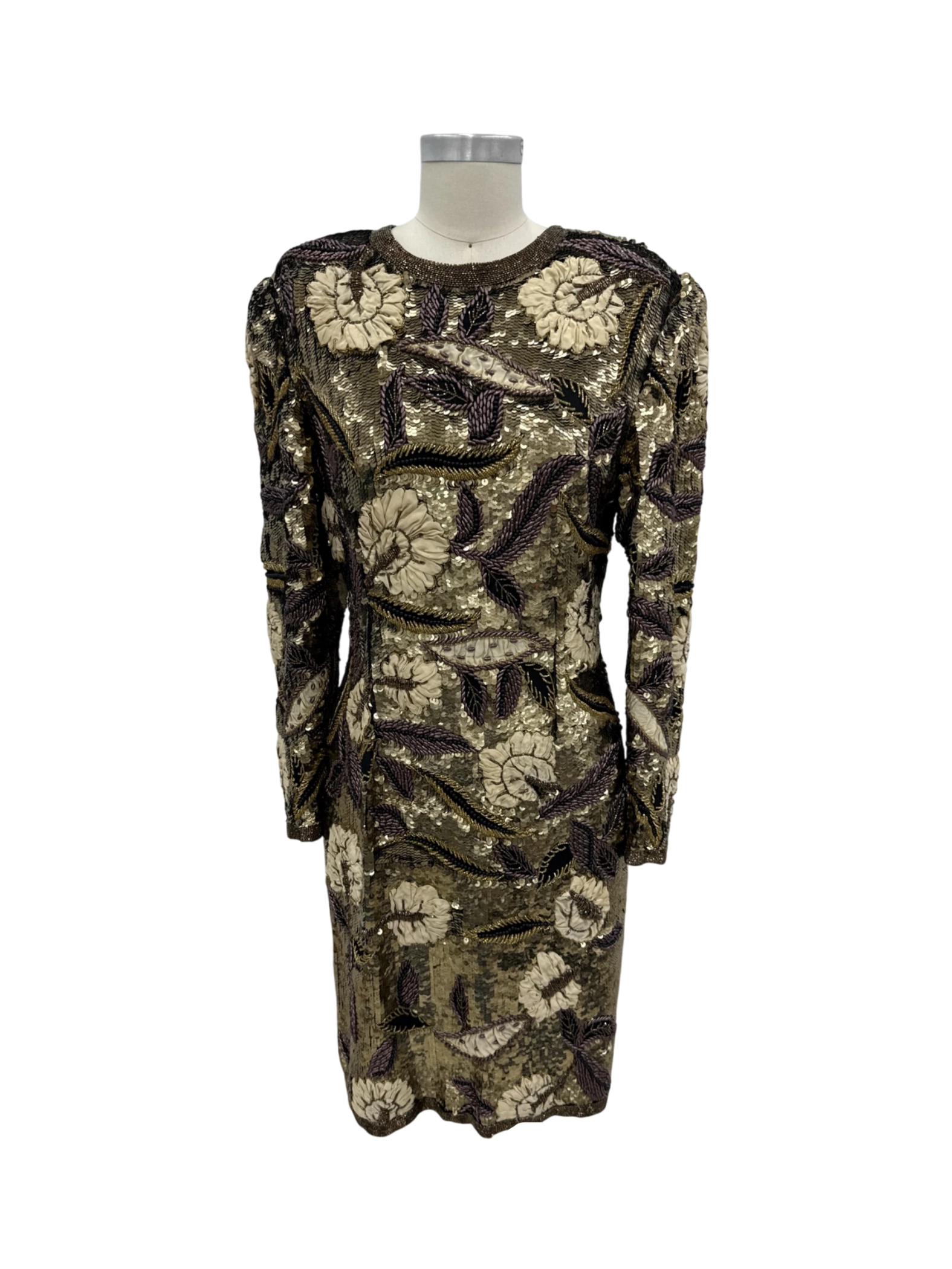 Vintage 80 - Vintage Judith Ann Creations silk cocktail dress featuring an exquisite floral sequin design. The dress showcases a flattering sheath silhouette with long sleeves and a round neckline. This piece is perfect for a special occasion, exuding vintage charm and elegance. Made in India. Elevate your wardrobe with this timeless, pre-loved dress and make a statement at your next event.