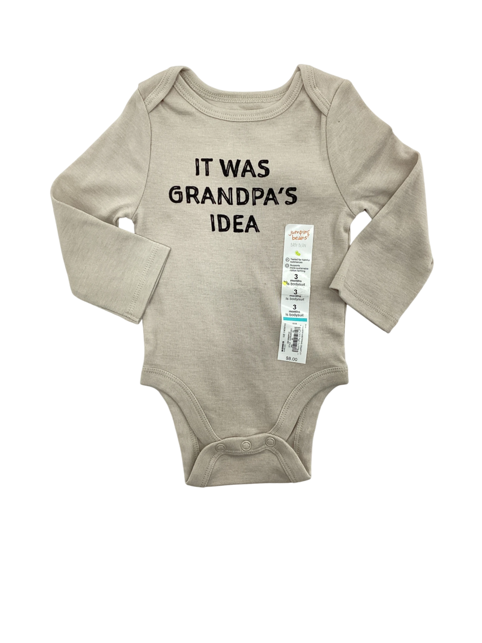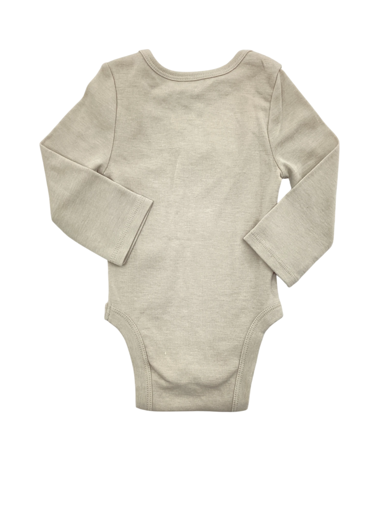 A beige-colored long-sleeve onesie for 3-month-old babies by Jumping Beans with a round neckline.