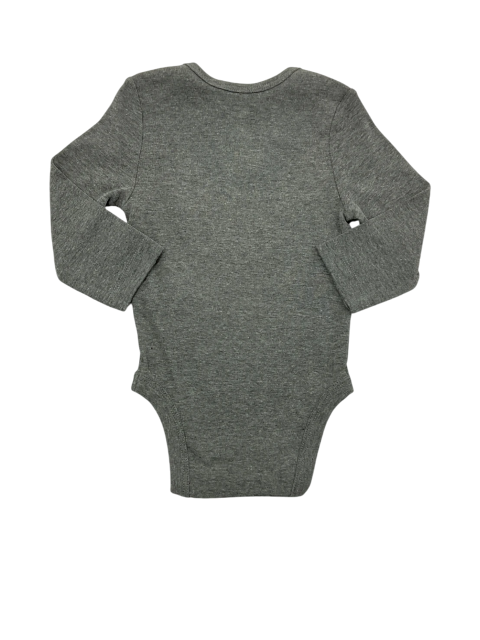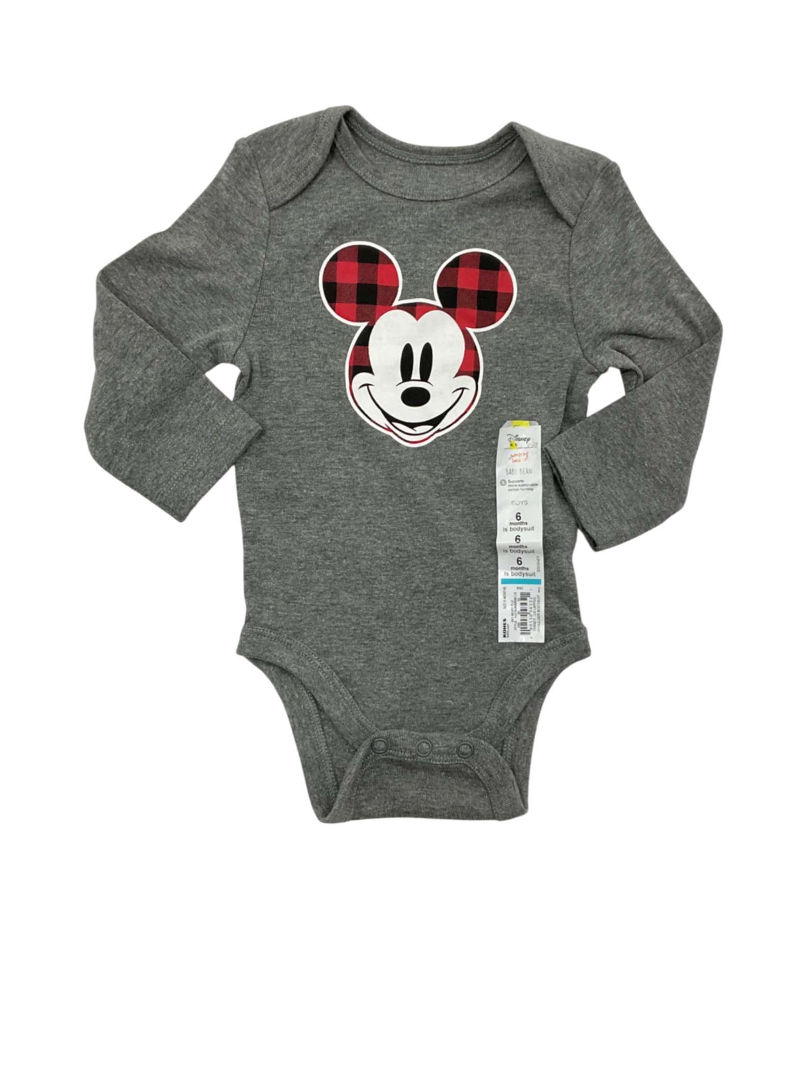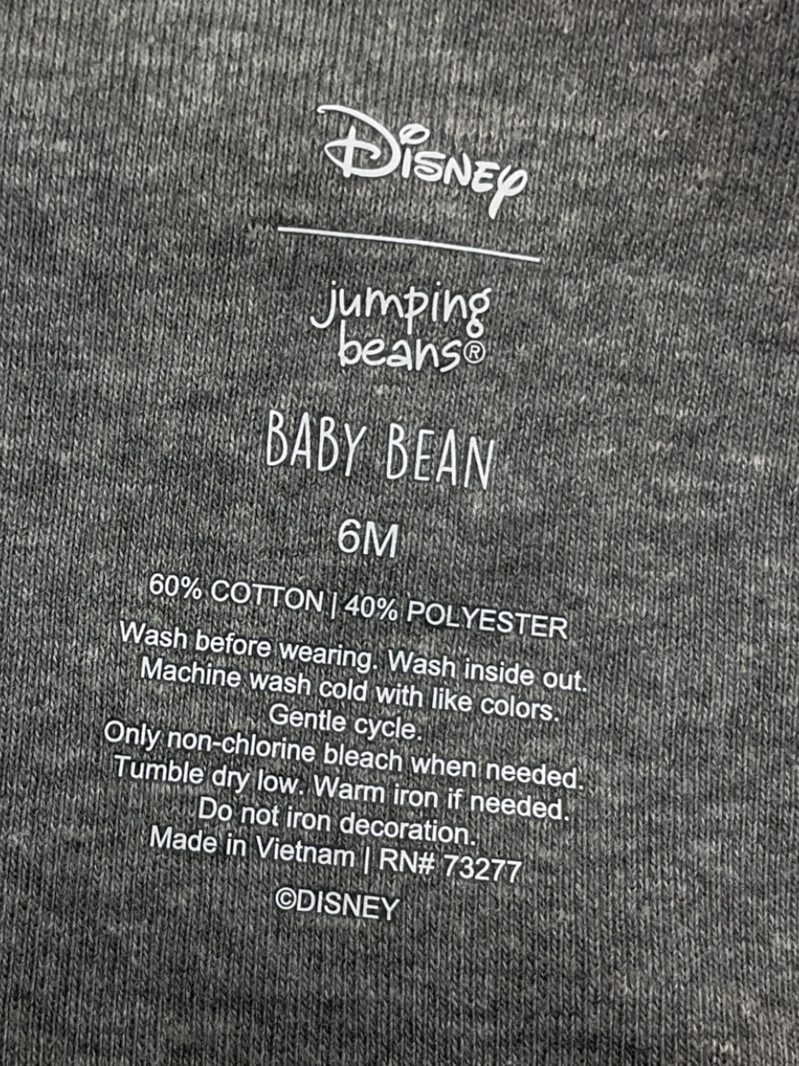 A grey baby onesie with a Disney print, long sleeves, and a button closure at the crotch.